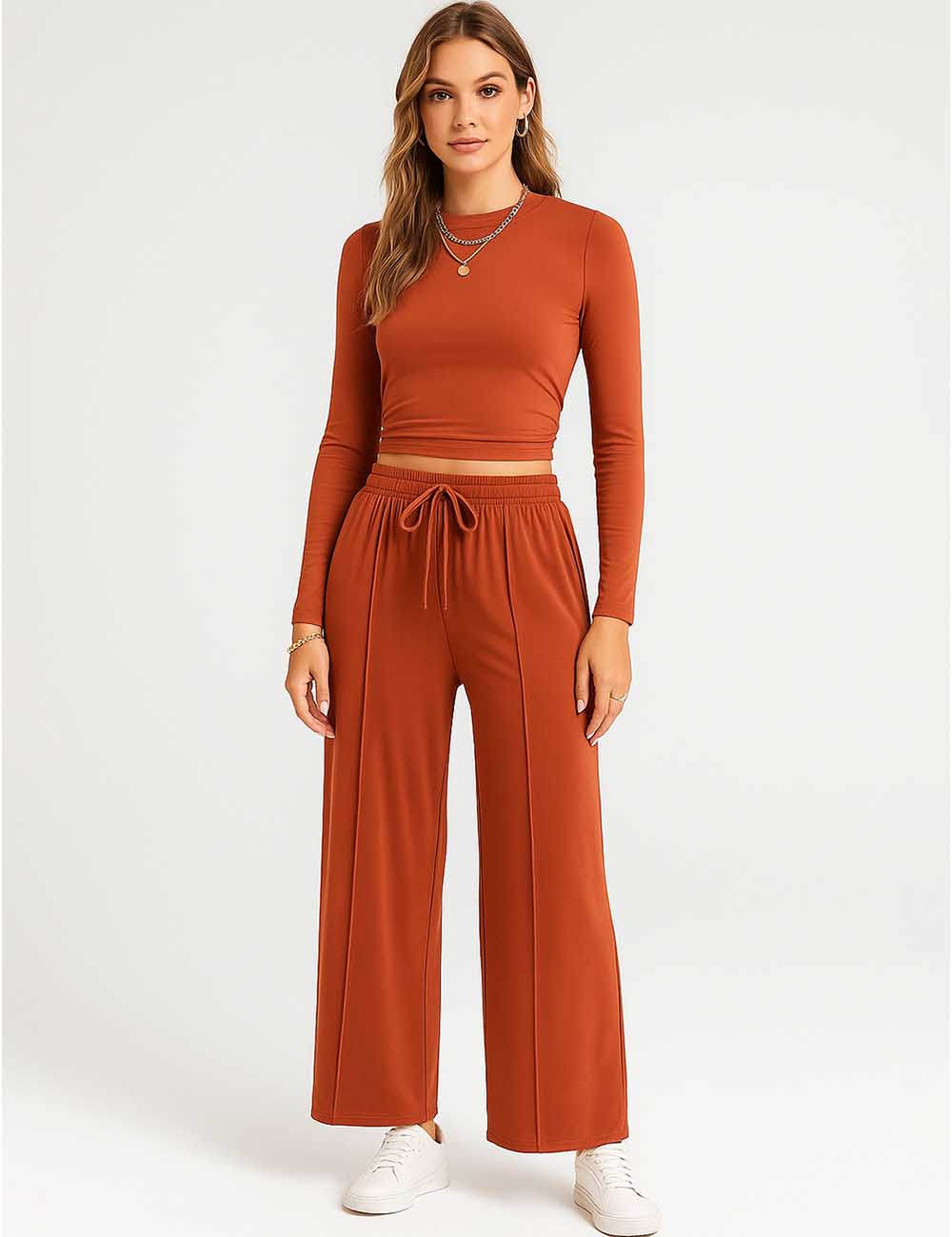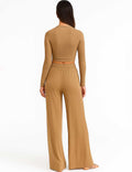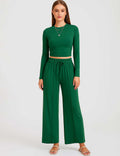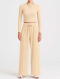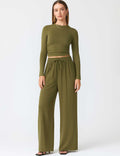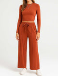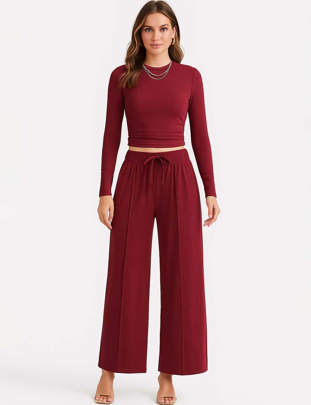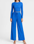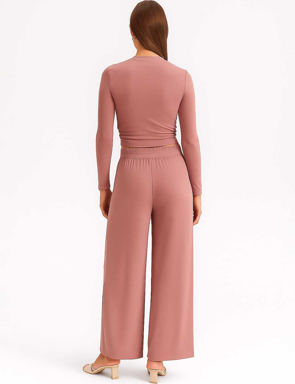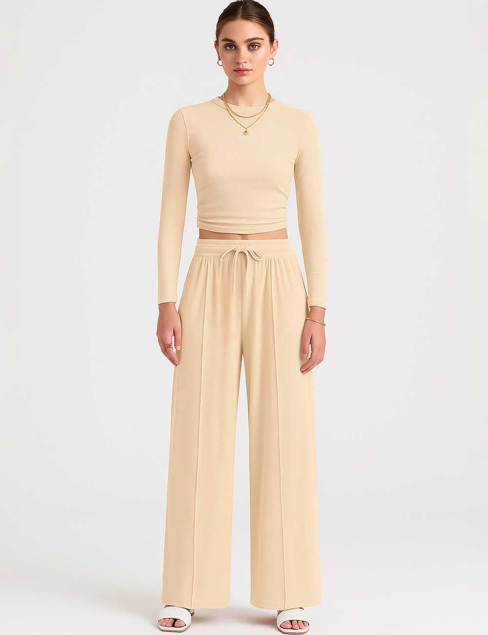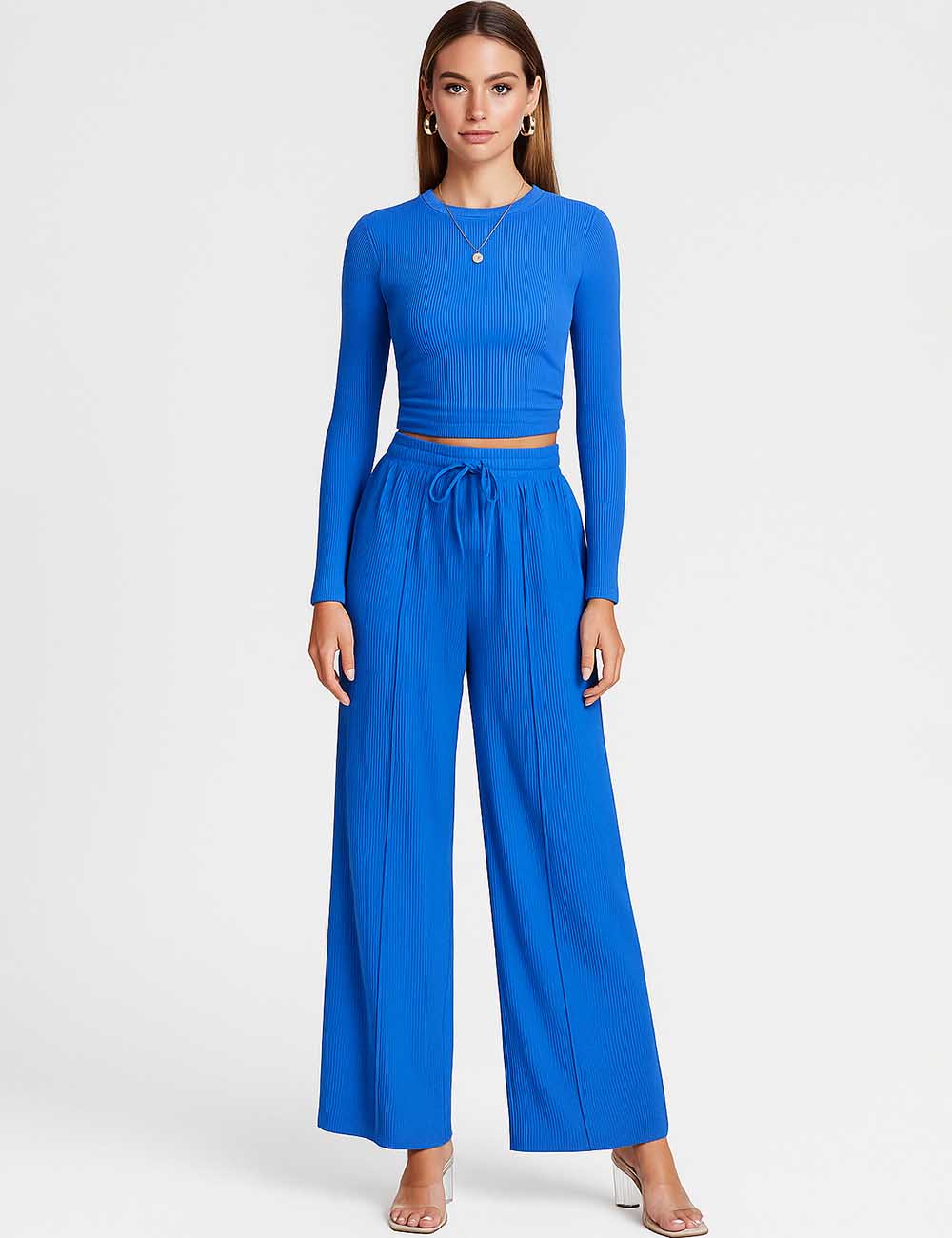 Ladies Stretch Ruched Long Sleeves Cropped Top & Pants Set