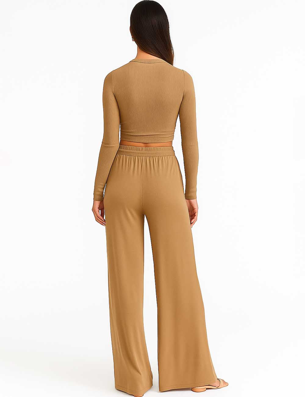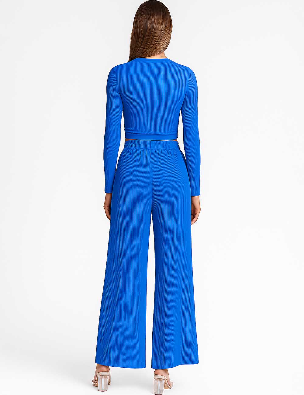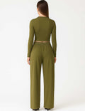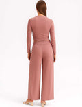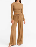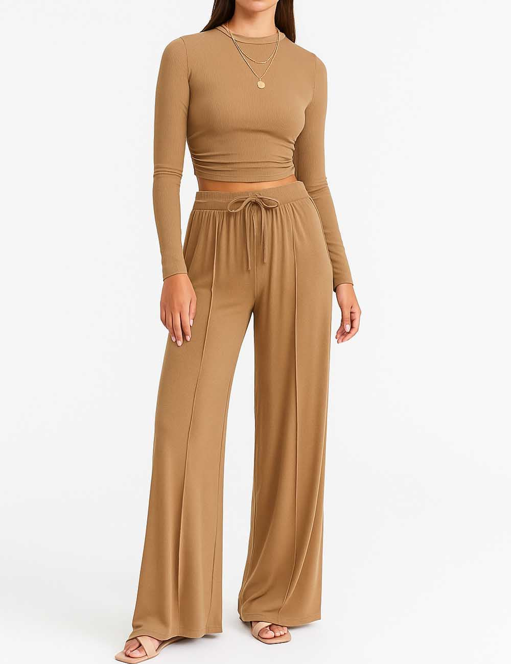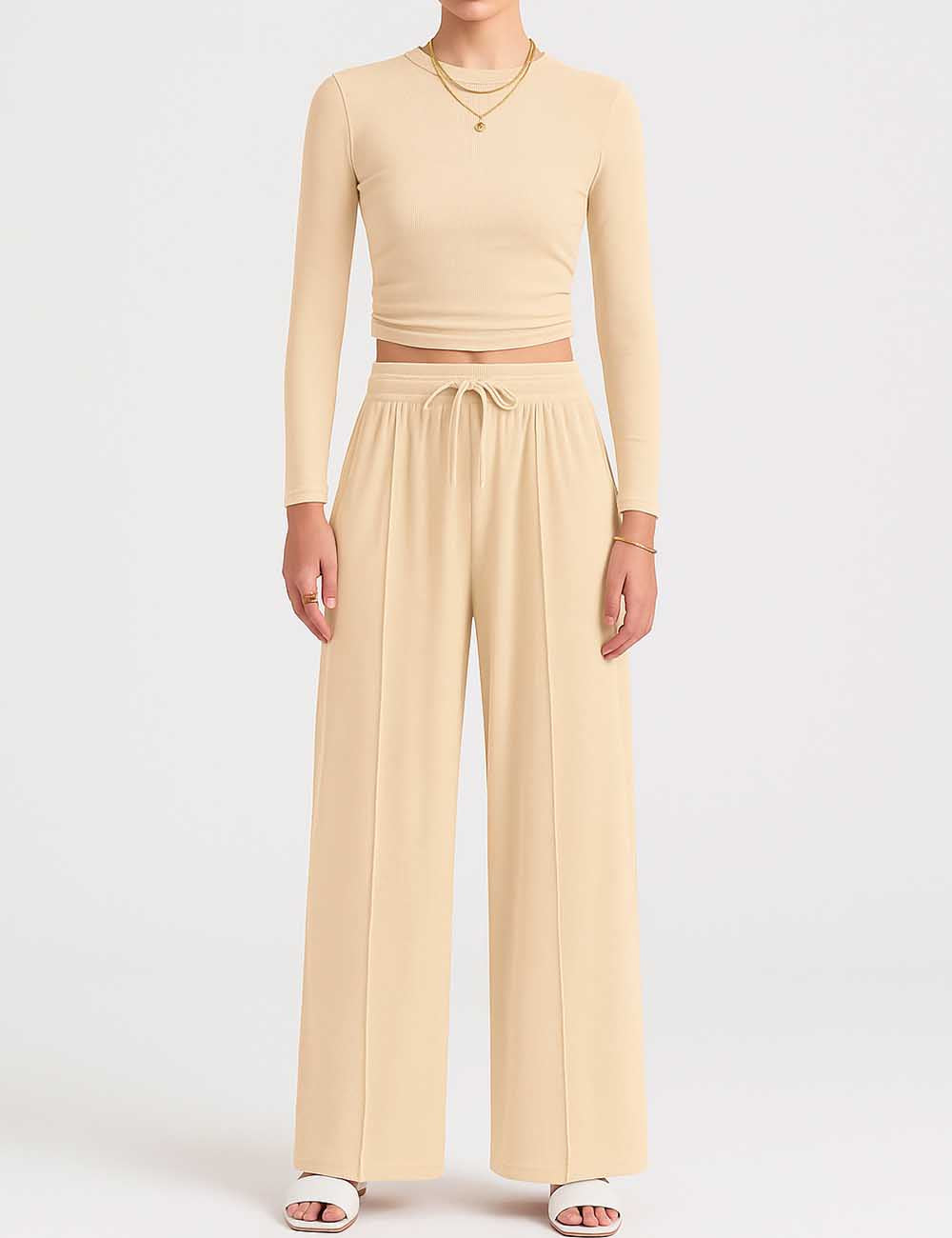 Ladies Stretch Ruched Long Sleeves Cropped Top & Pants Set
