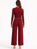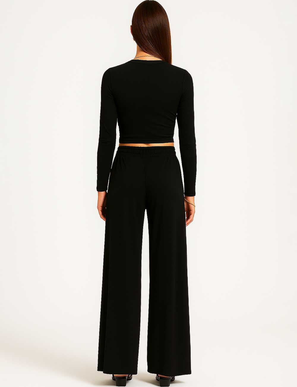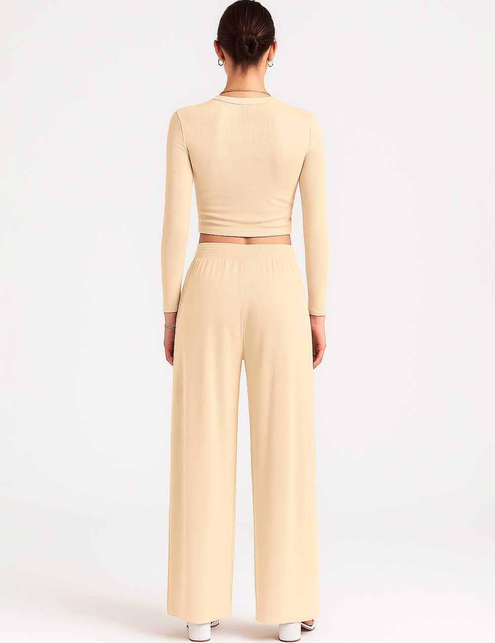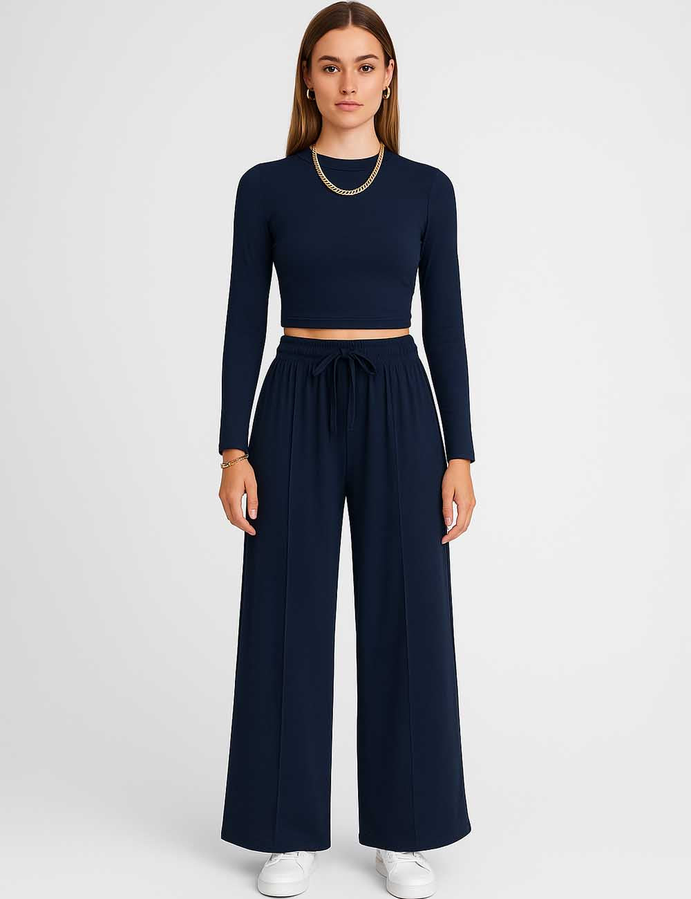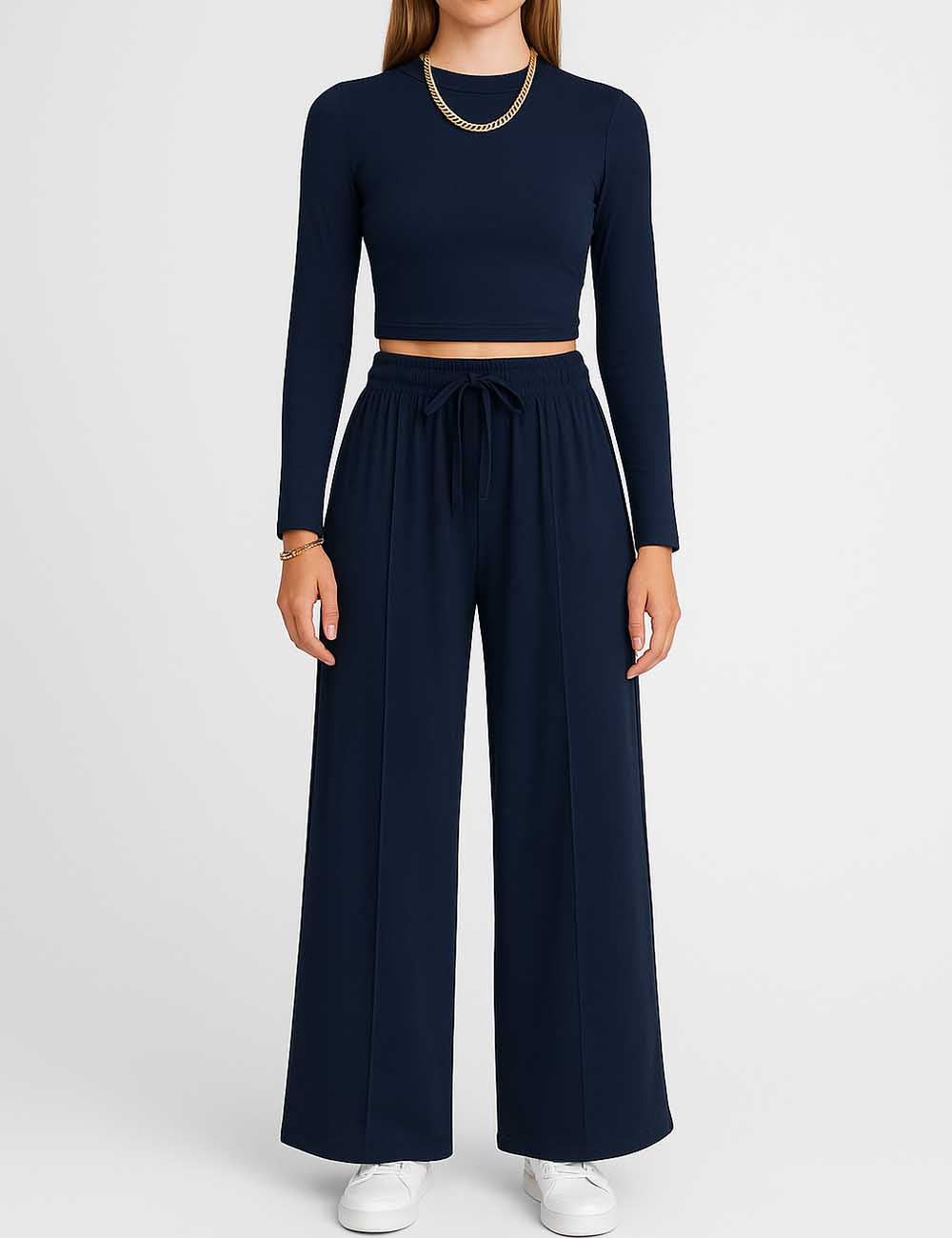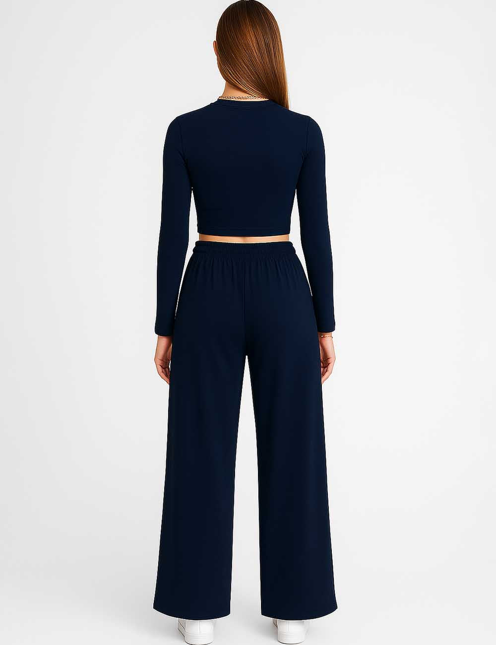 Ladies Stretch Ruched Long Sleeves Cropped Top & Pants Set