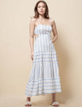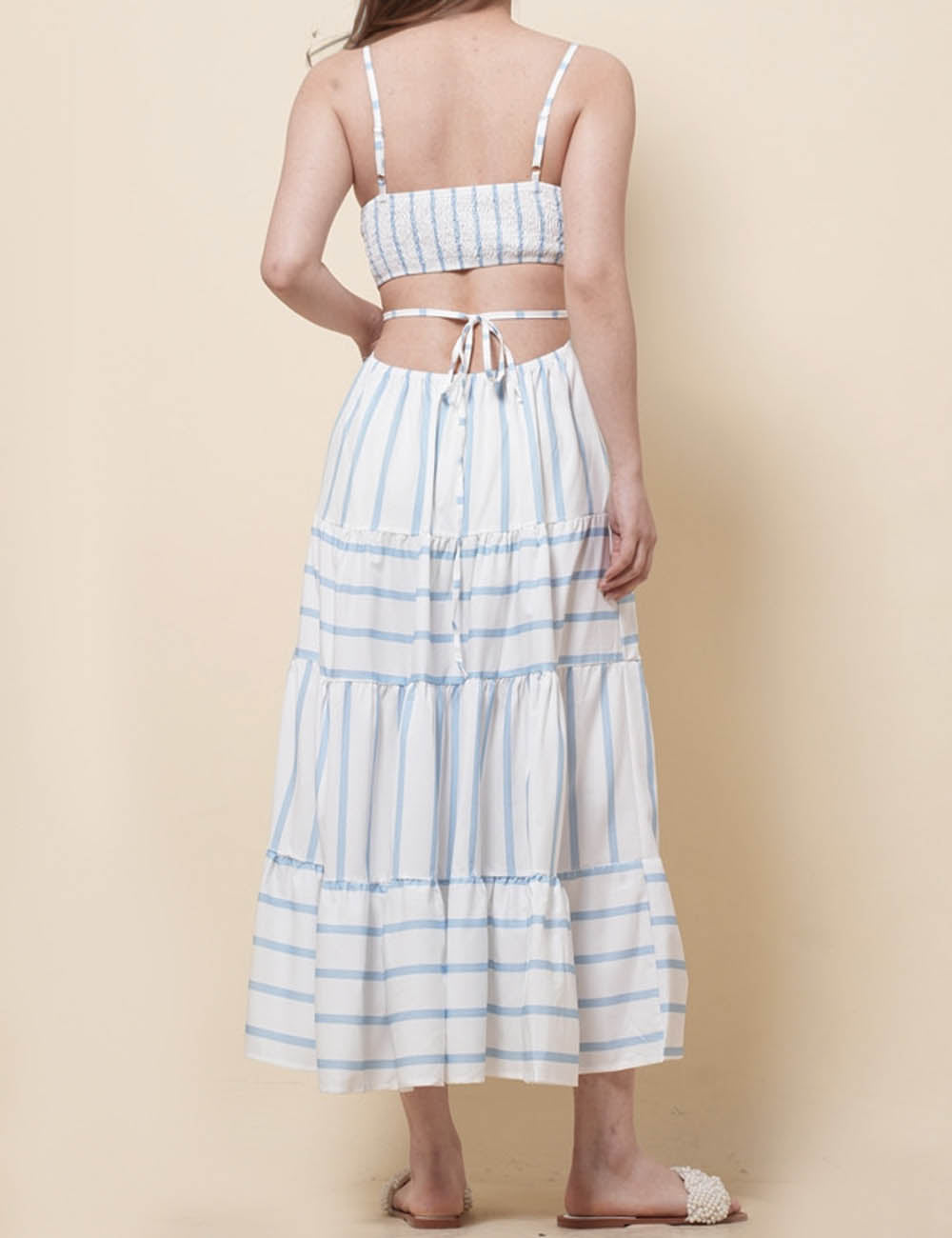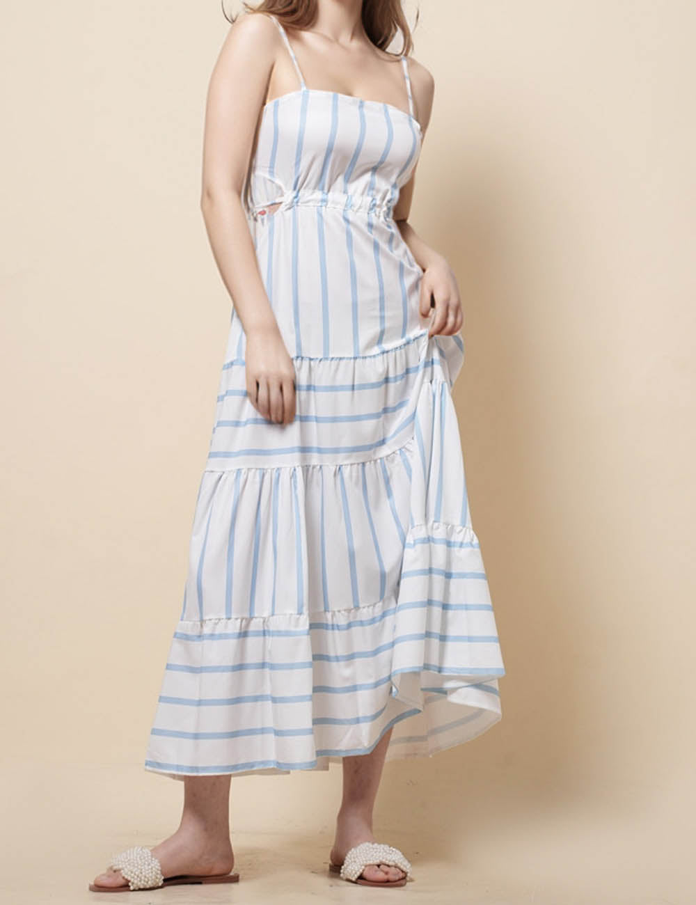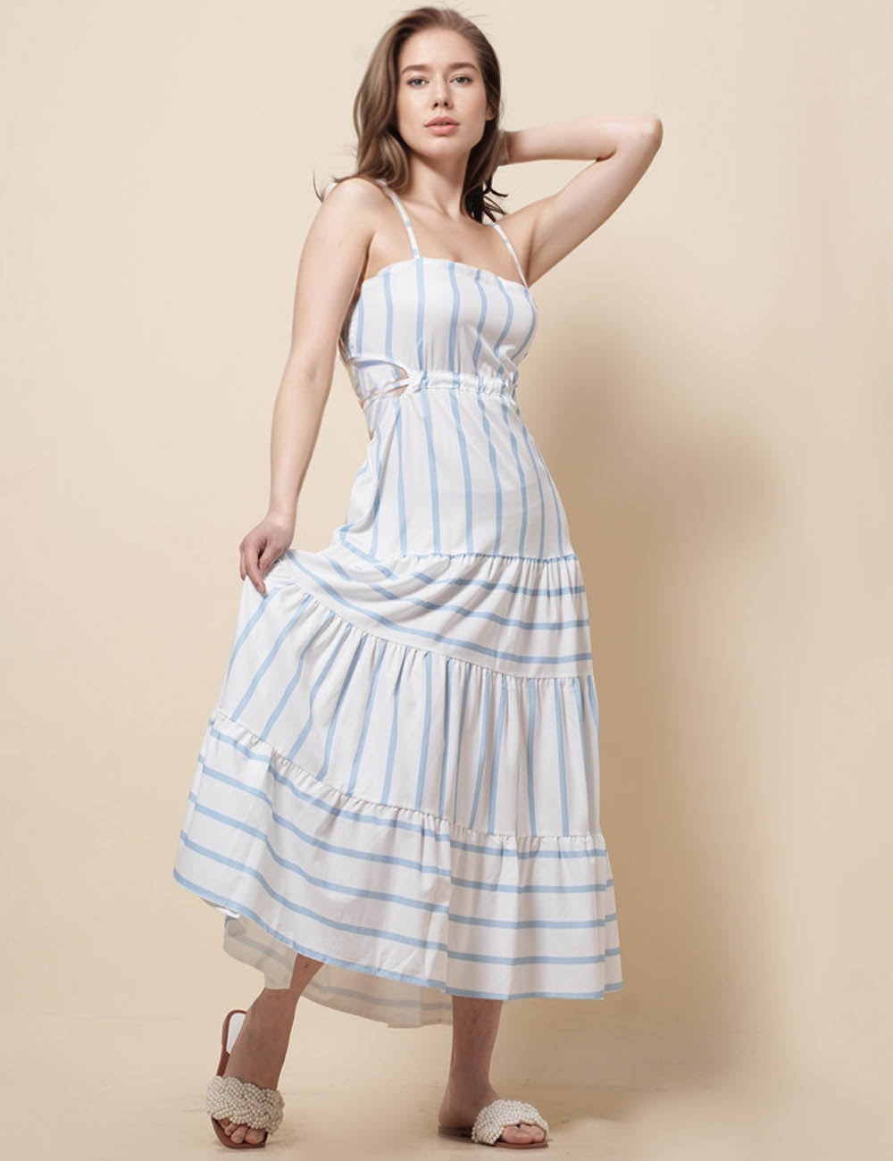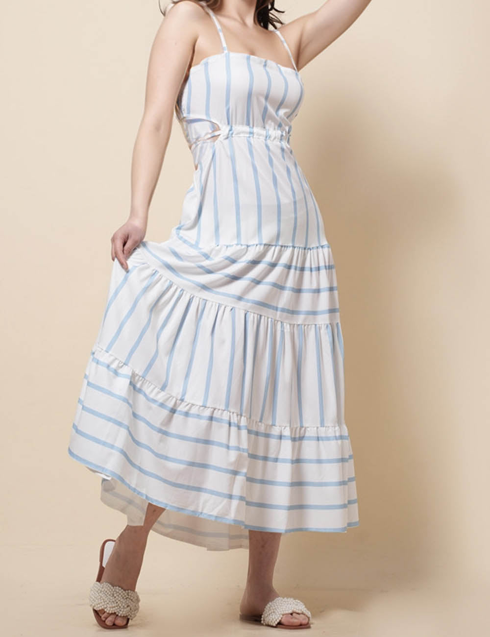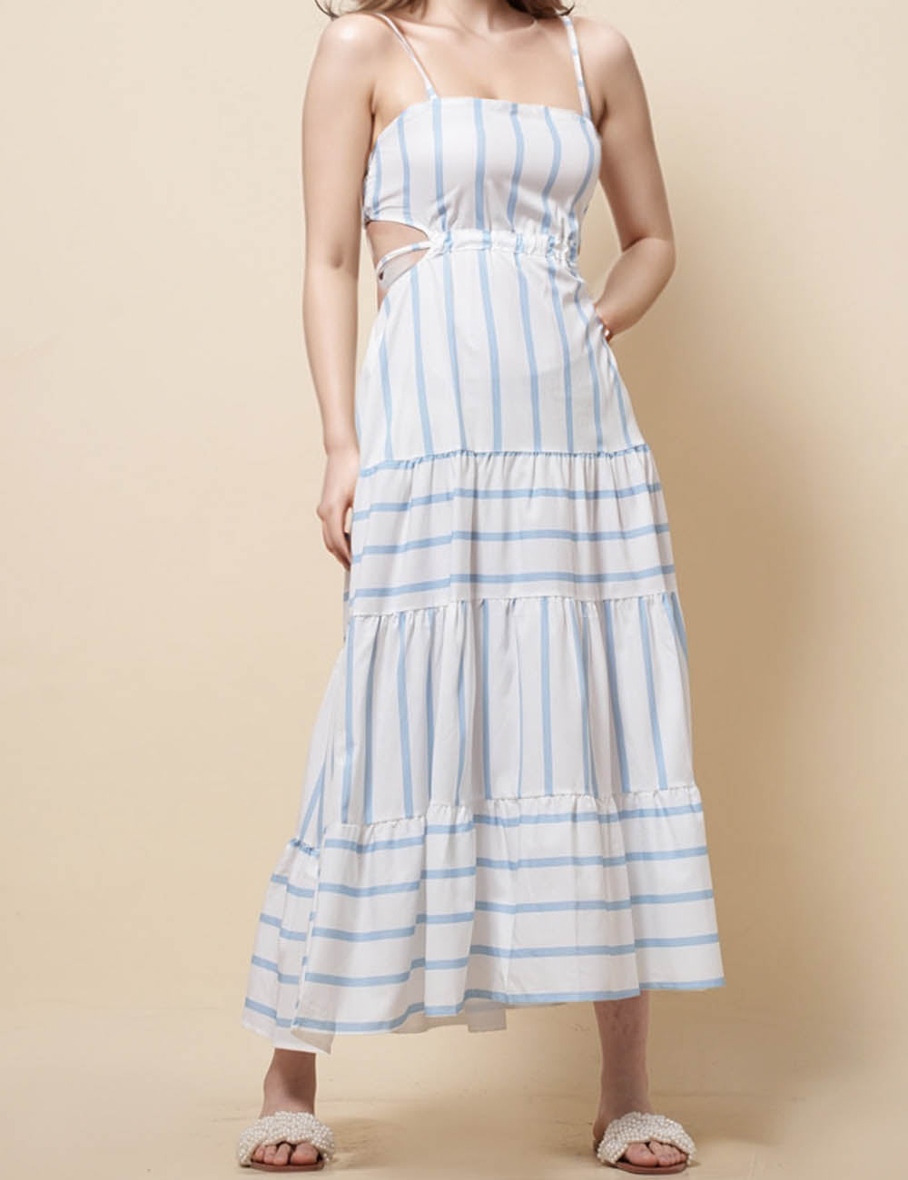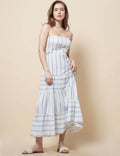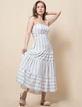 Ladies String Shoulder Striped Print Splice Midi Dress SKD51203