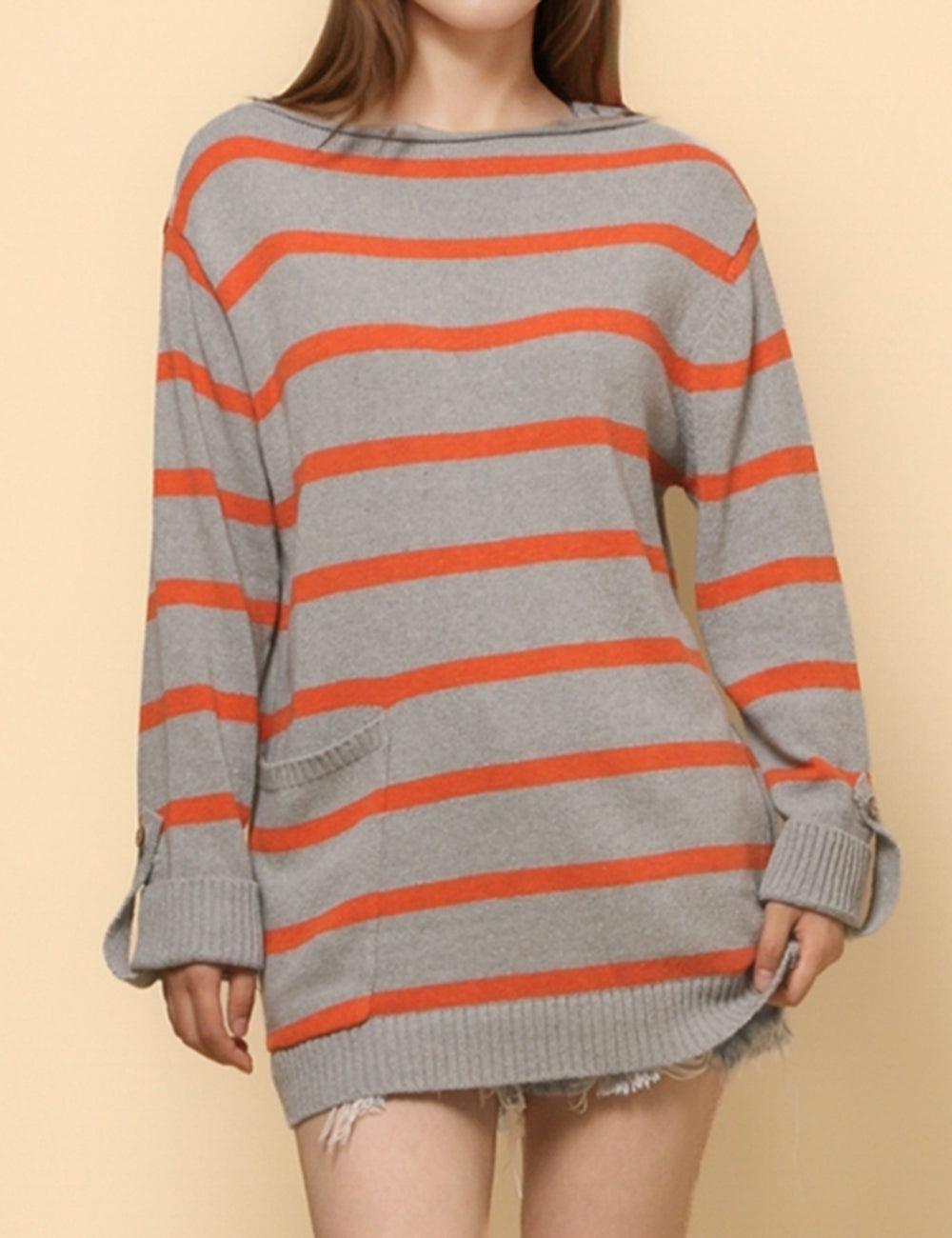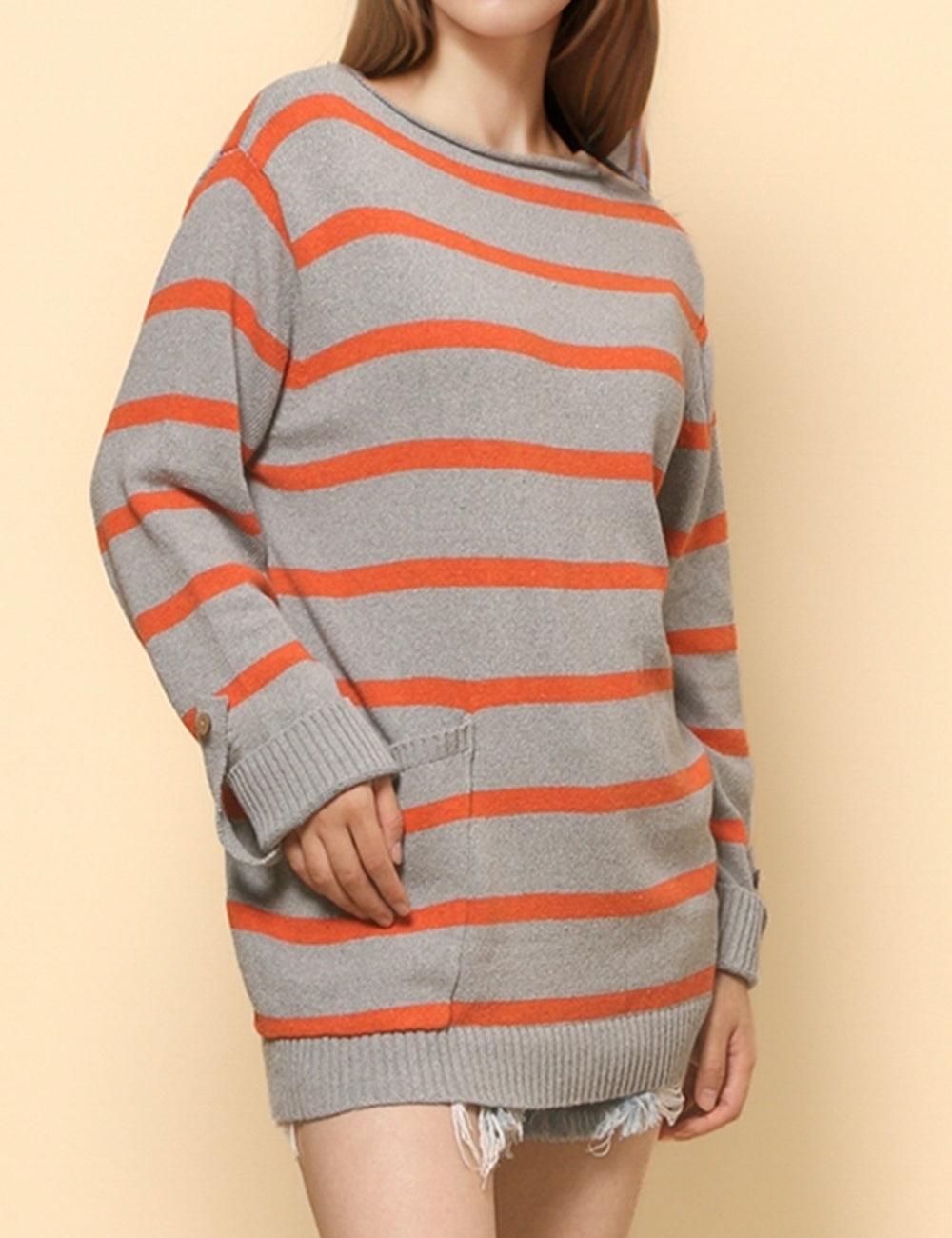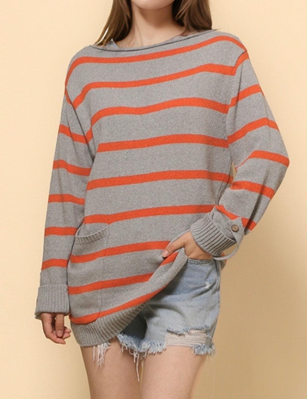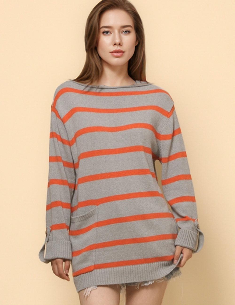 Ladies Stripe Color Block Pullover Pocket Sweater SKT4746