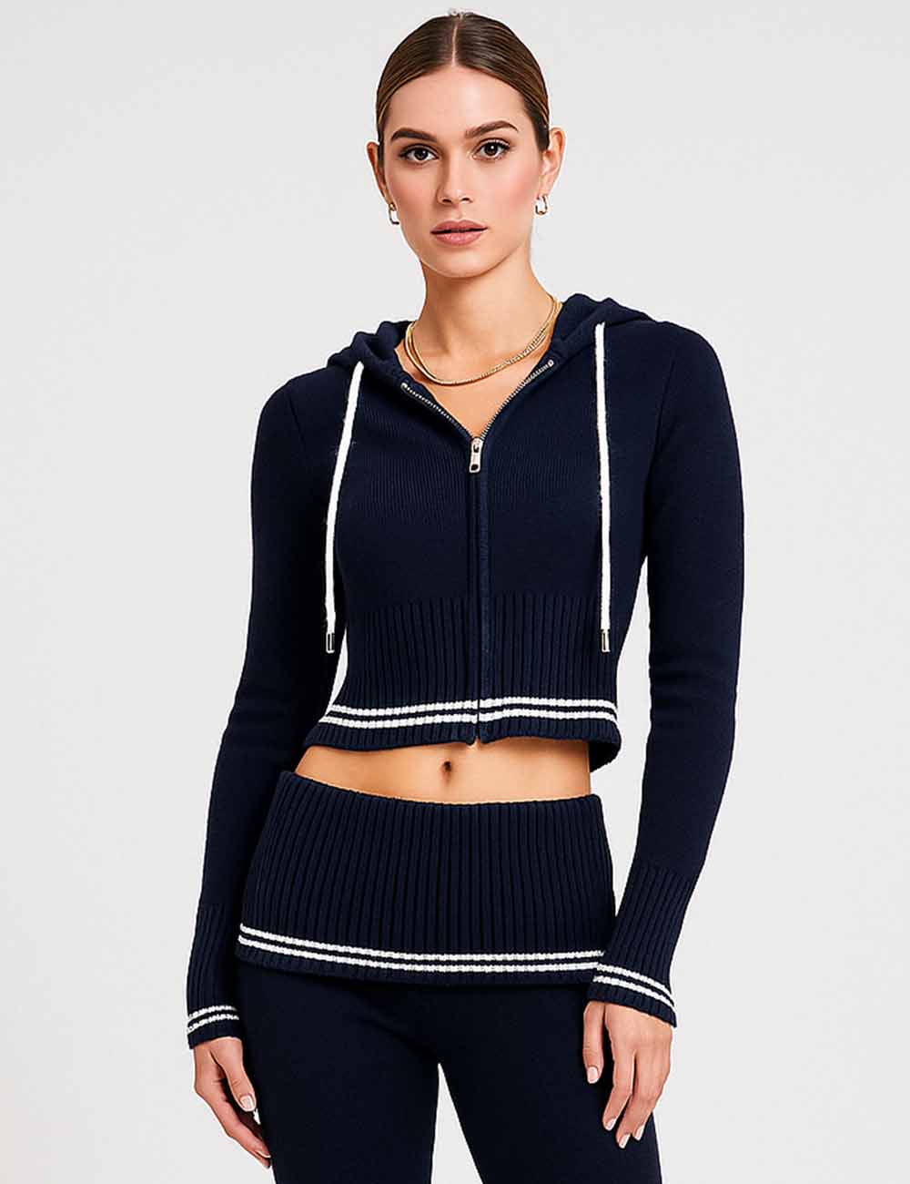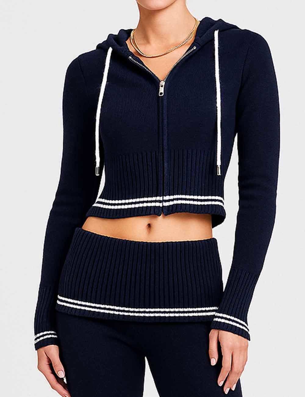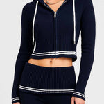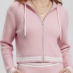 Ladies Striped Color Block Hoodie Zipper Cropped Knit Sweatshirt