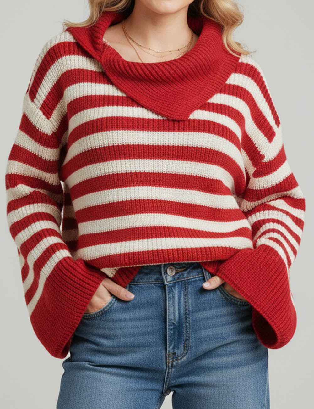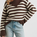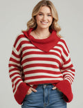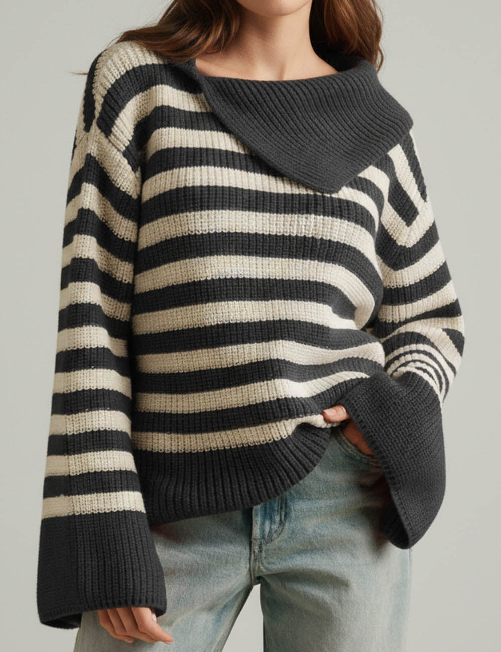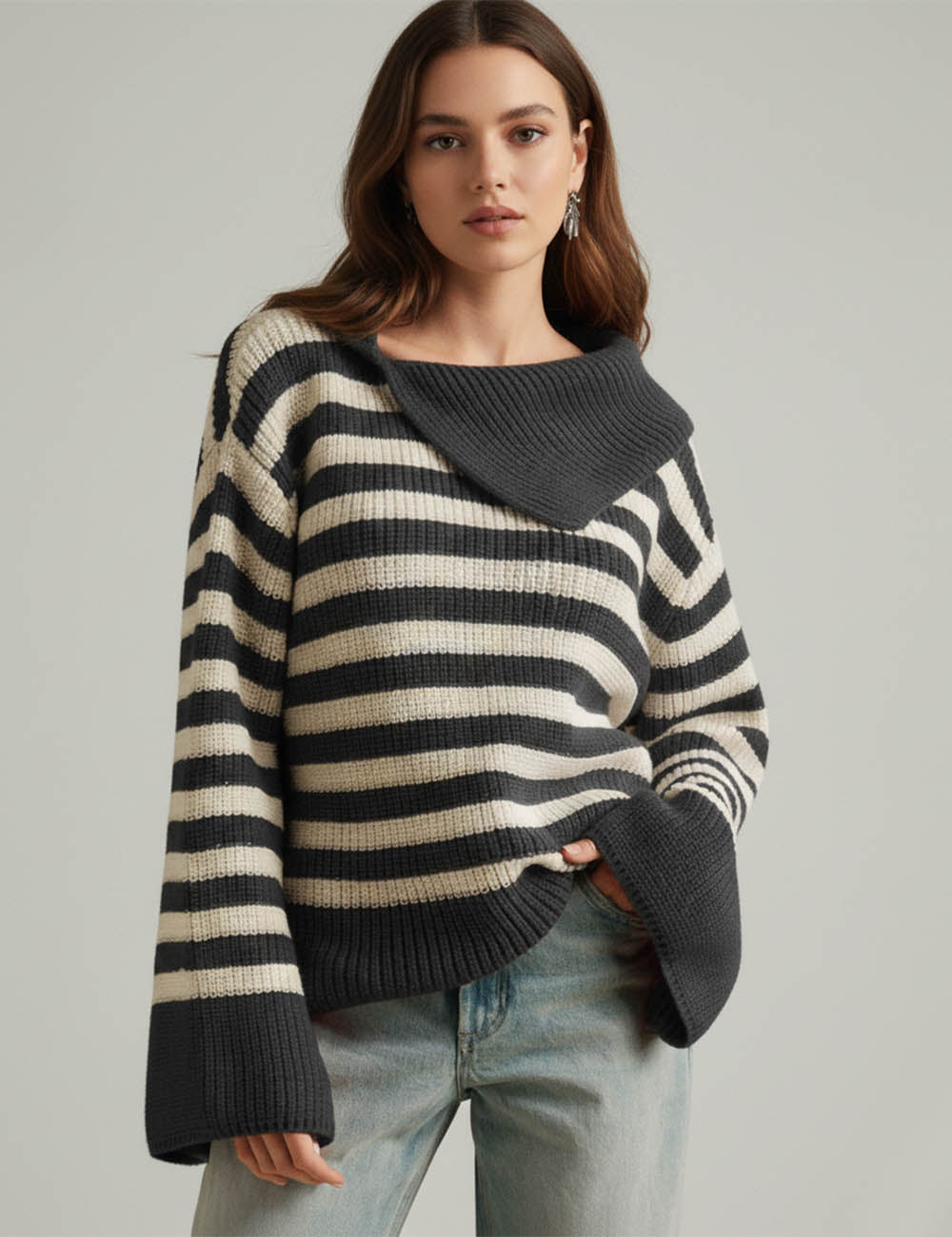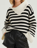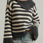 Ladies Striped Knit Irregular Lapel Flared Sleeves Pullover Sweater
