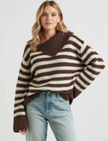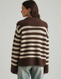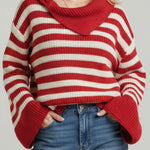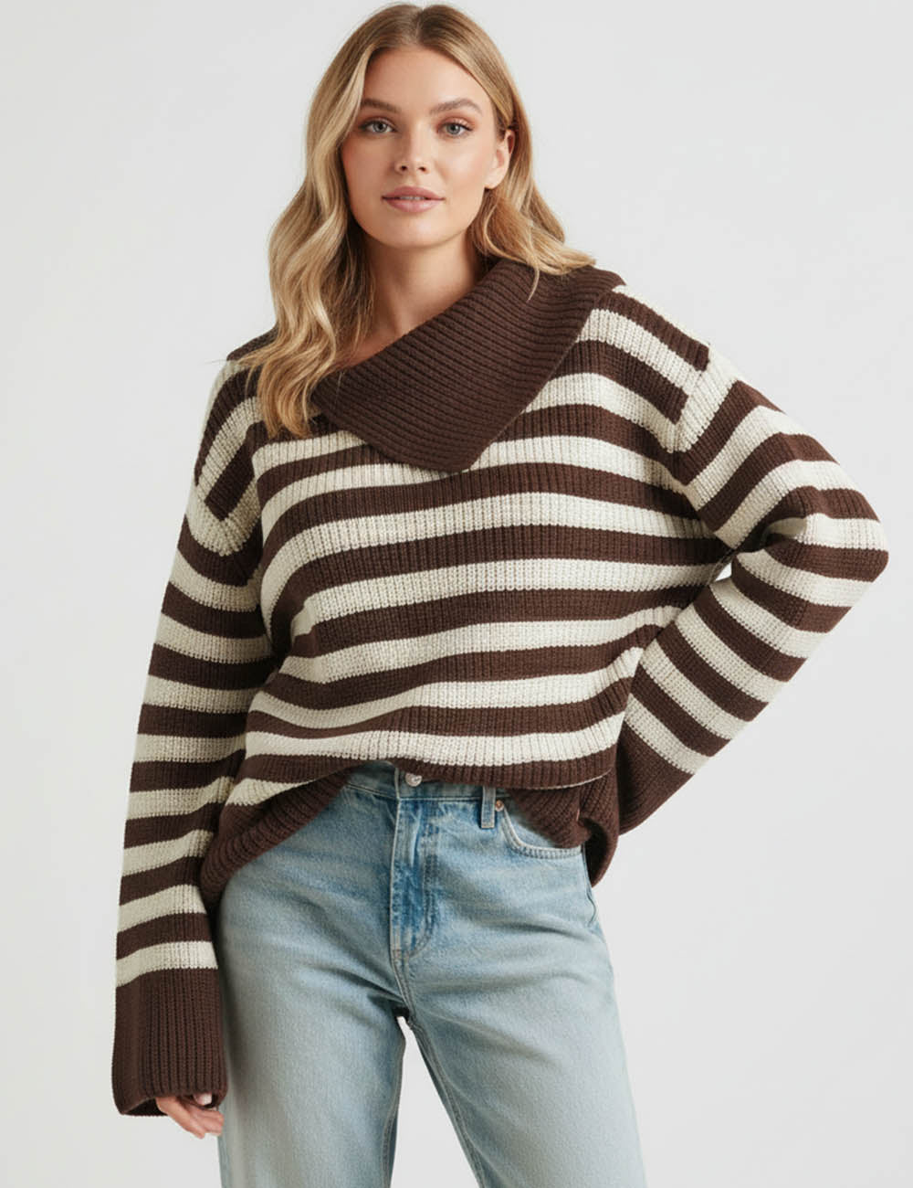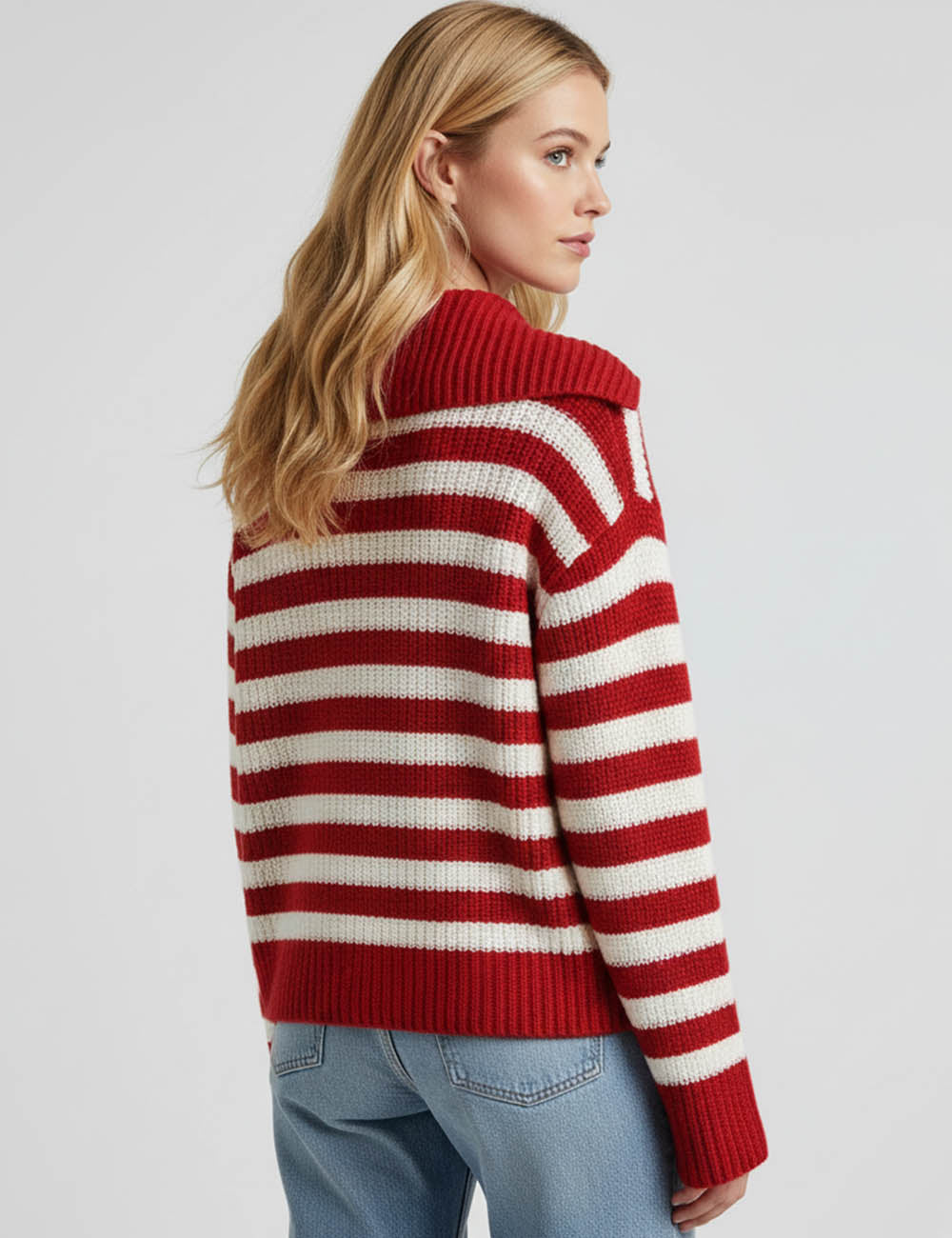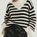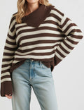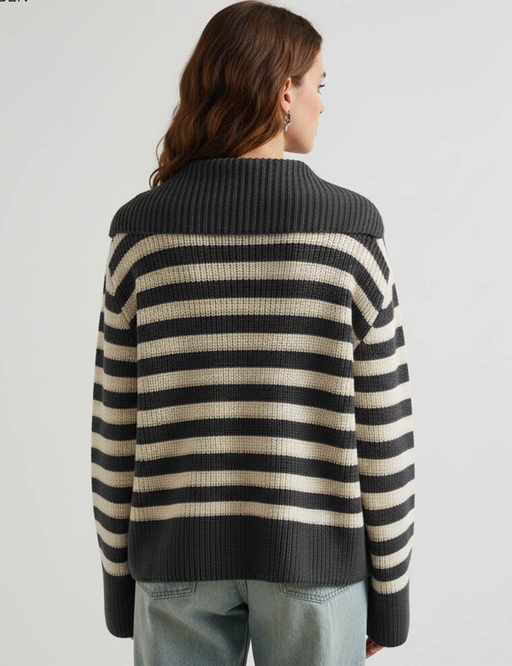 Ladies Striped Knit Irregular Lapel Flared Sleeves Pullover Sweater