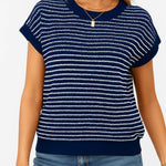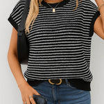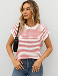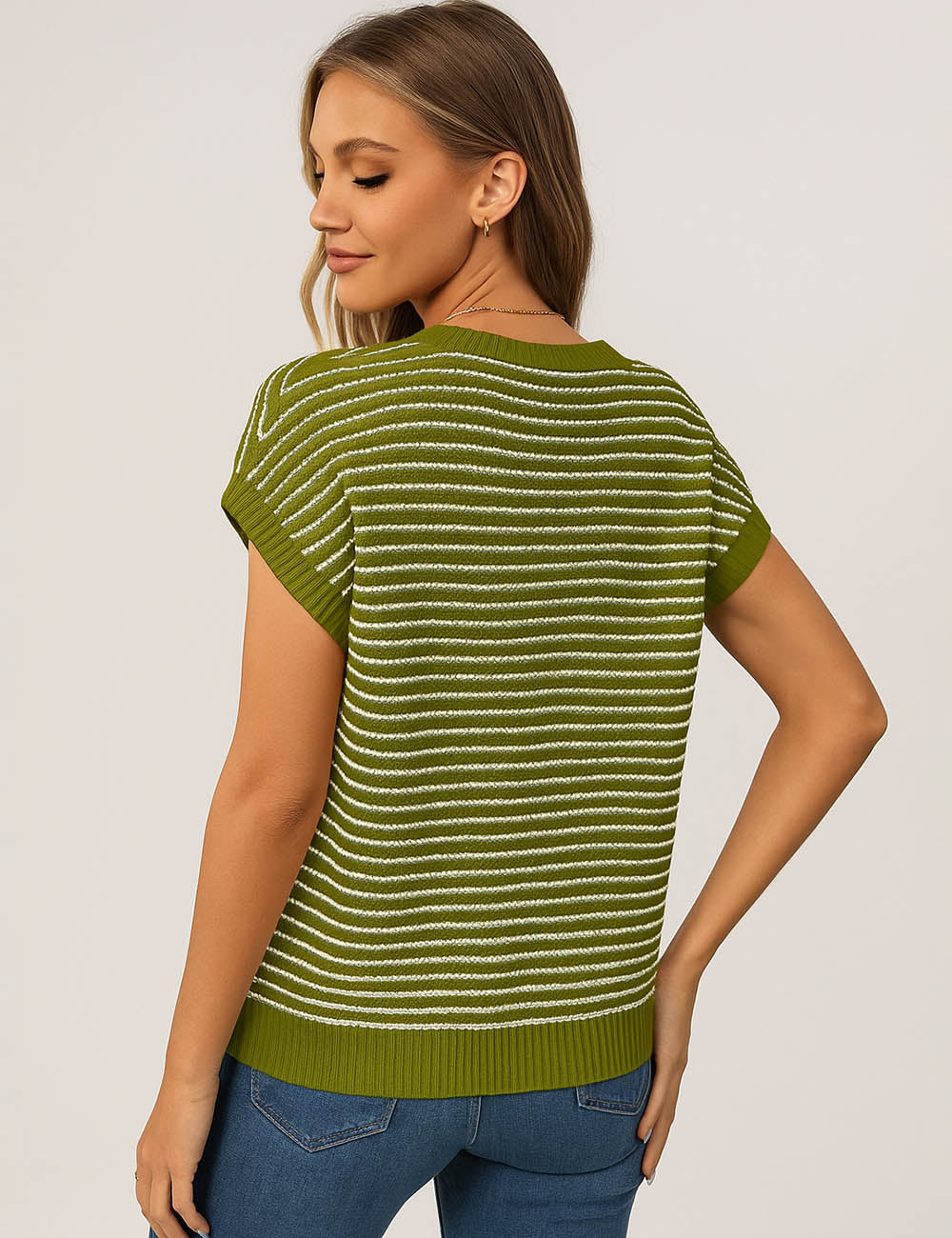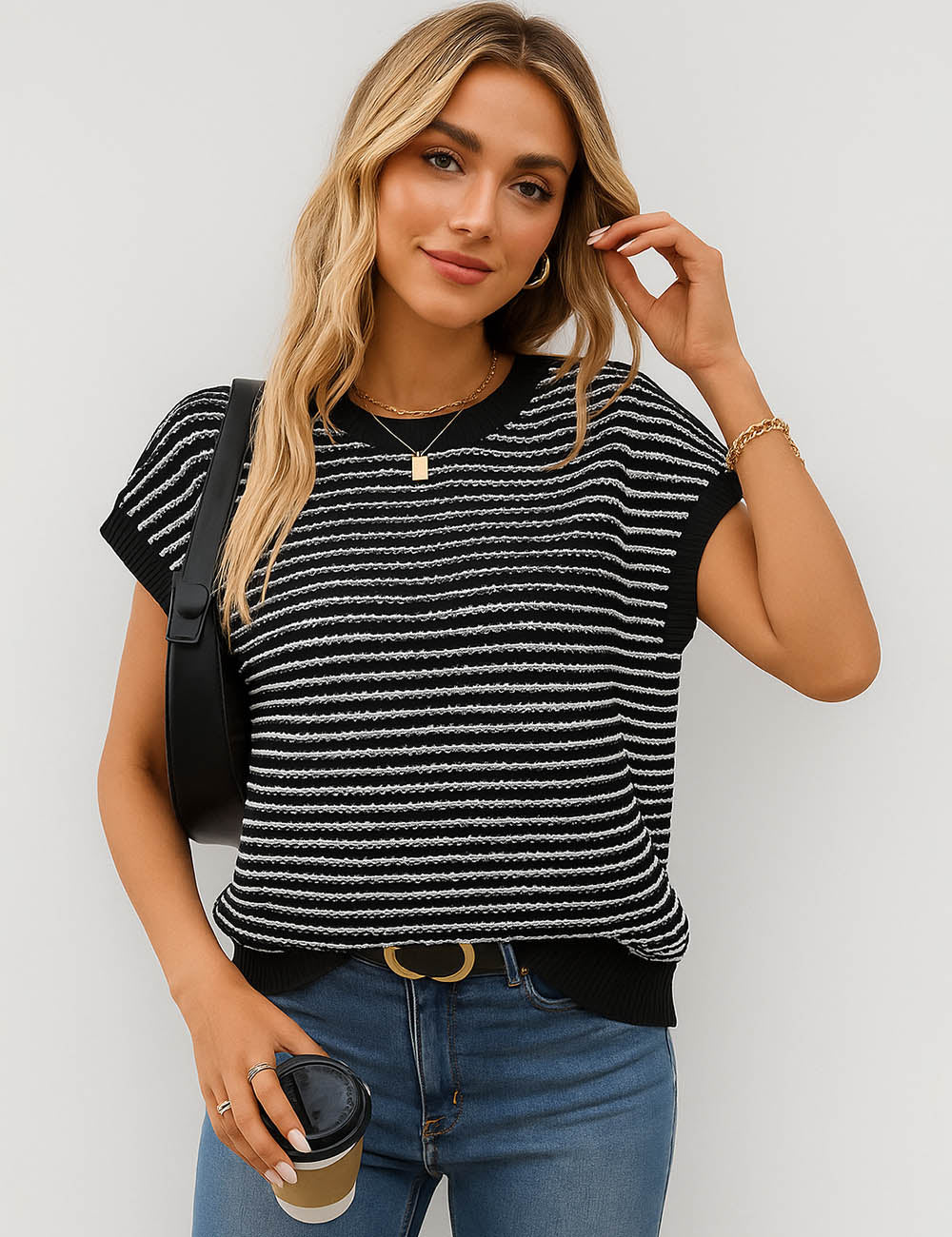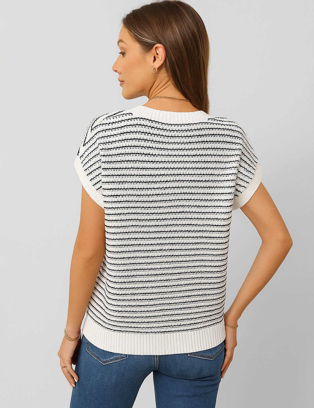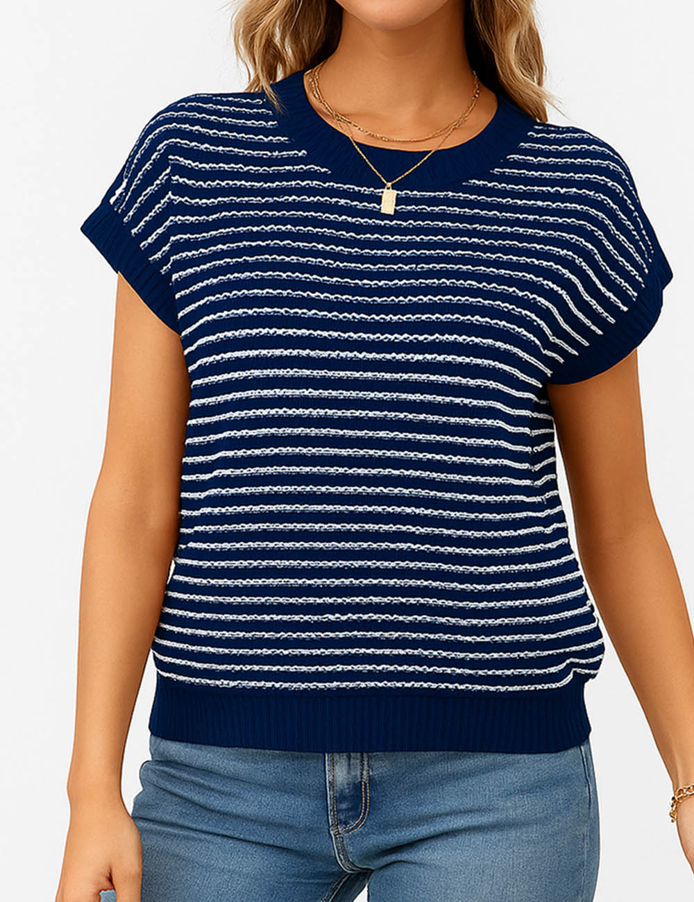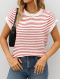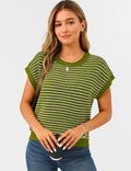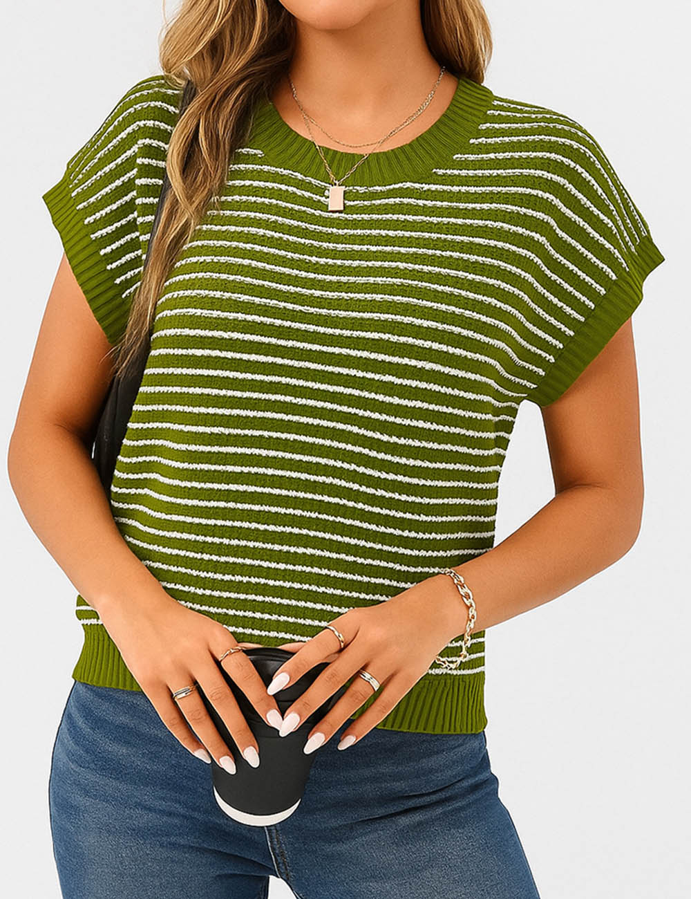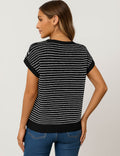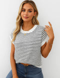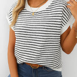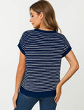Ladies Striped Knit Top Rib Trim Short Sleeves Sweater