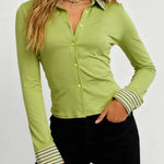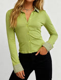 Ladies Striped Lapel Collar Button Long Sleeves Top
