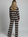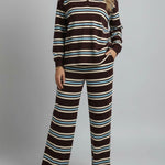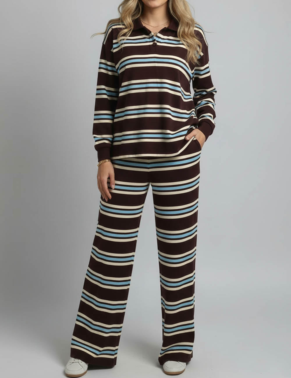 Ladies Striped Polo Collar Wide Leg Sweatshirt & Pants Set
