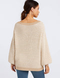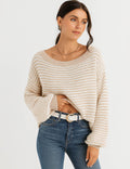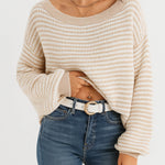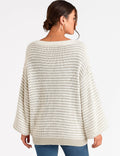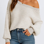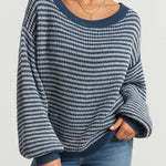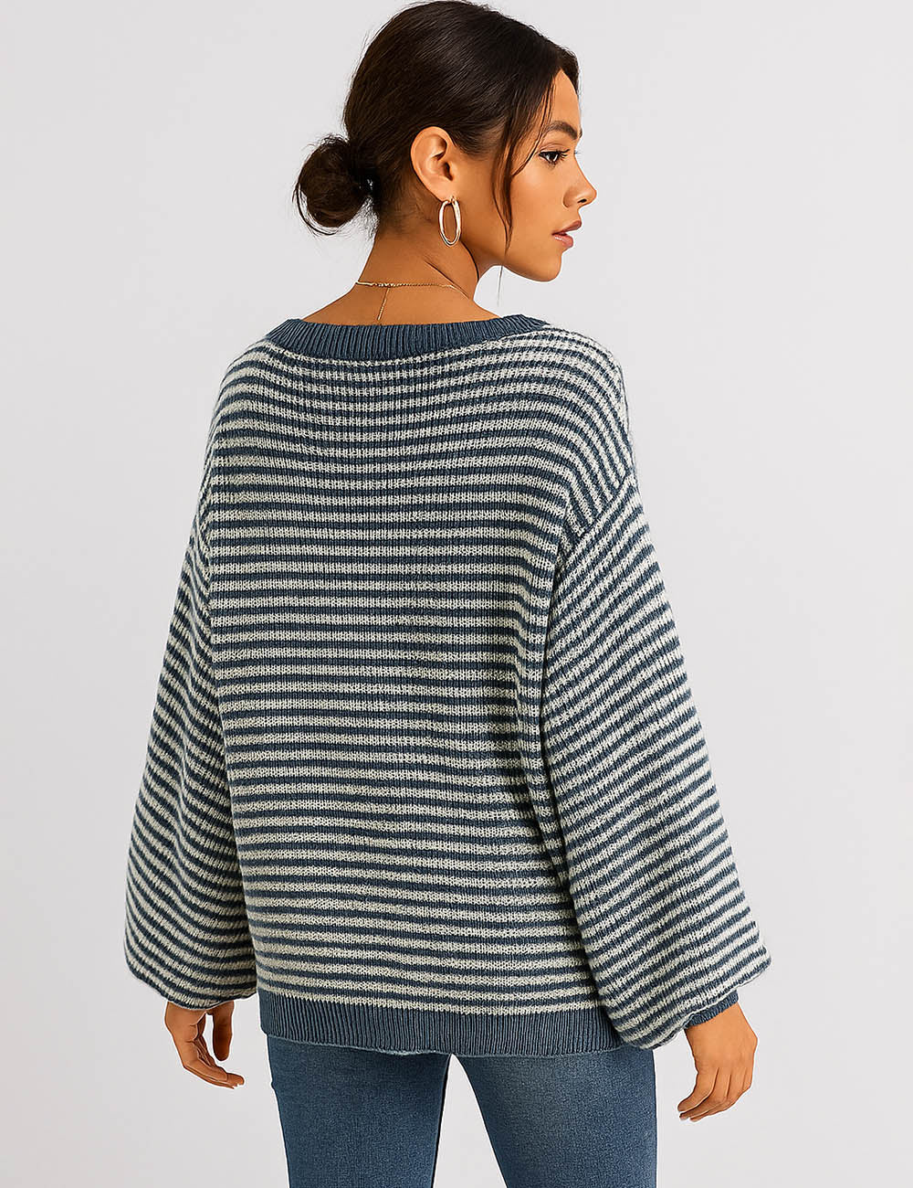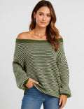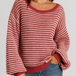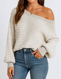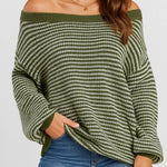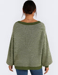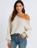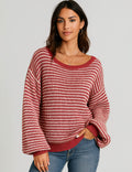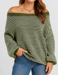Ladies Striped Pullover Round Neck Lantern Sleeves Knit Sweater
