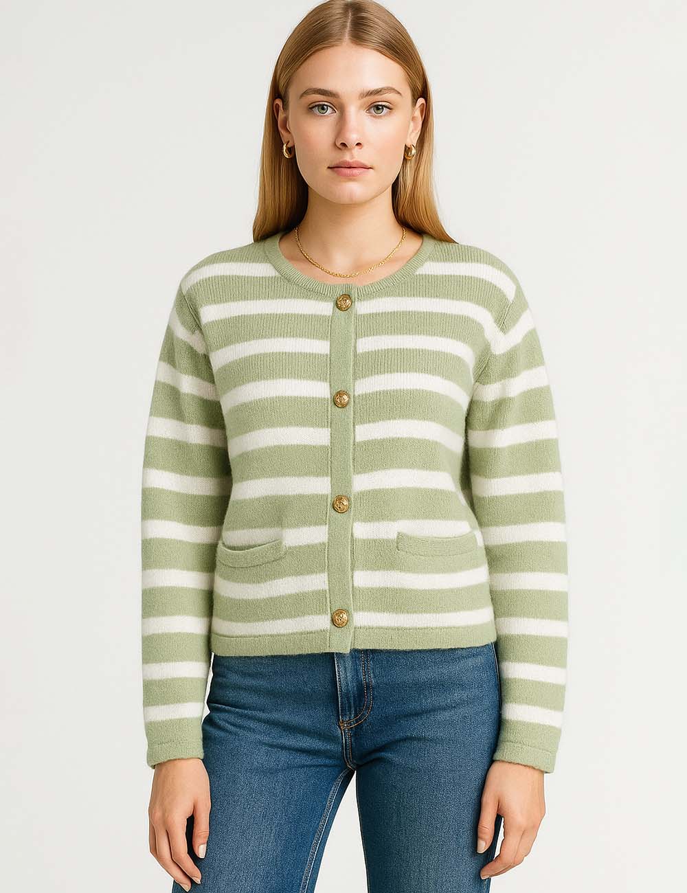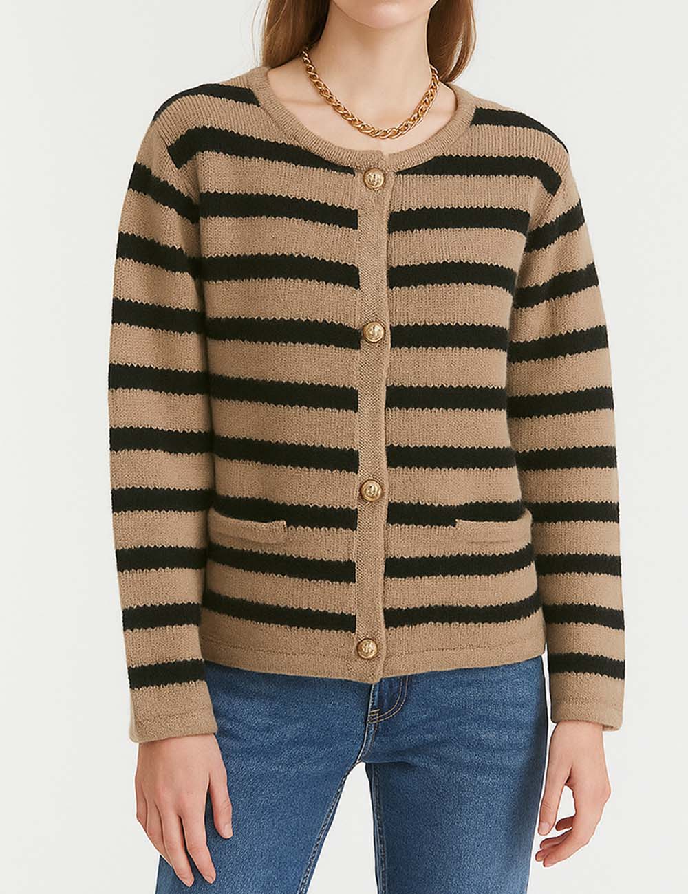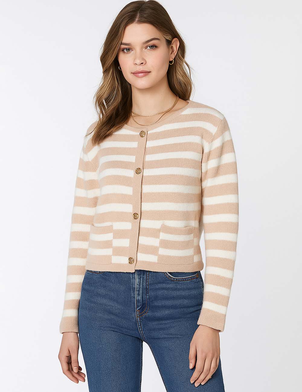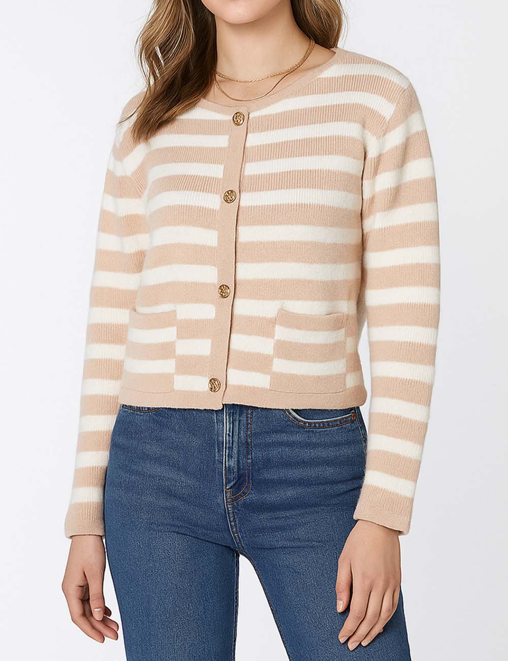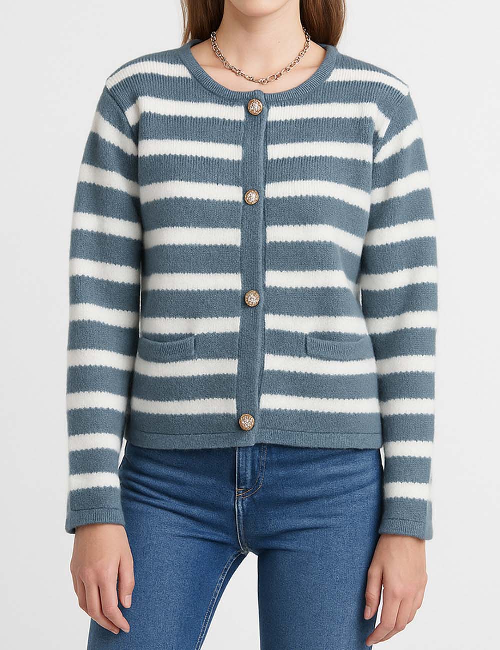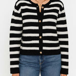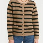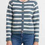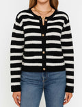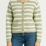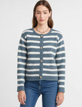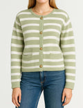 Ladies Striped Round Neck Button Front Knit Cardigan
