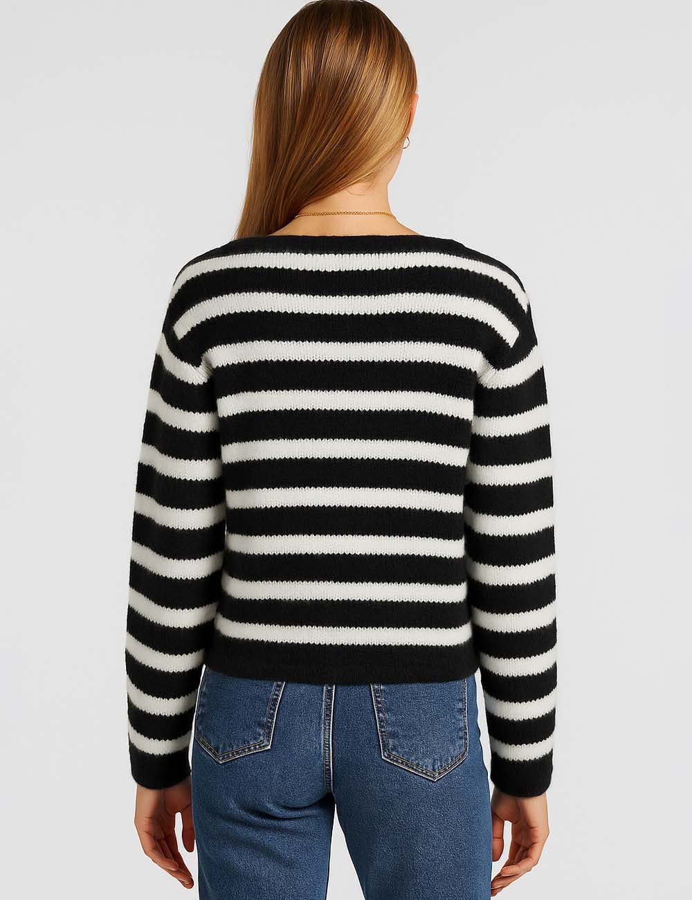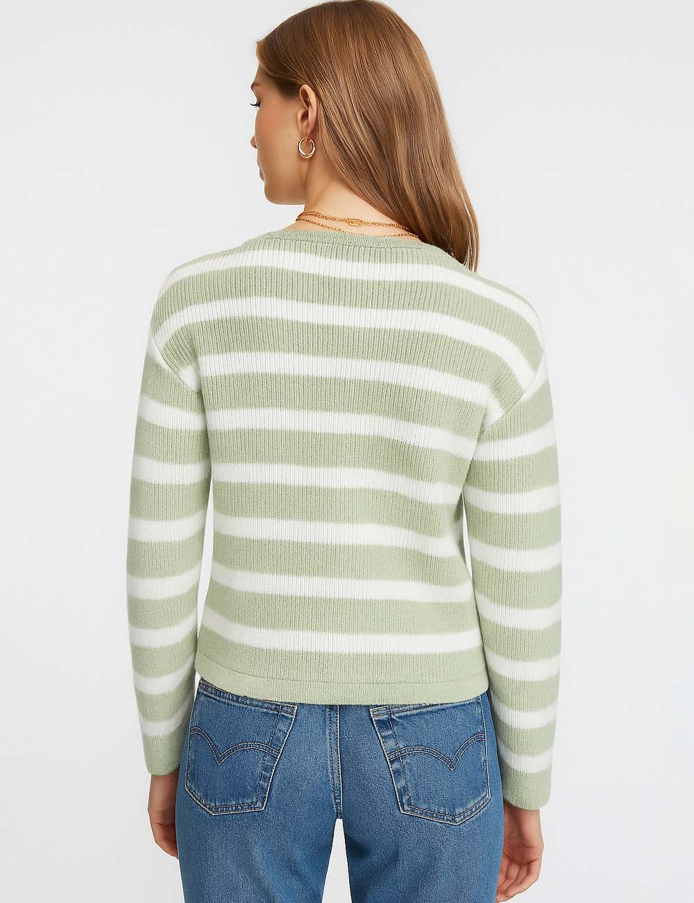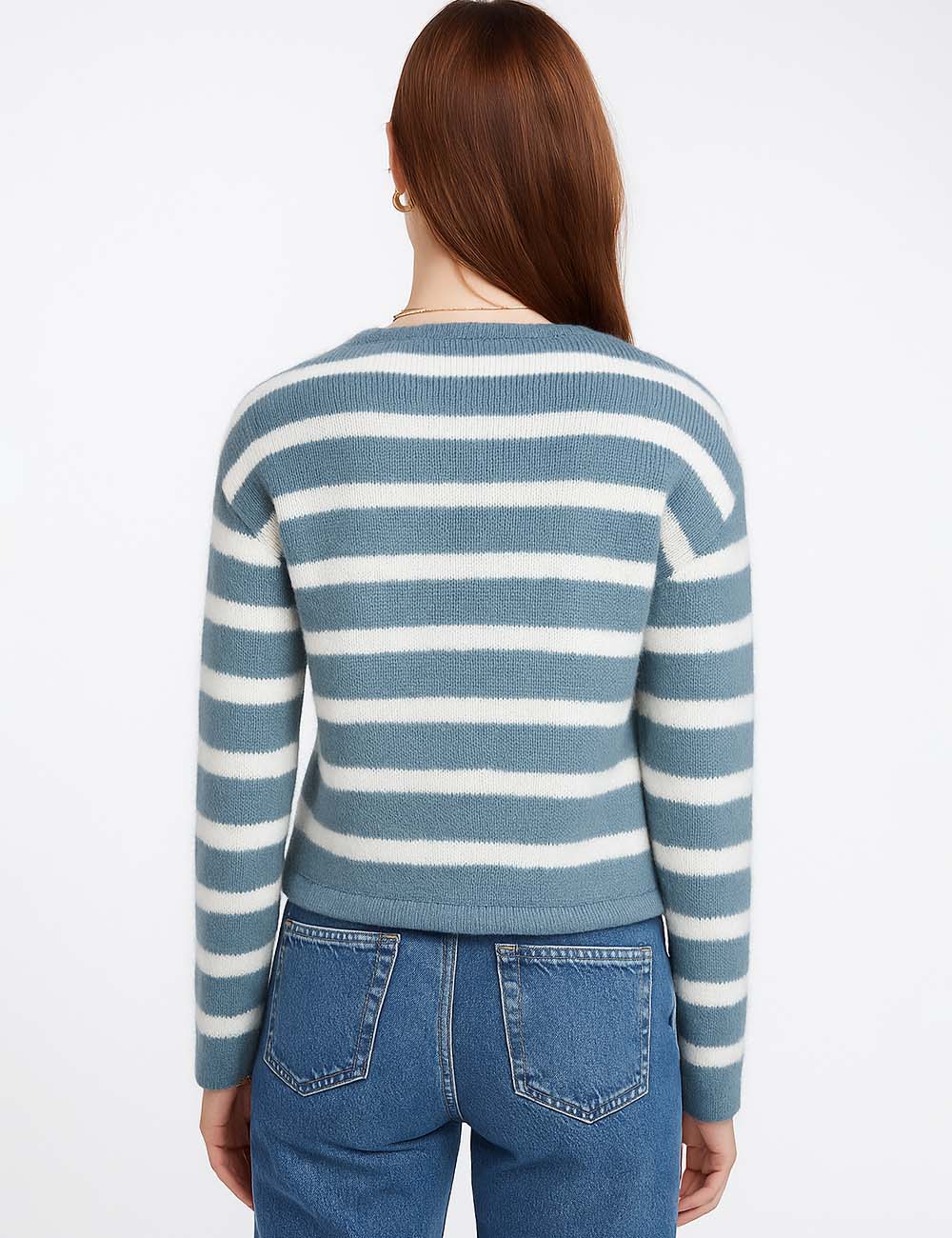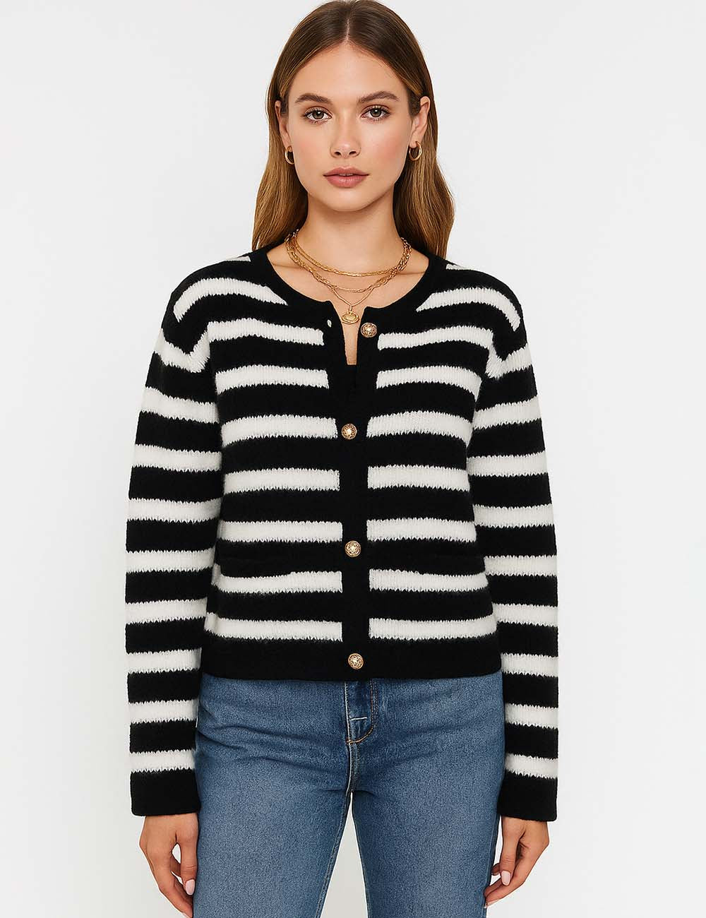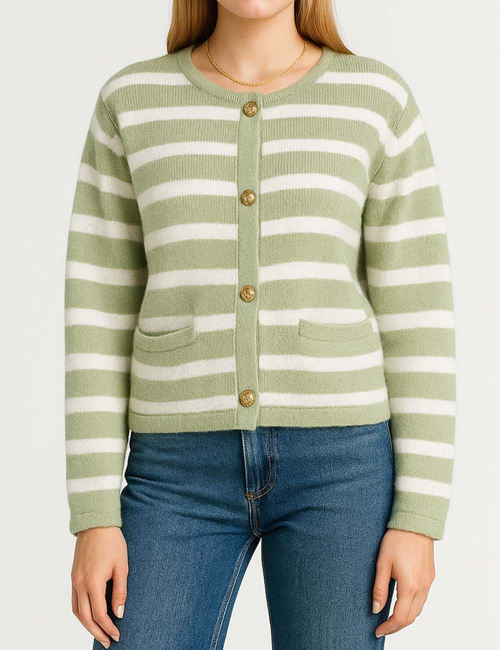 Ladies Striped Round Neck Button Front Knit Cardigan