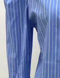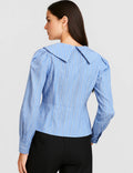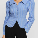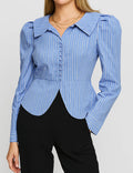 Ladies Striped Turn Down Collar Puff Sleeves Cropped Shirts