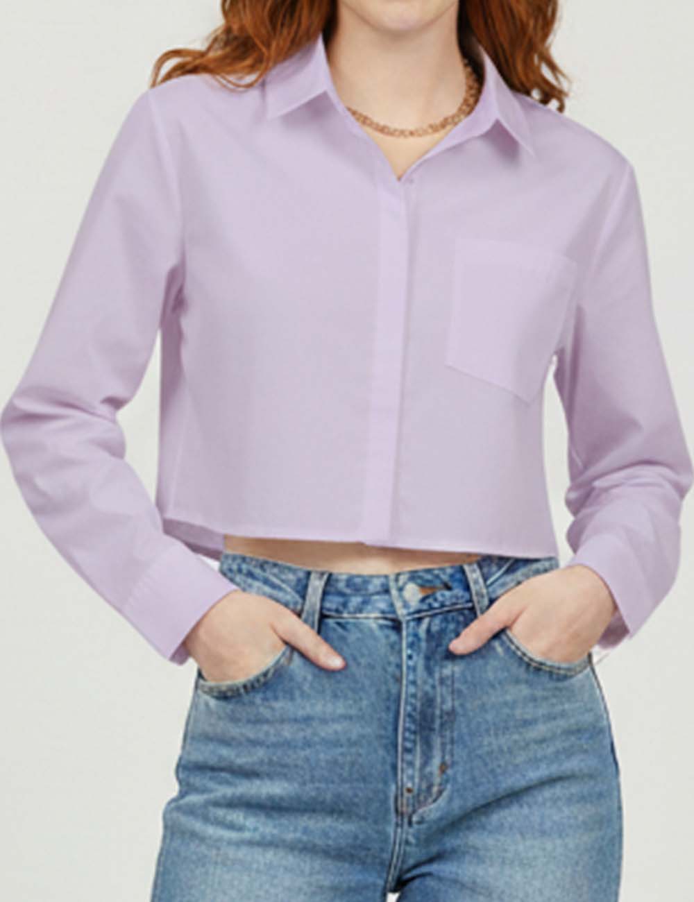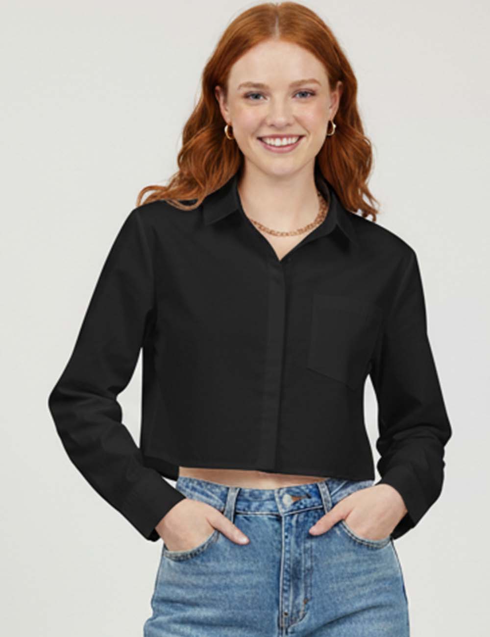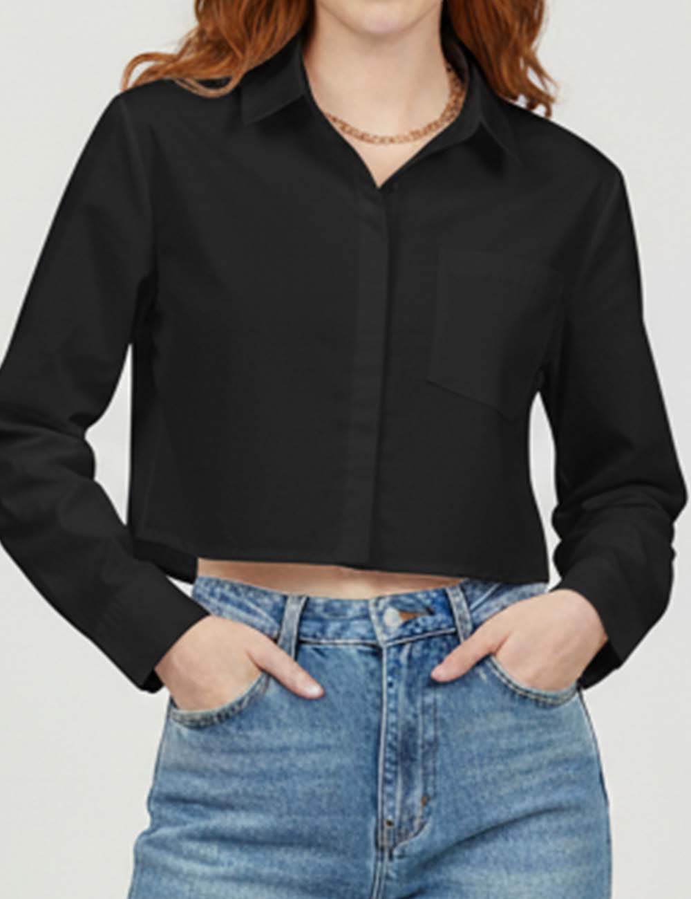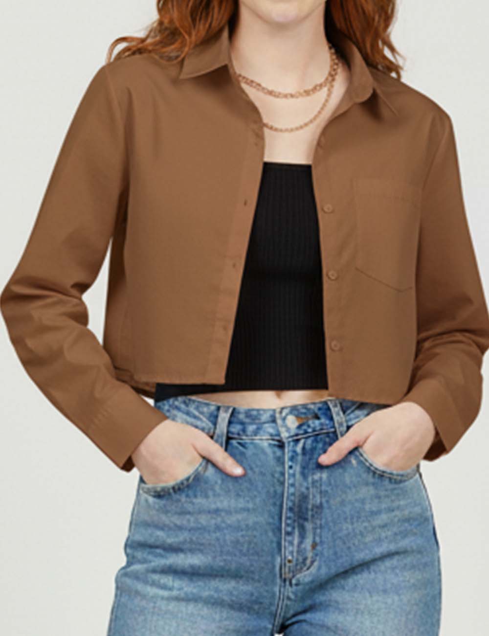 Ladies Turn Down Collar Long Sleeves Cropped Shirt
