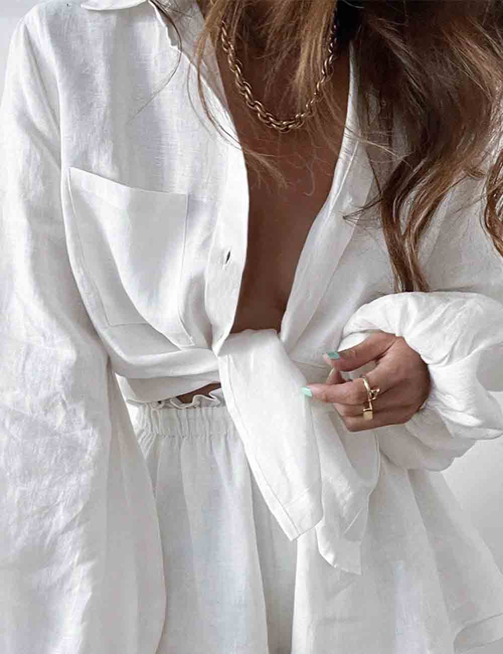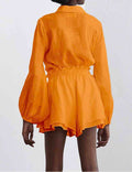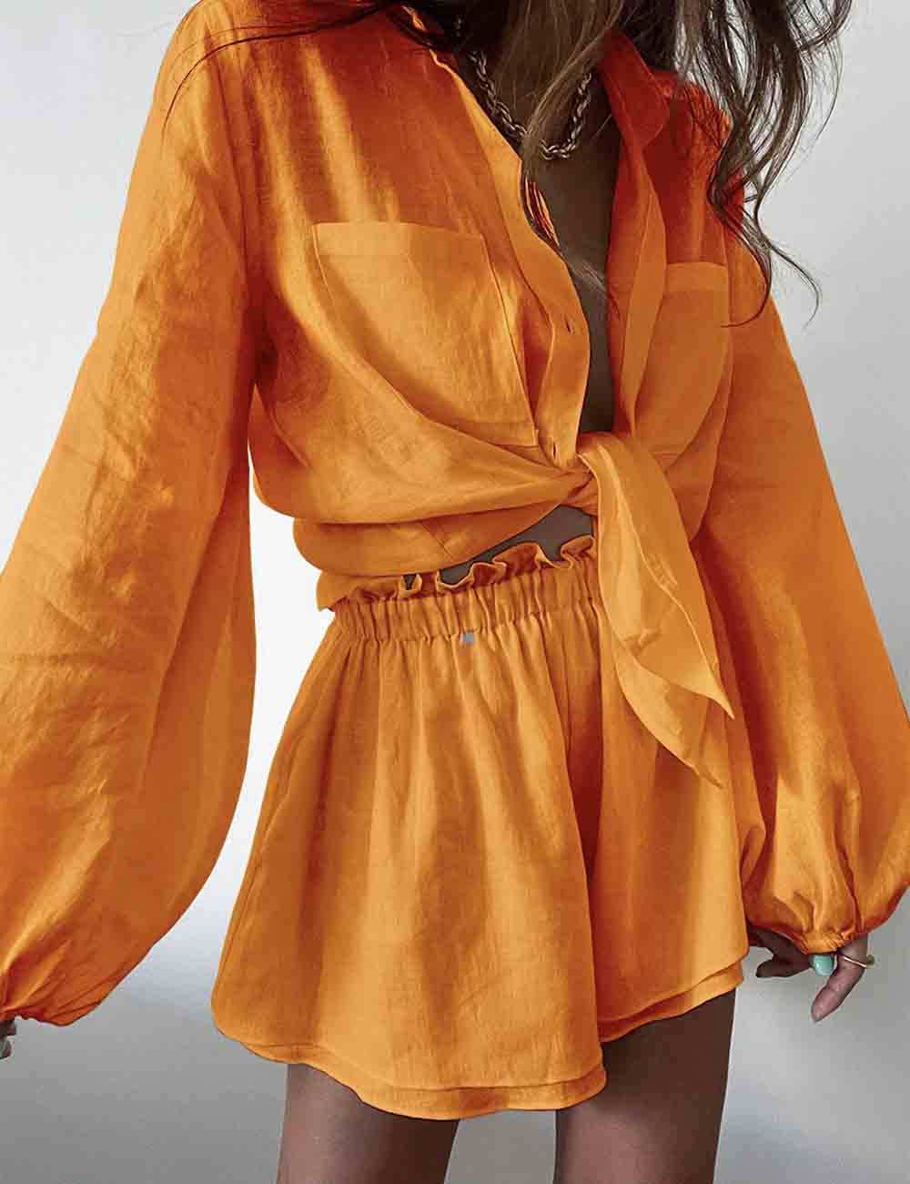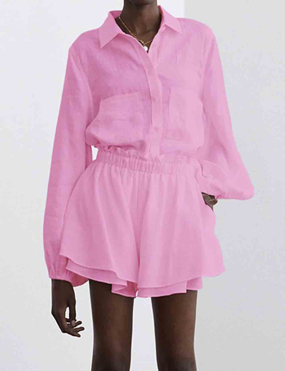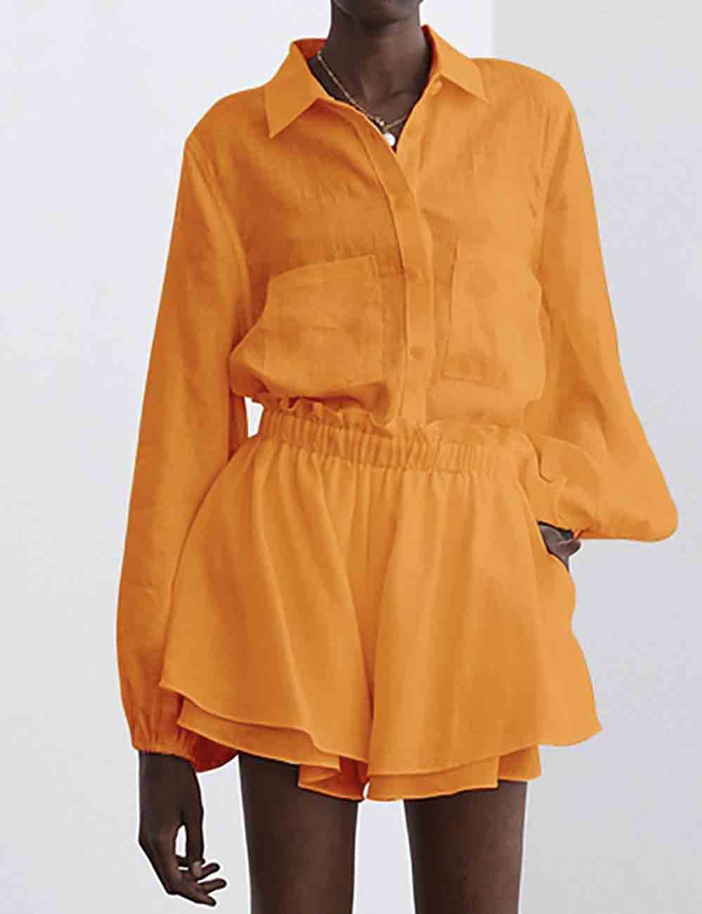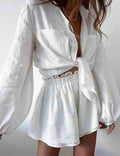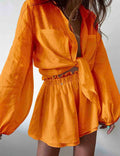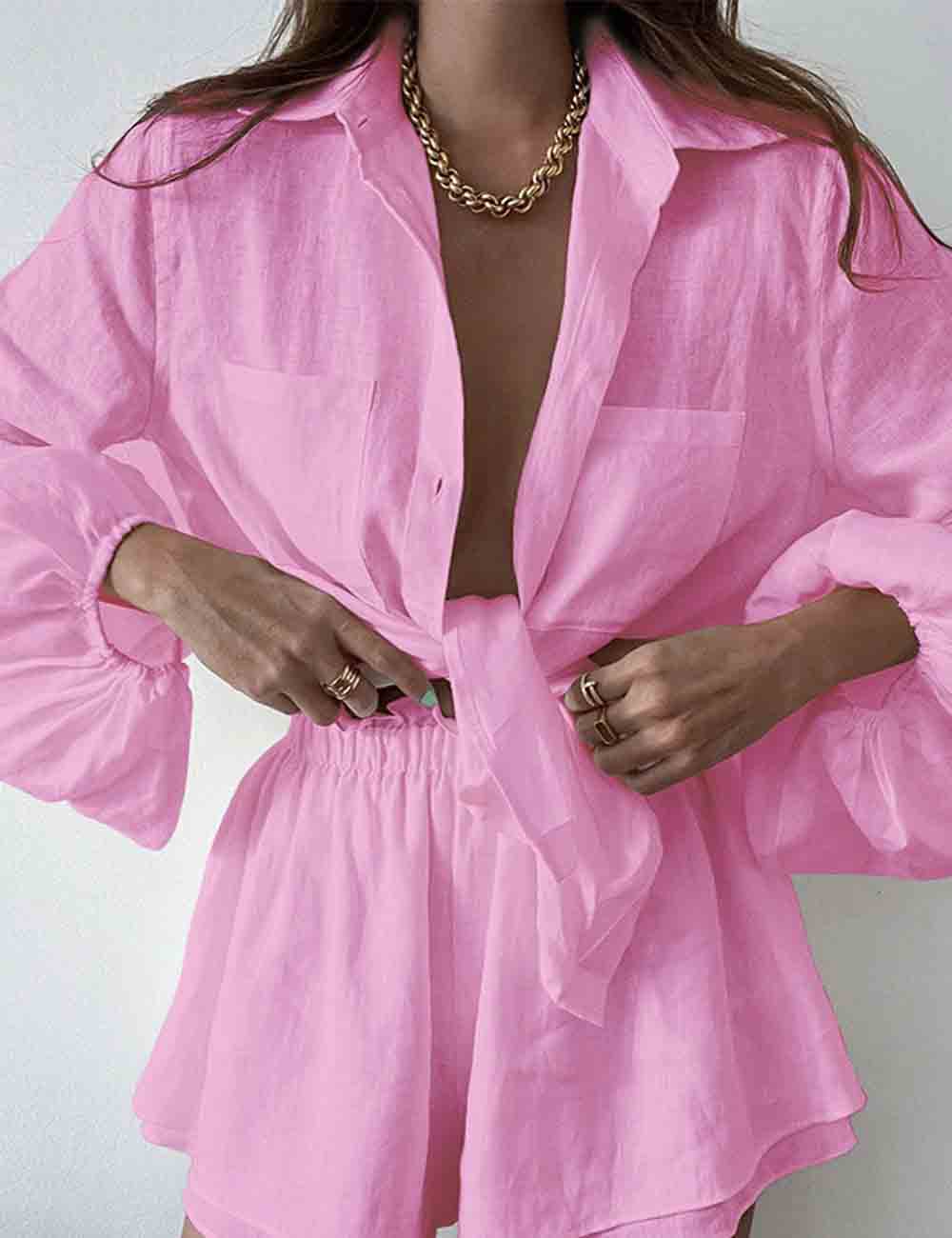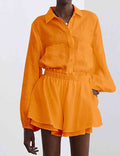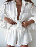 Ladies Turndown Collar Long Sleeves Loungewear Shirt &Shorts Set