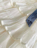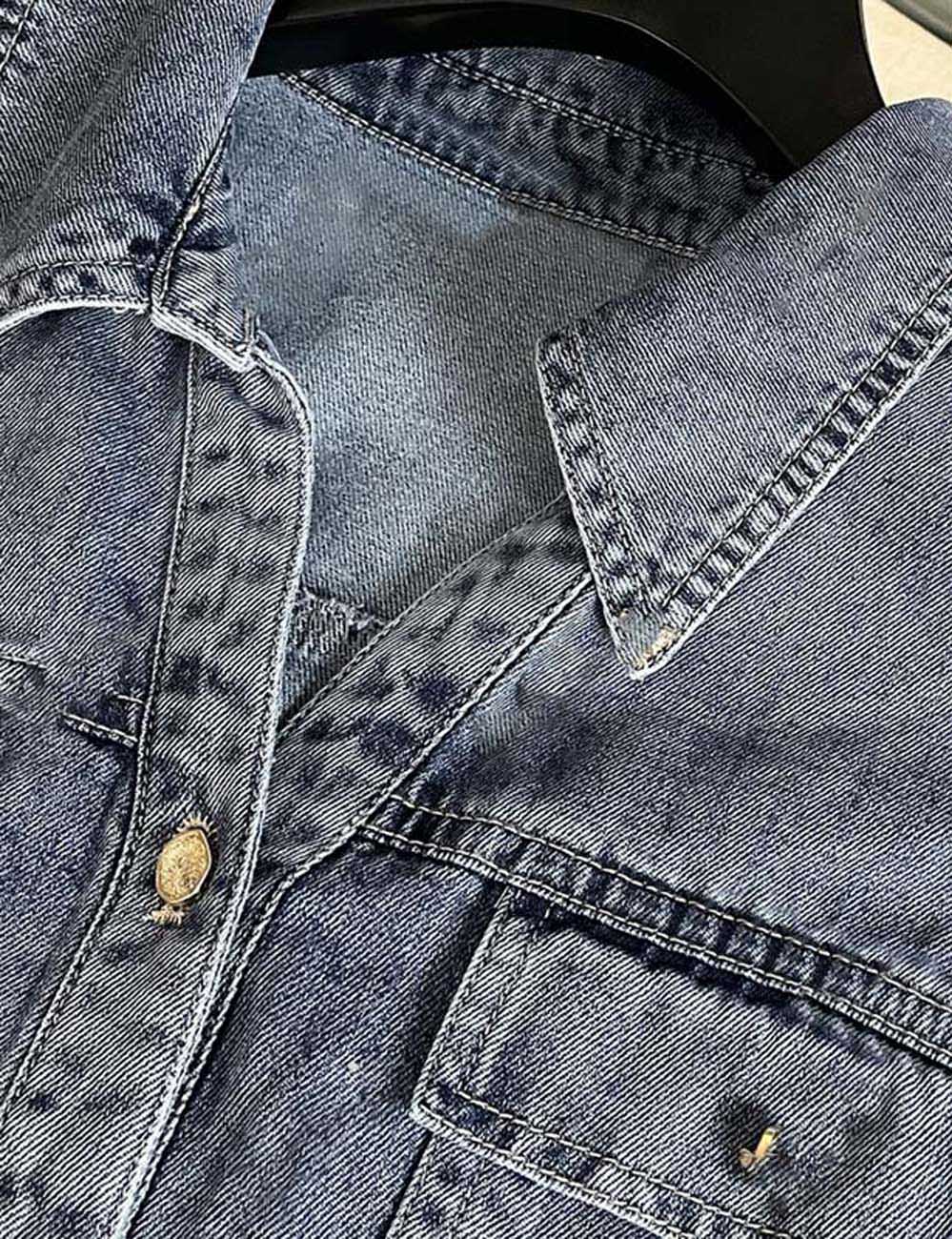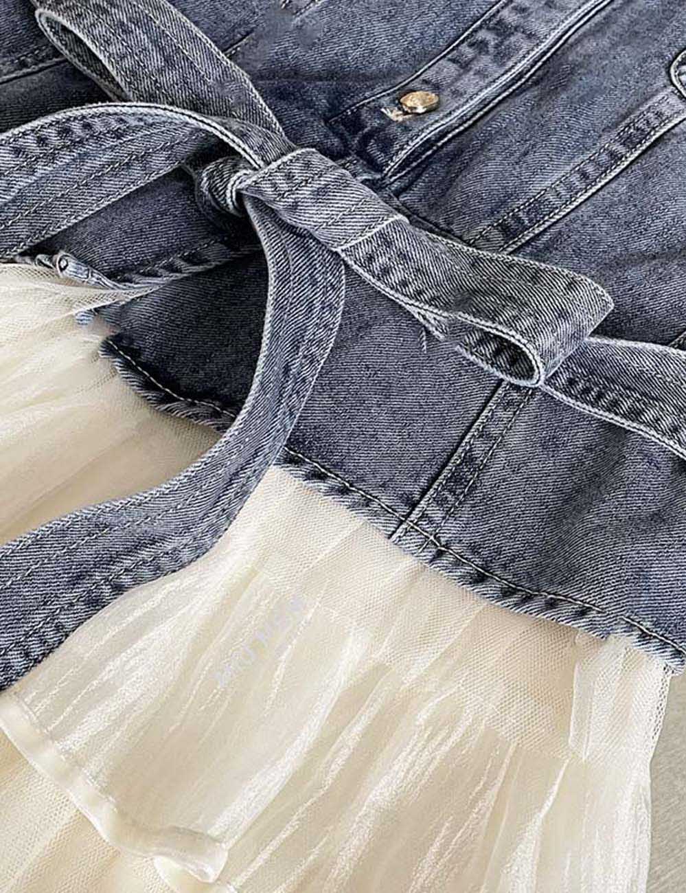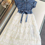 Ladies Turndown Collar Short Sleeves Denim Mesh Midi Dress