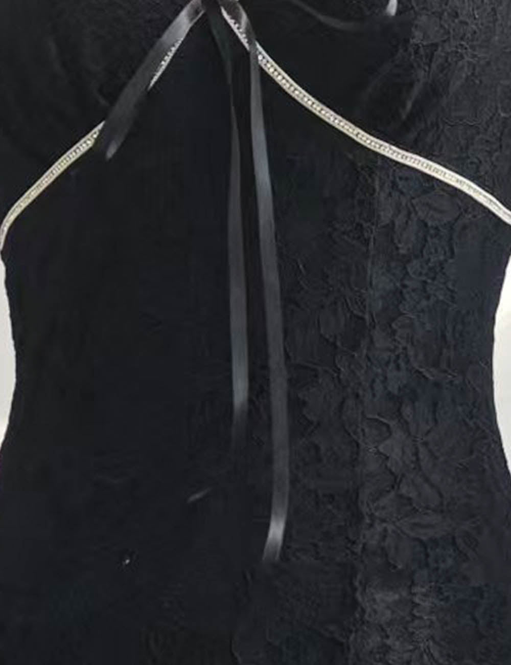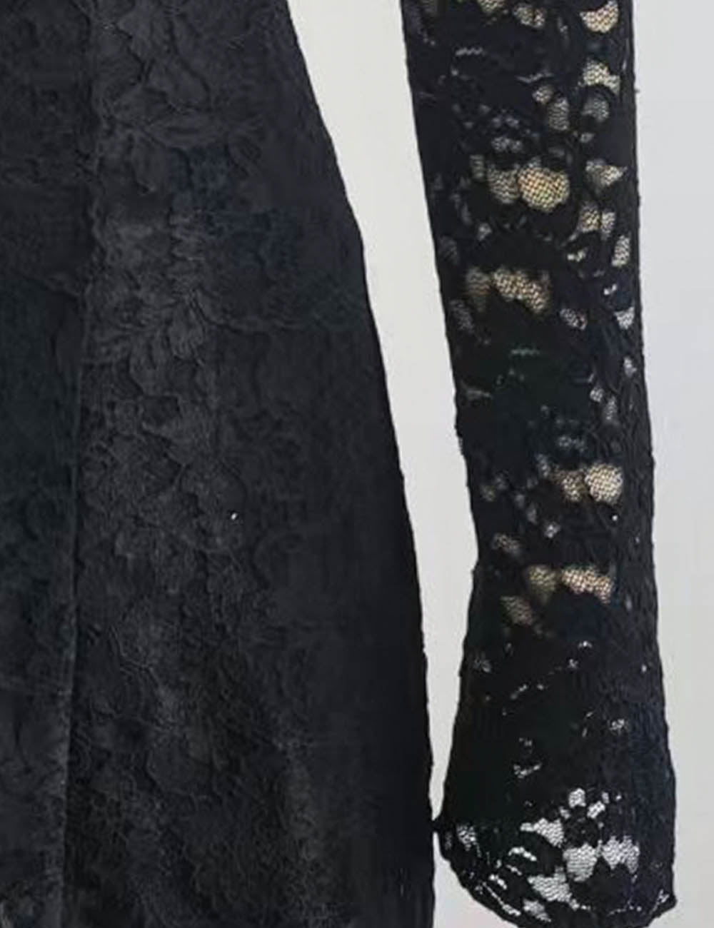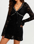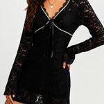 Ladies V-Neck Bow Tie Flared Sleeves Sheer Lace Mini Dress