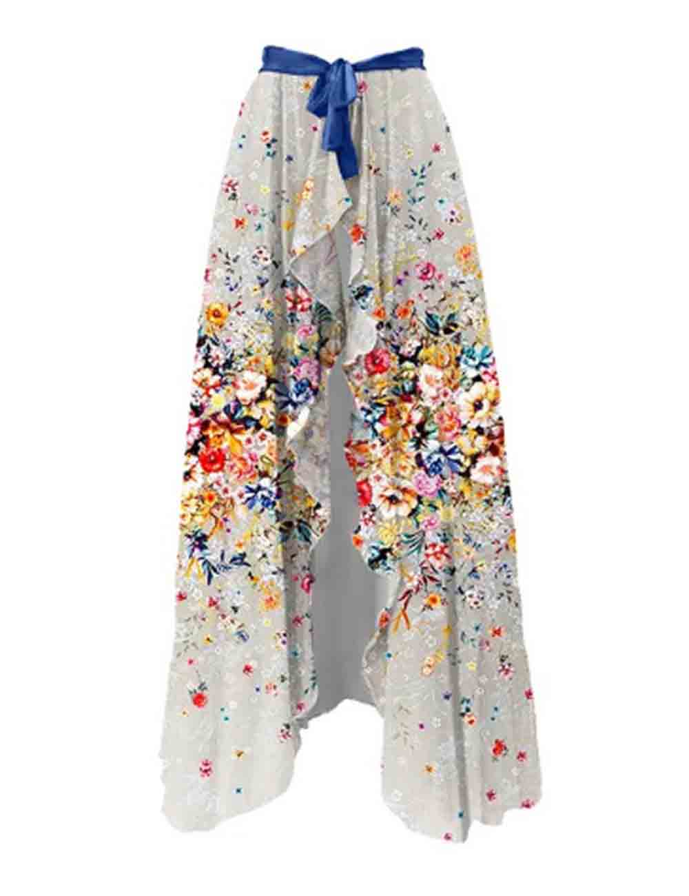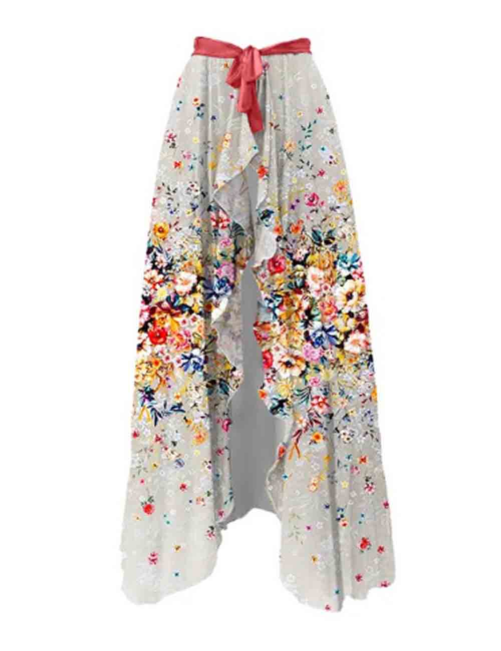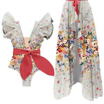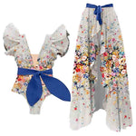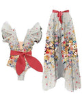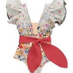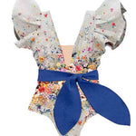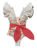 Ladies V-Neck Bowknot Floral Print One Piece Swimwear with Salong
