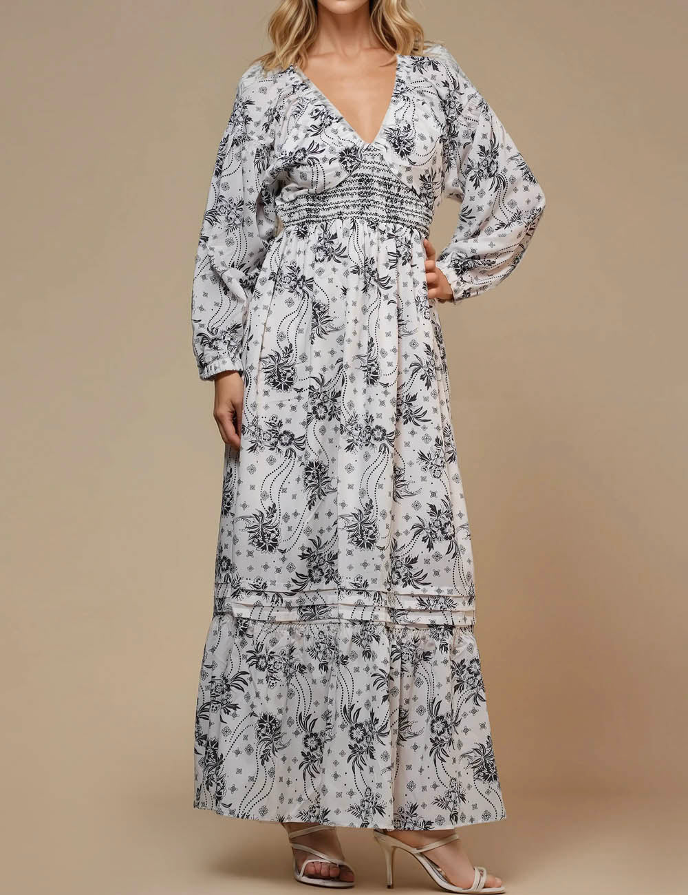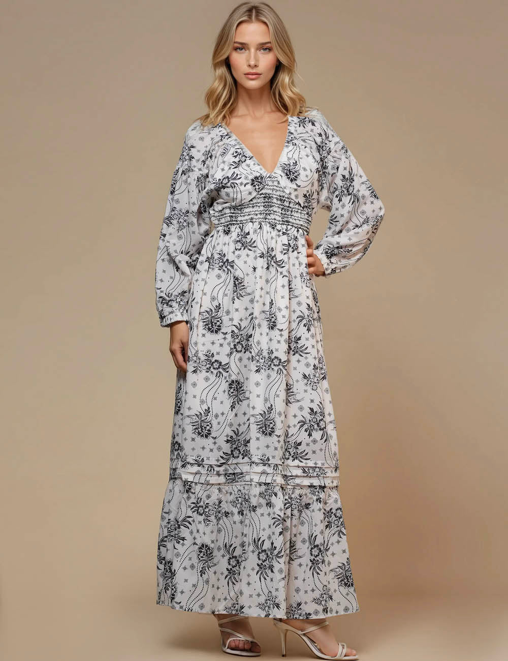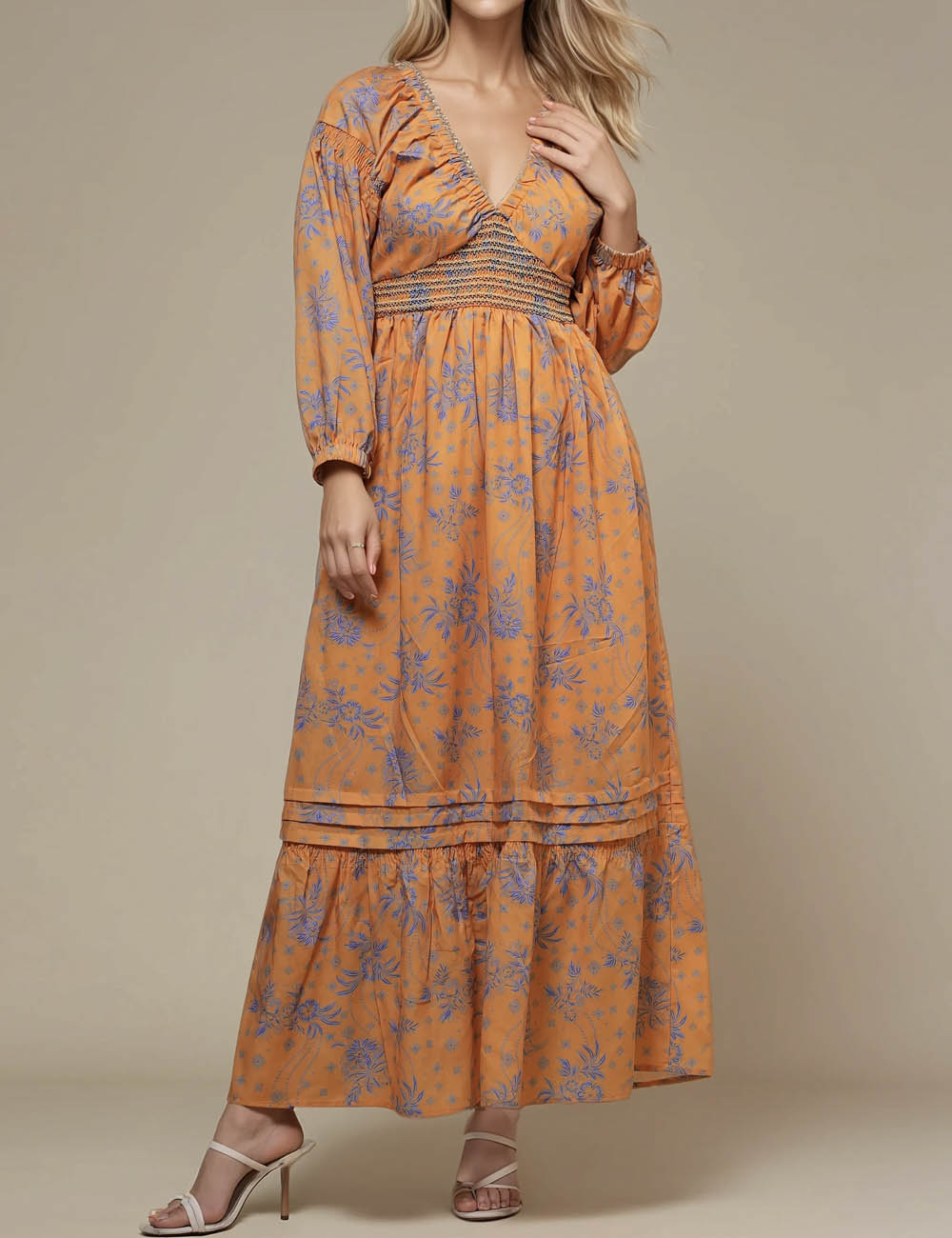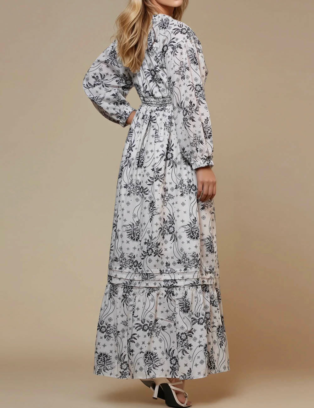 Ladies V-Neck Bubble Sleeves Floral Maxi Dress SKD50414