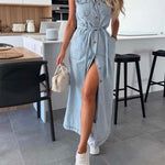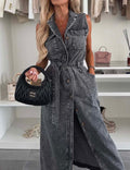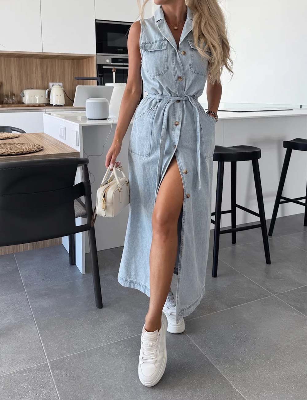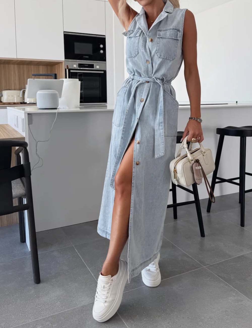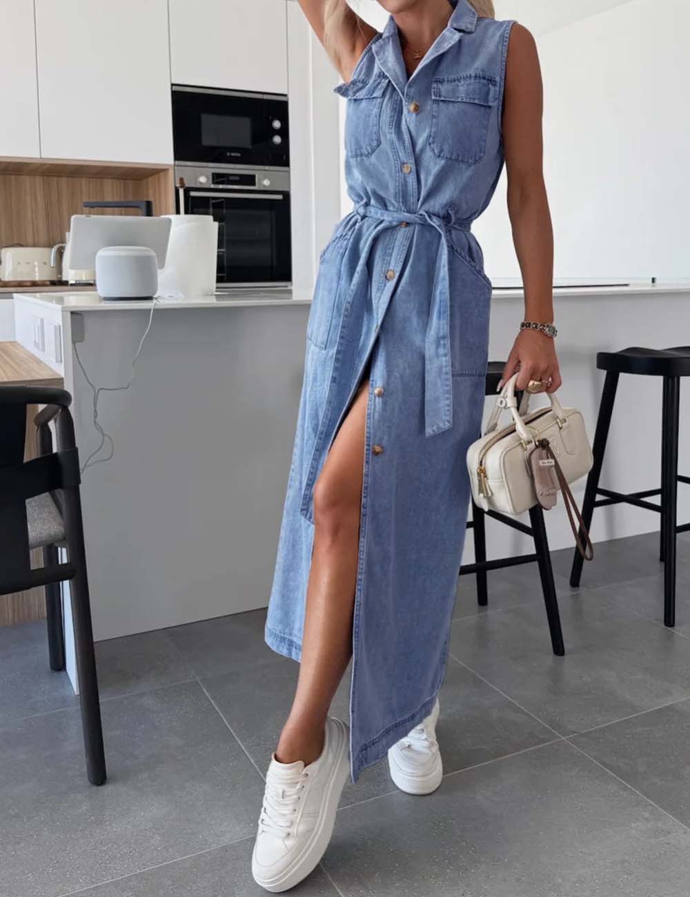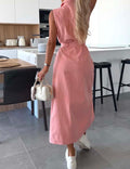 Ladies V-Neck Button String Tie Sleeveless Denim Midi Dress