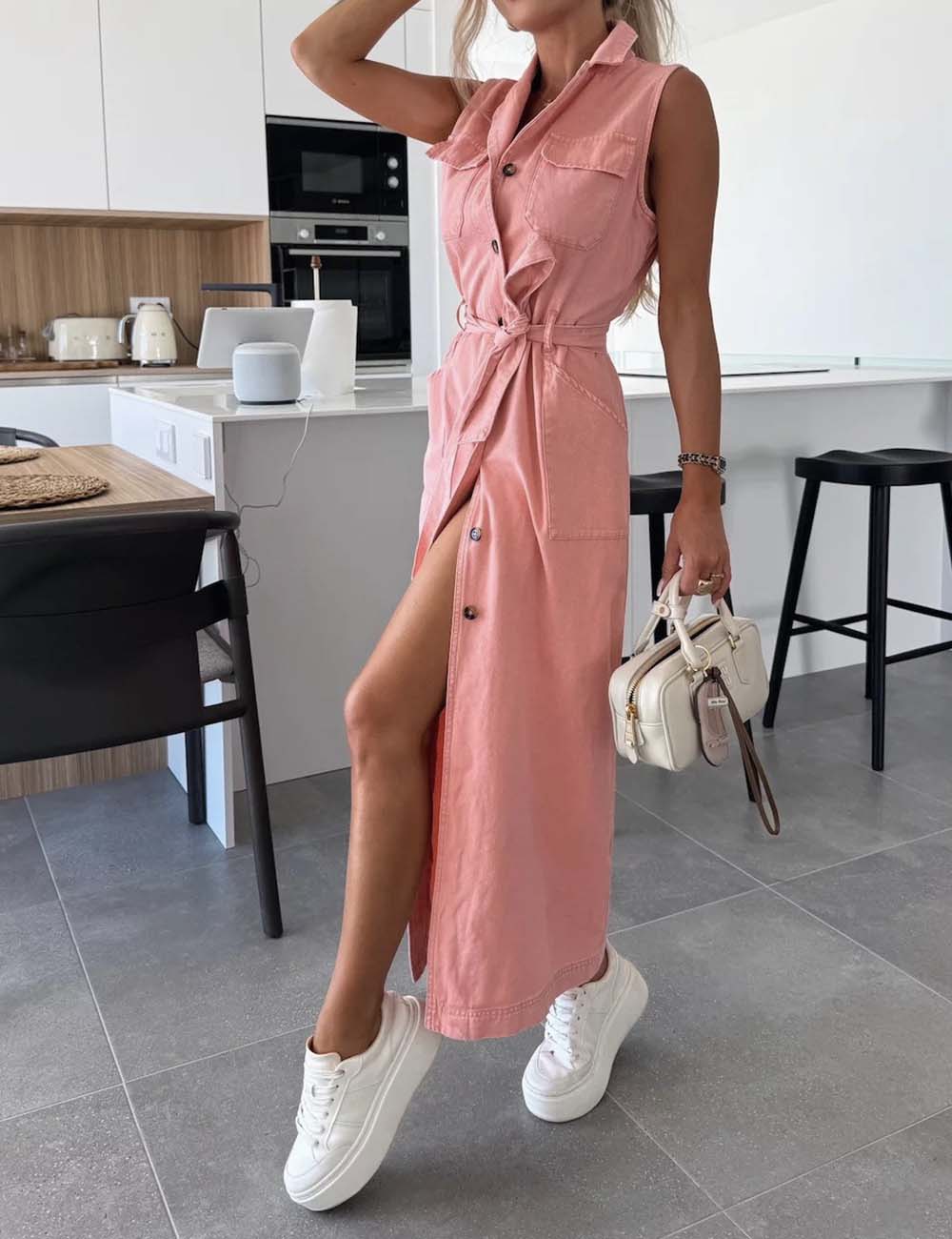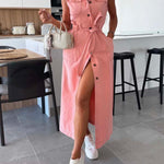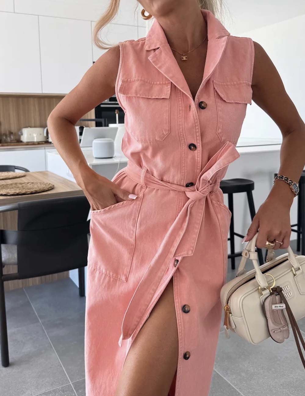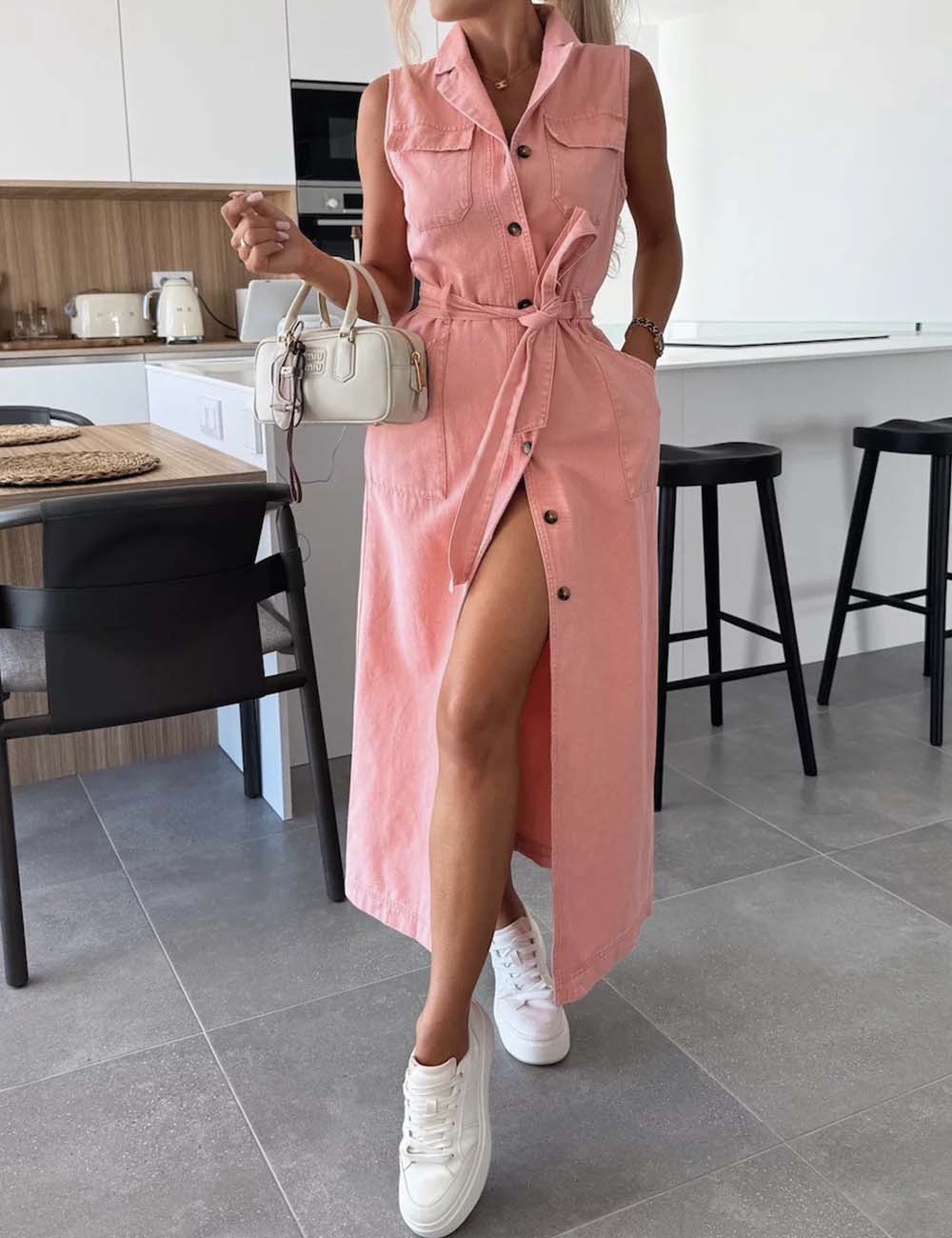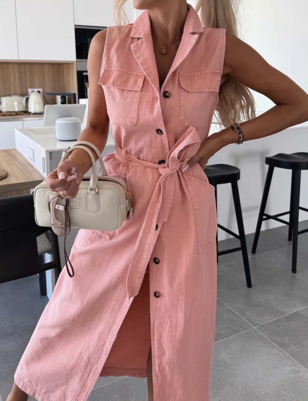 Ladies V-Neck Button String Tie Sleeveless Denim Midi Dress