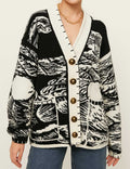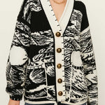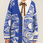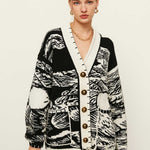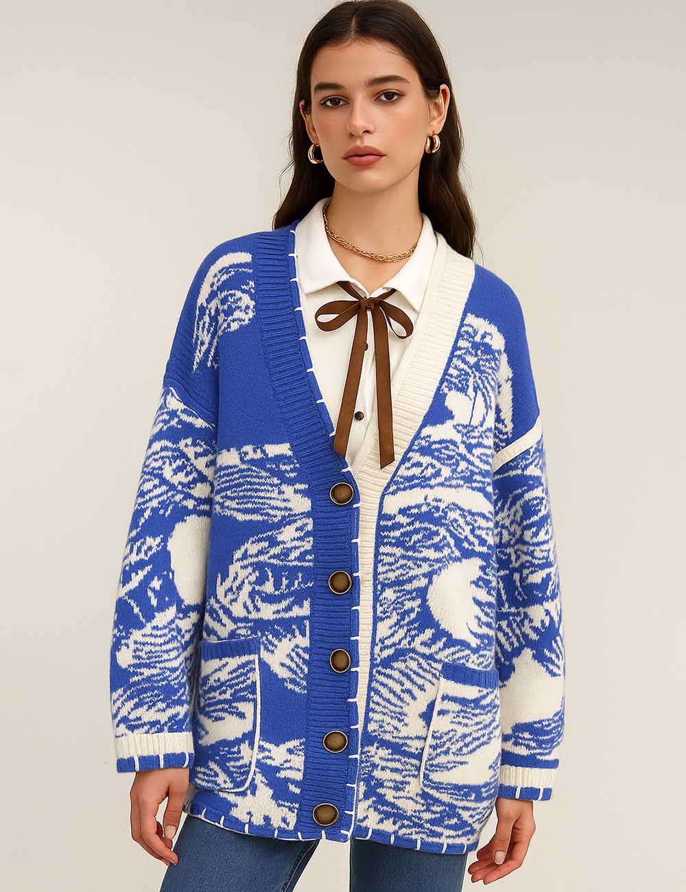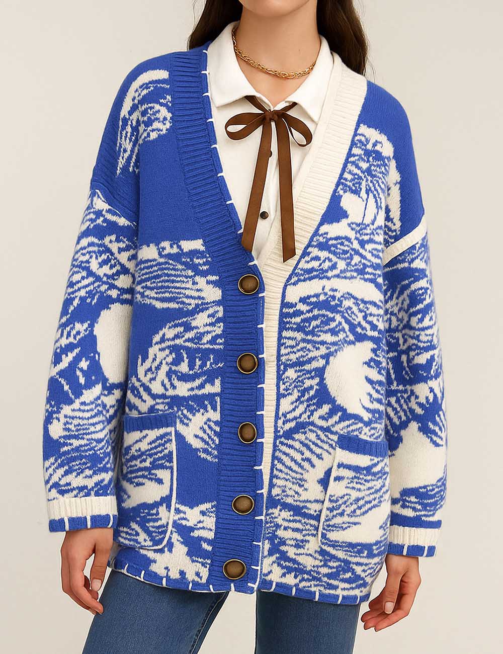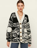 Ladies V-Neck Color Block Abstract Pattern Button Cardigan
