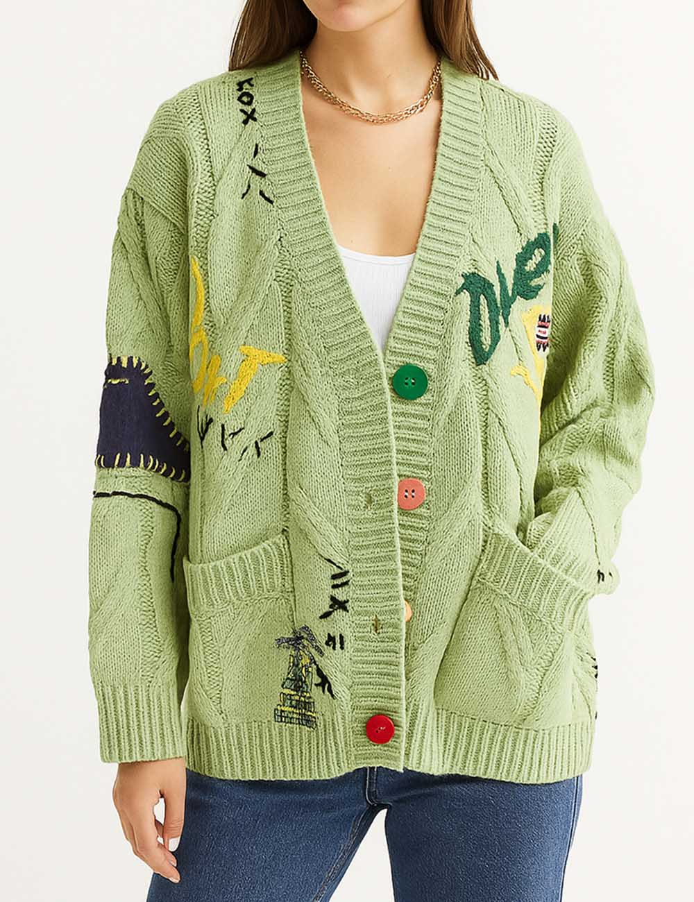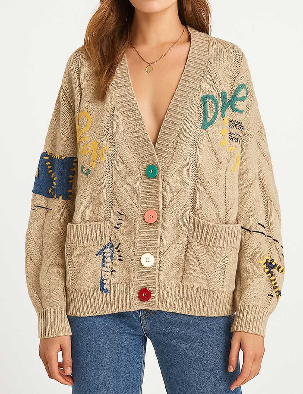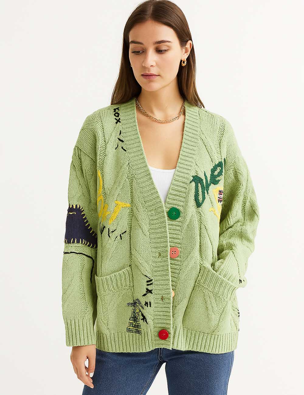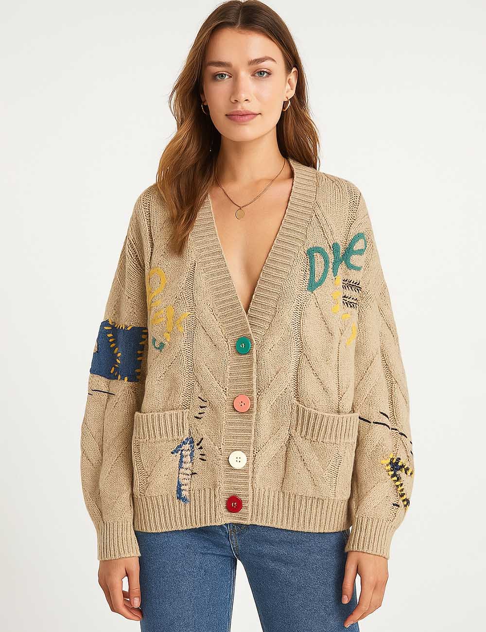 Ladies V-Neck Embroidery Sweater Button Long Sleeves Cable Knit Cardigan