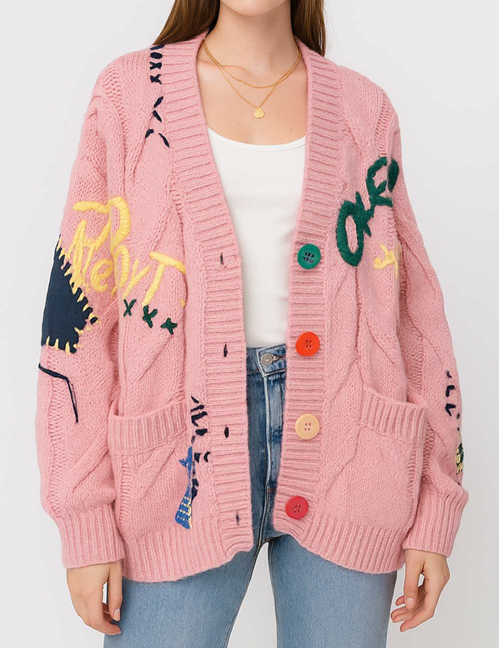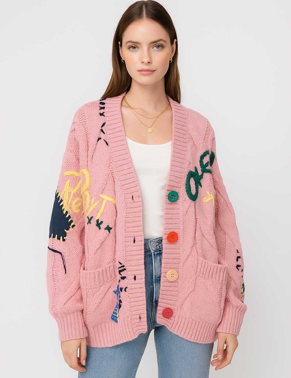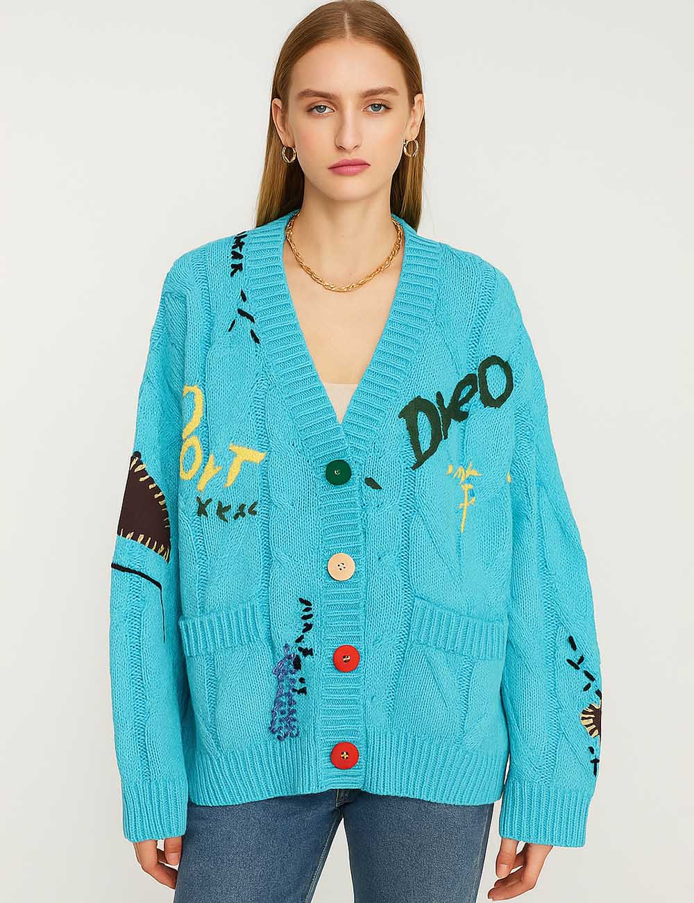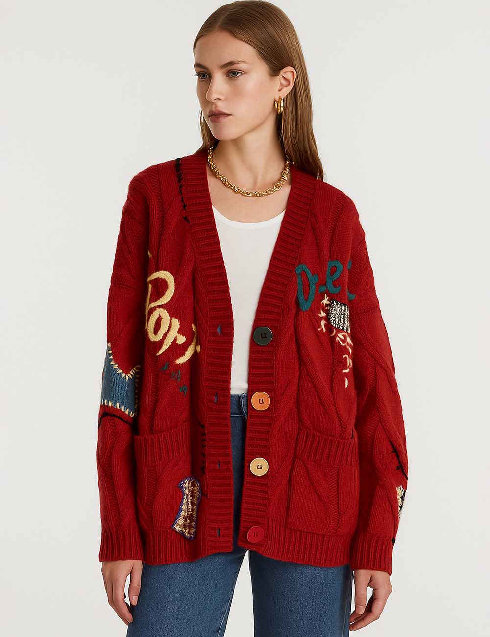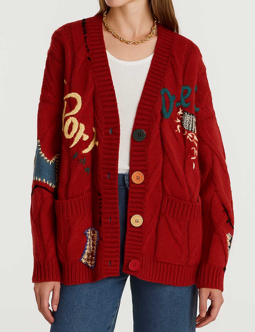 Ladies V-Neck Embroidery Sweater Button Long Sleeves Cable Knit Cardigan