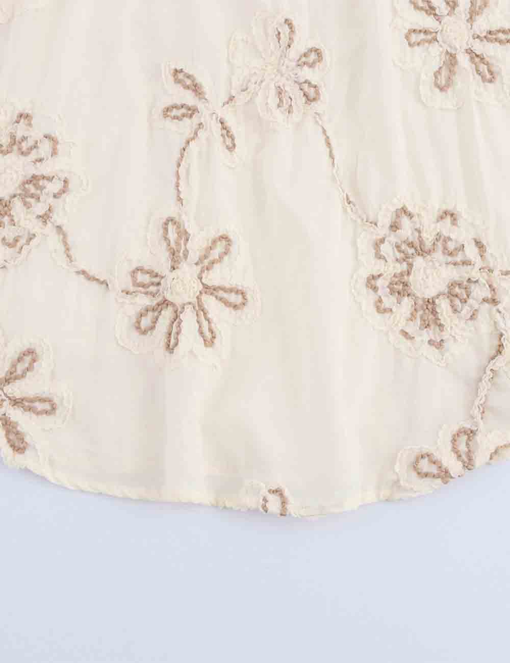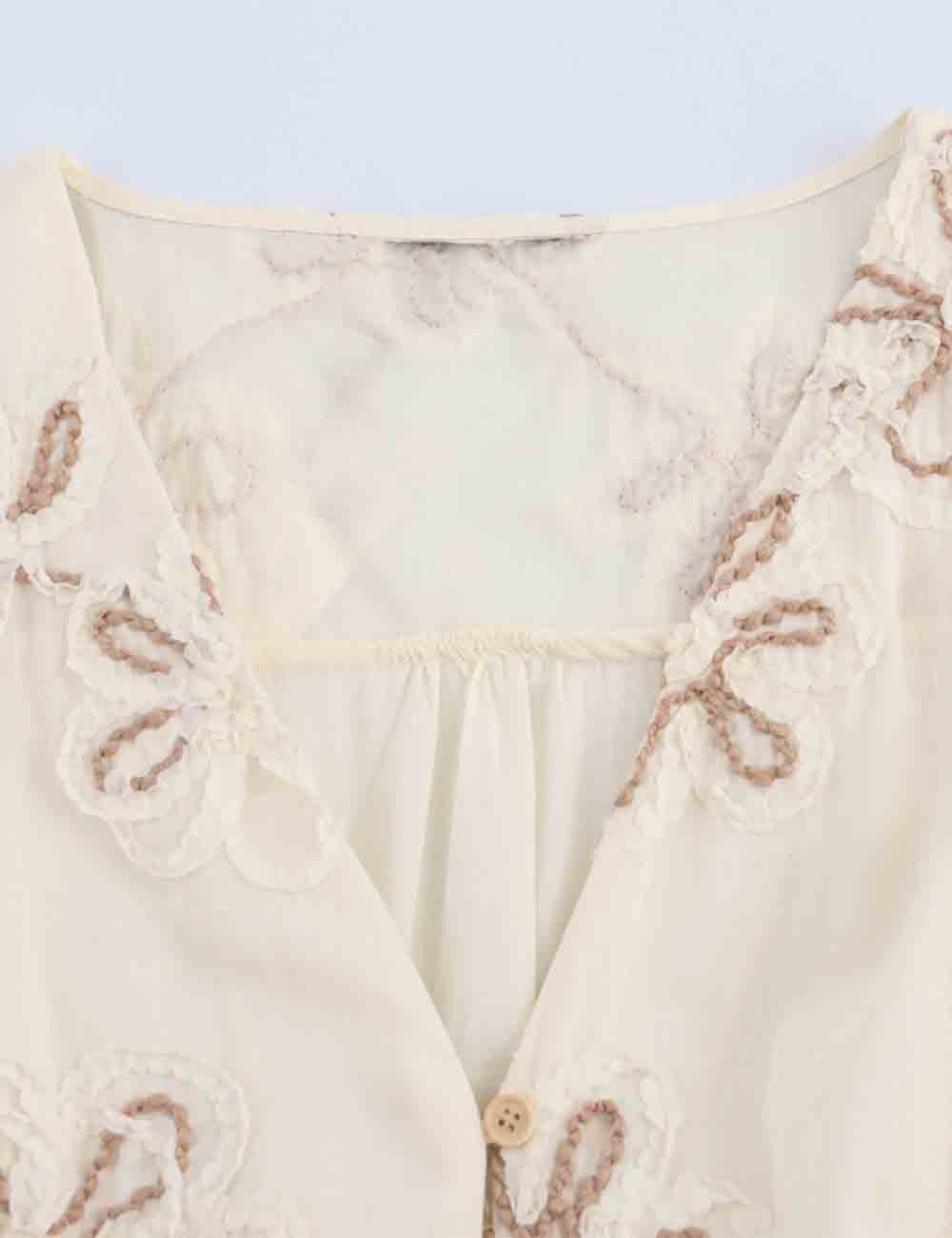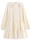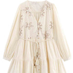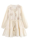 Ladies V-Neck Floral Embroidery Gathering Tie Waist Mini Dress
