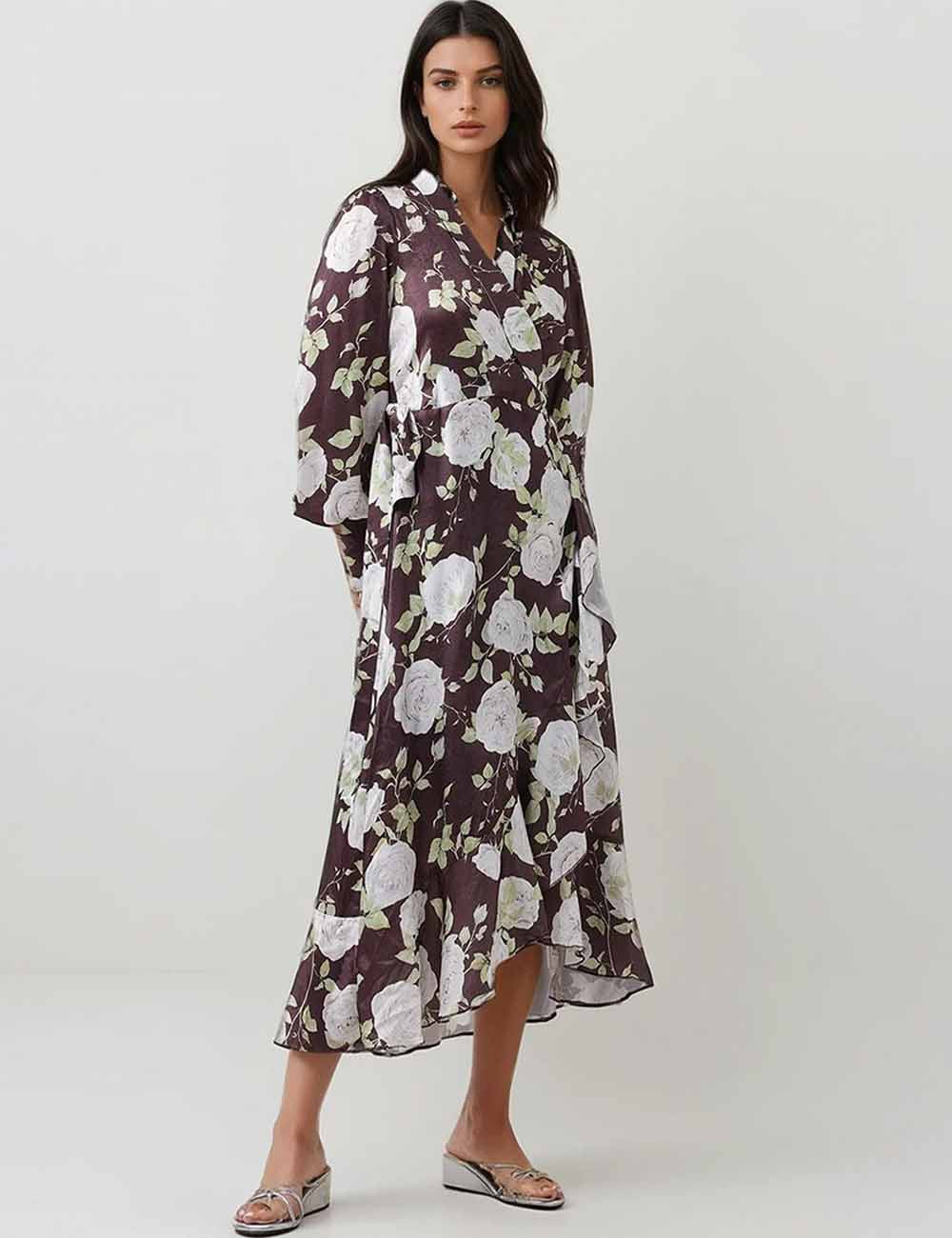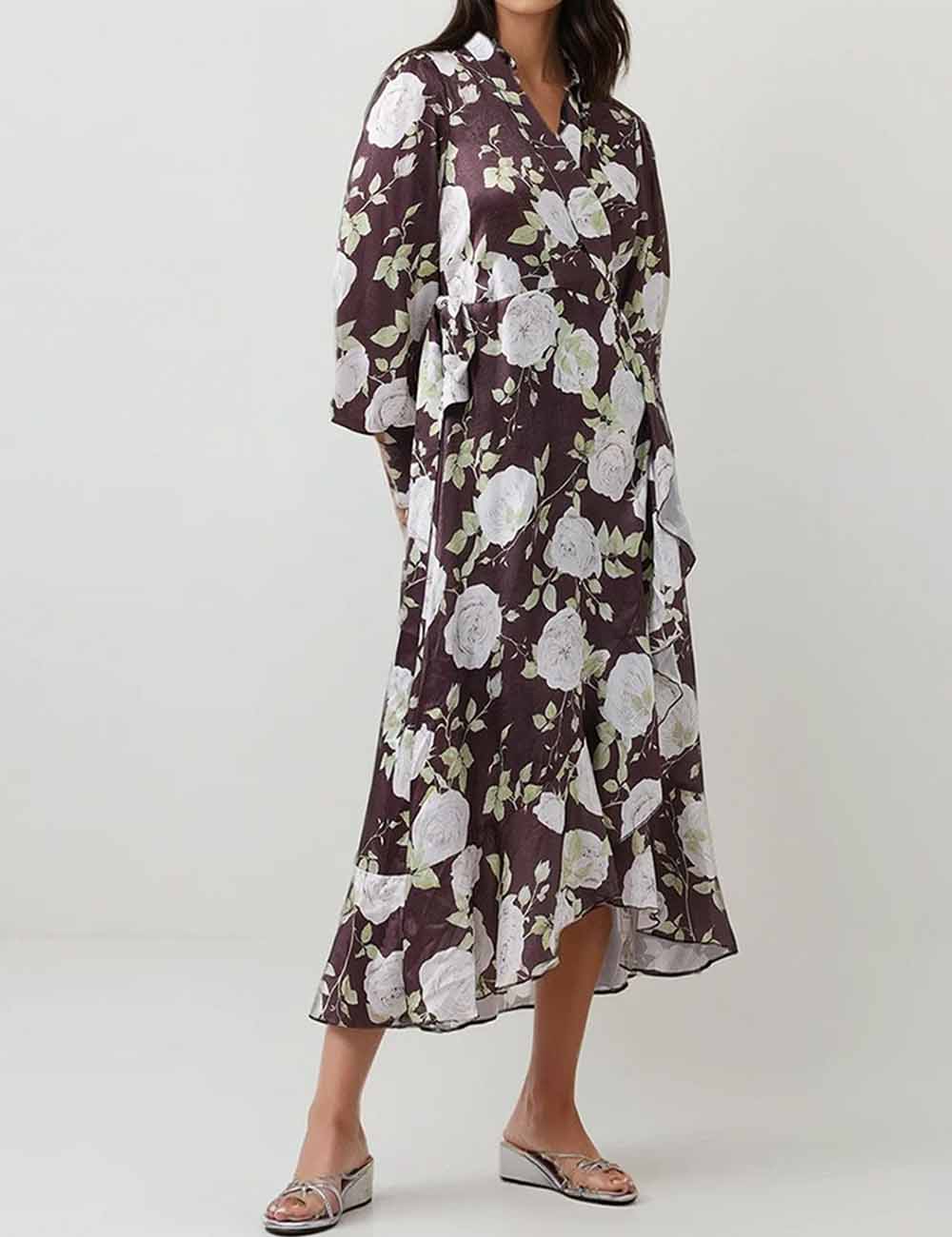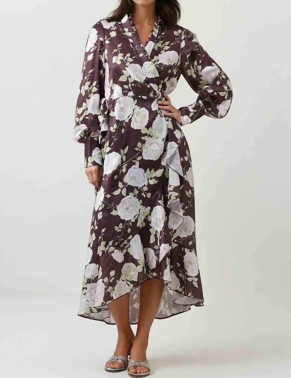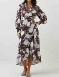 Ladies V-Neck Floral Print Ruffle Wrap Maxi Dress