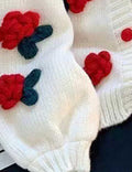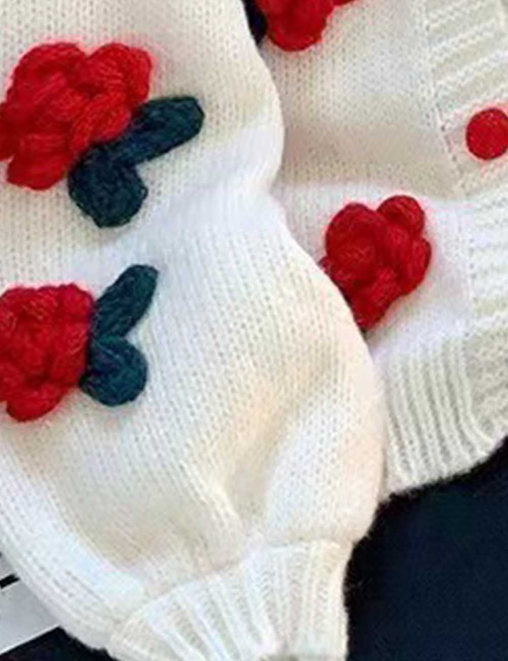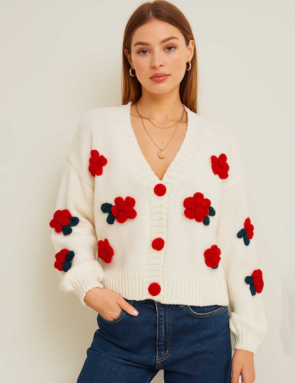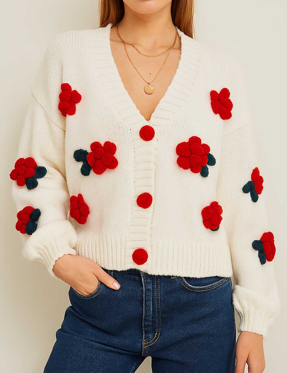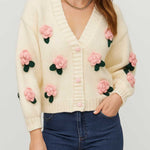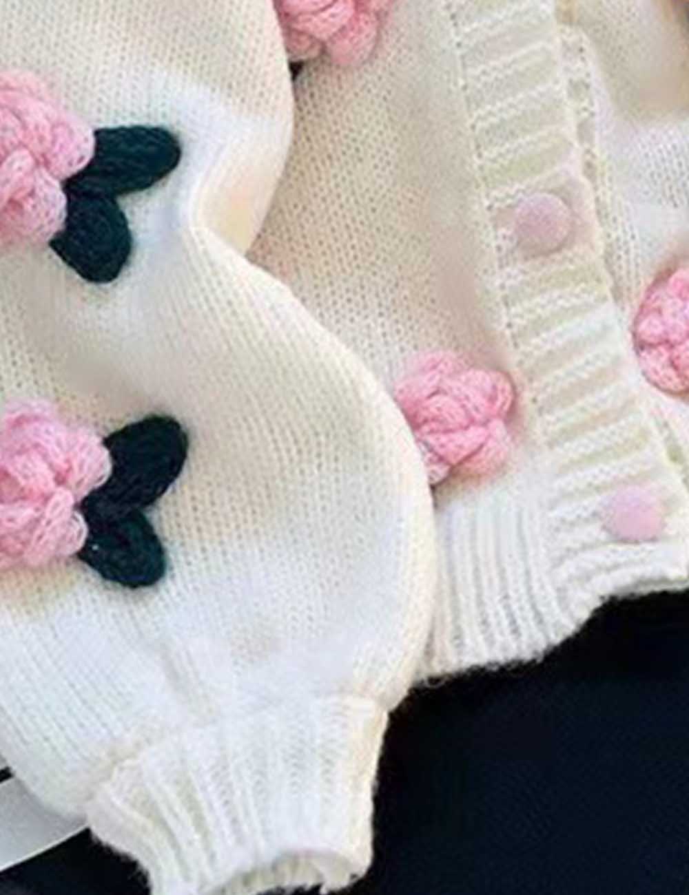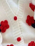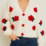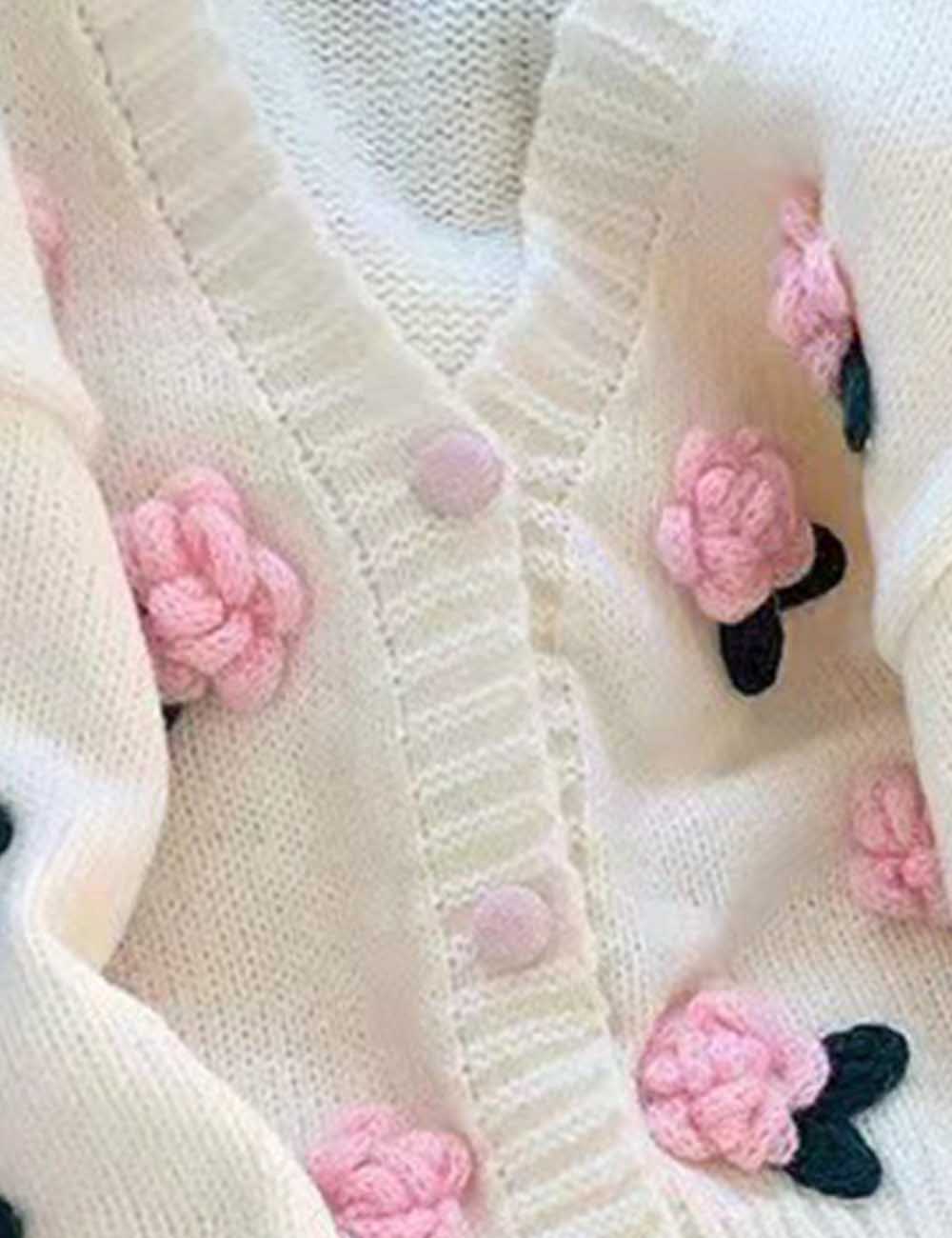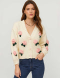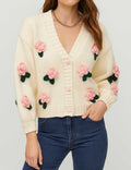 Ladies V-Neck Flower Button Closure Long Sleeves Cardigan