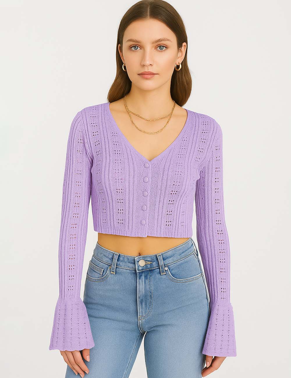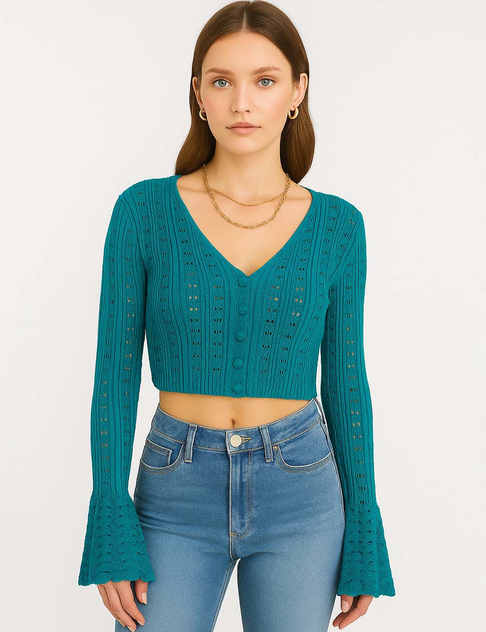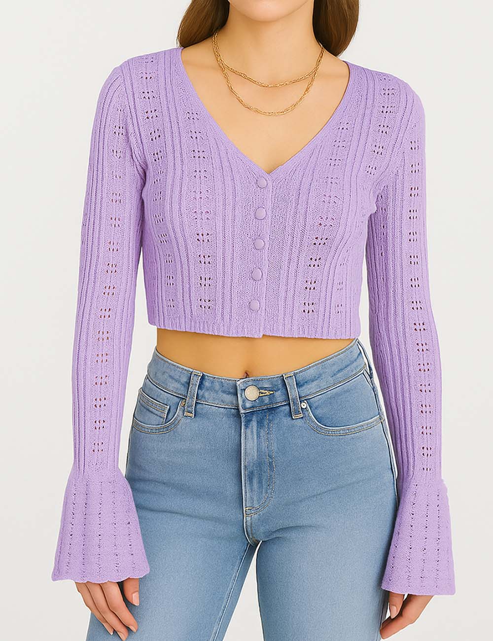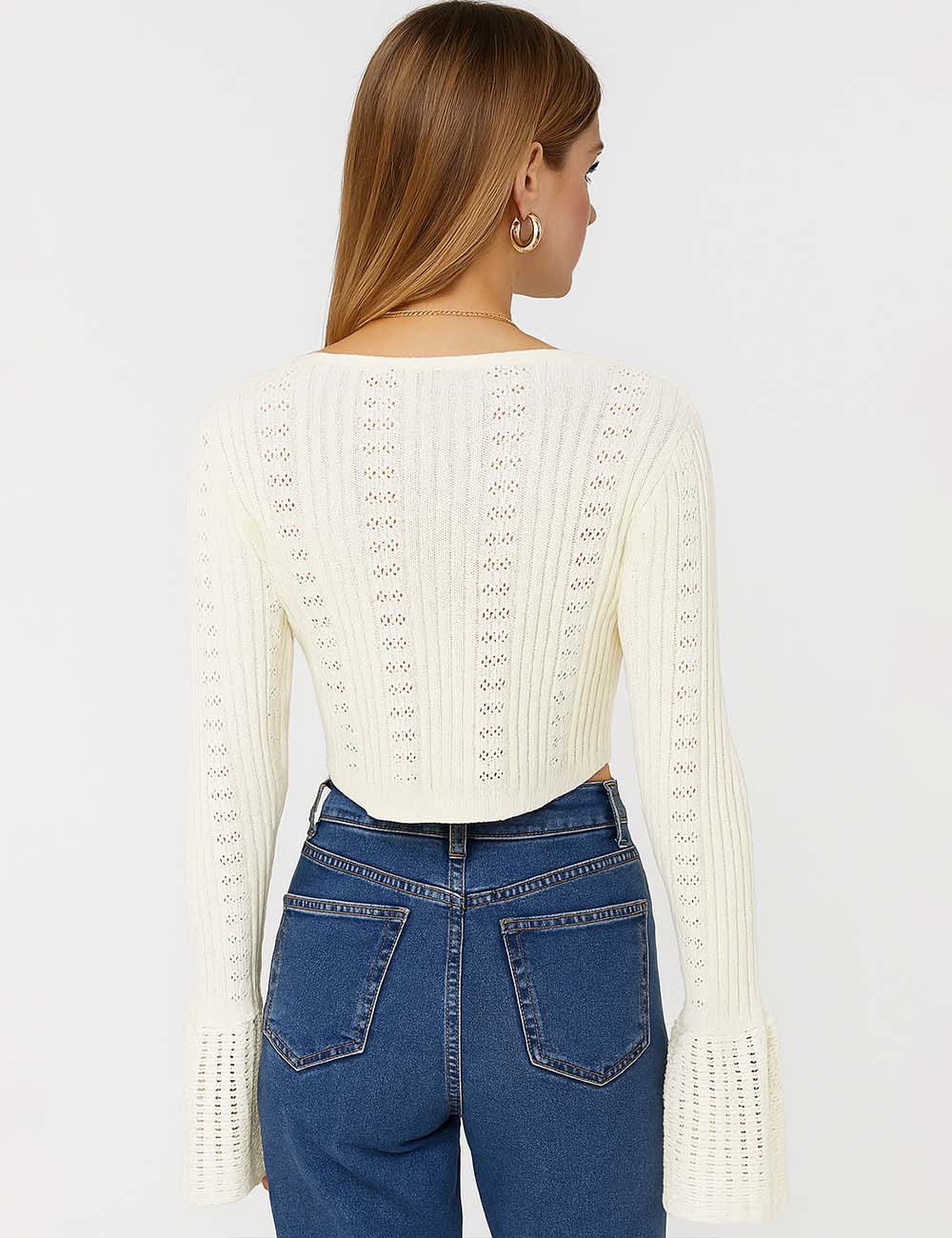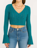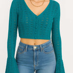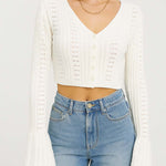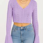 Ladies V-Neck Hollow Out Flared Sleeves Cropped Knit Top