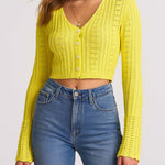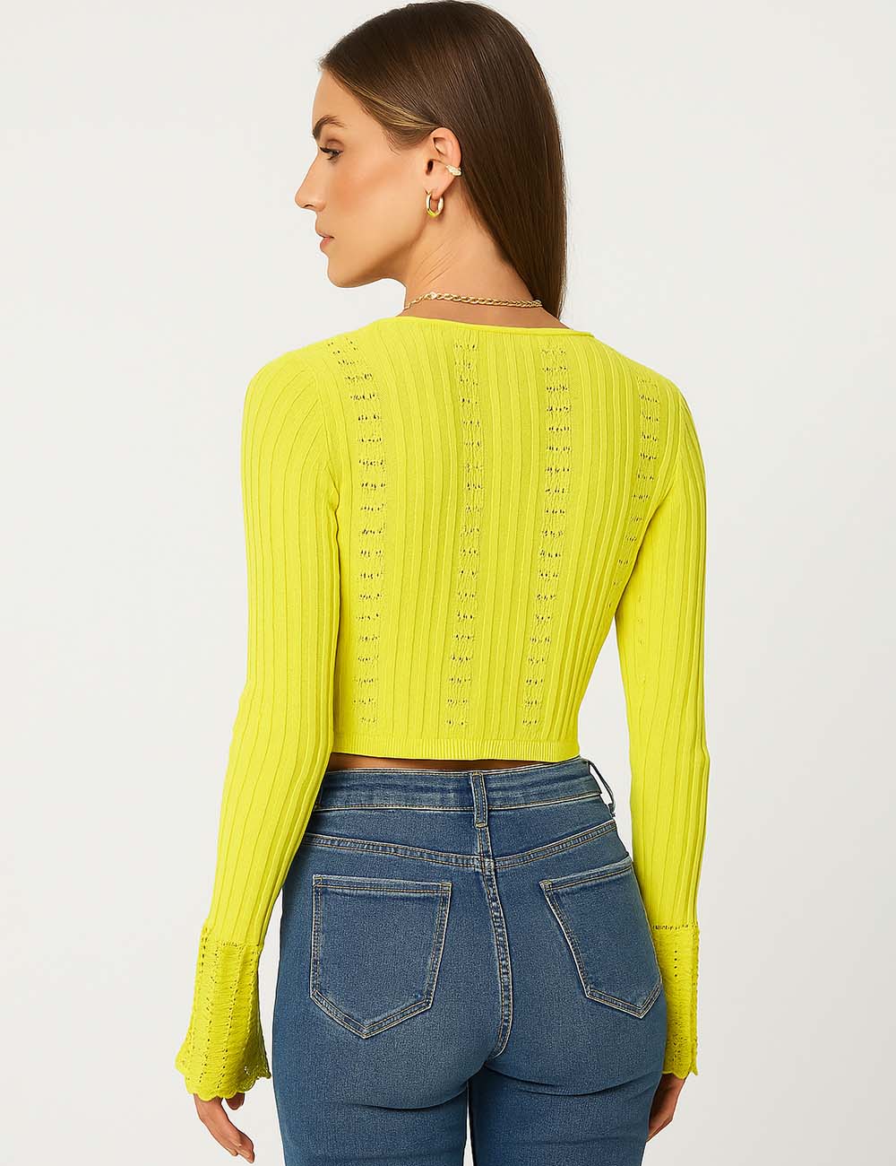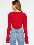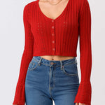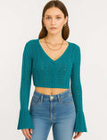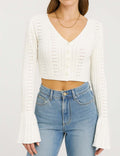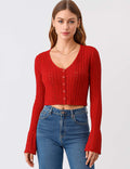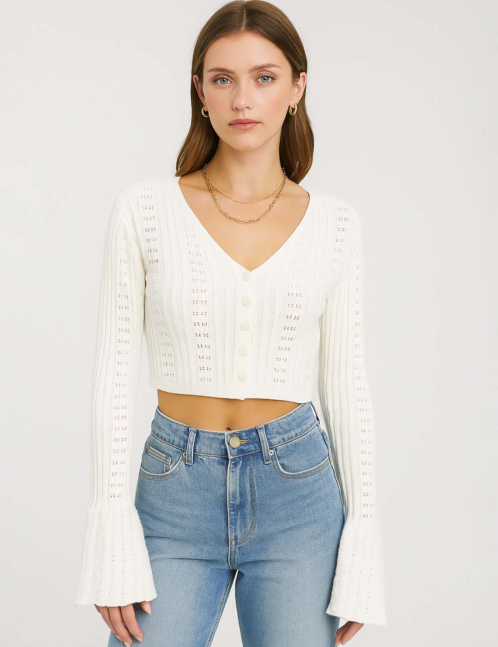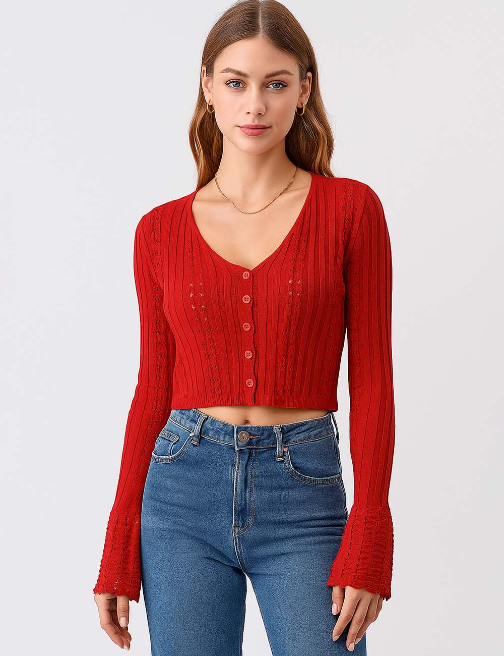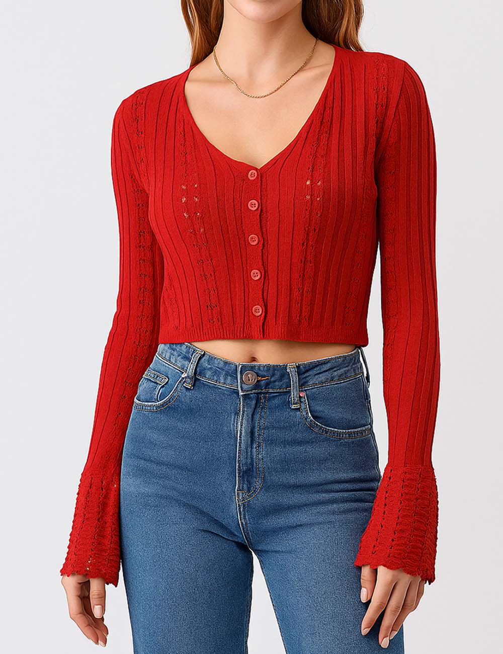 Ladies V-Neck Hollow Out Flared Sleeves Cropped Knit Top