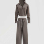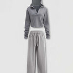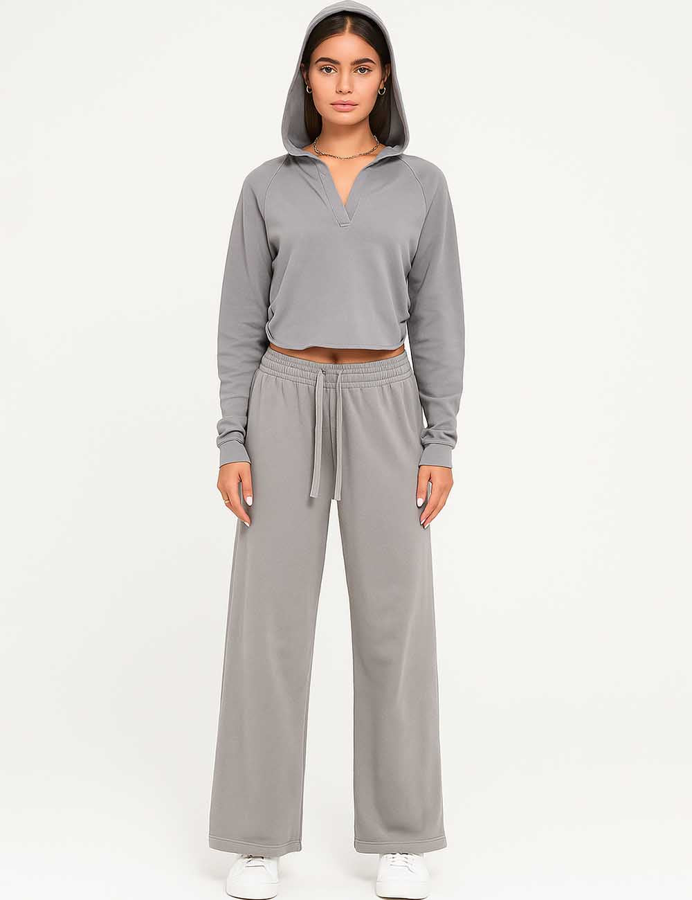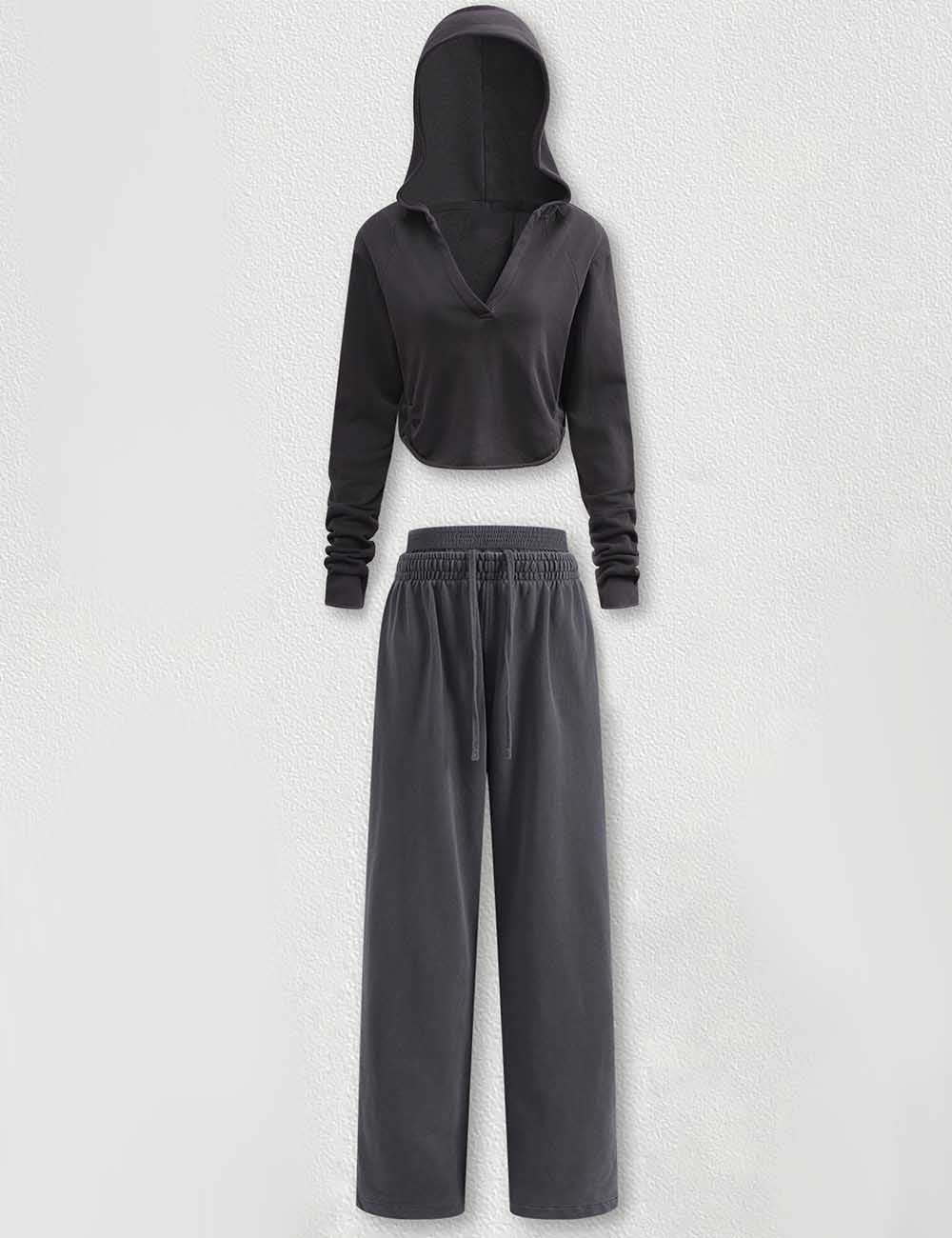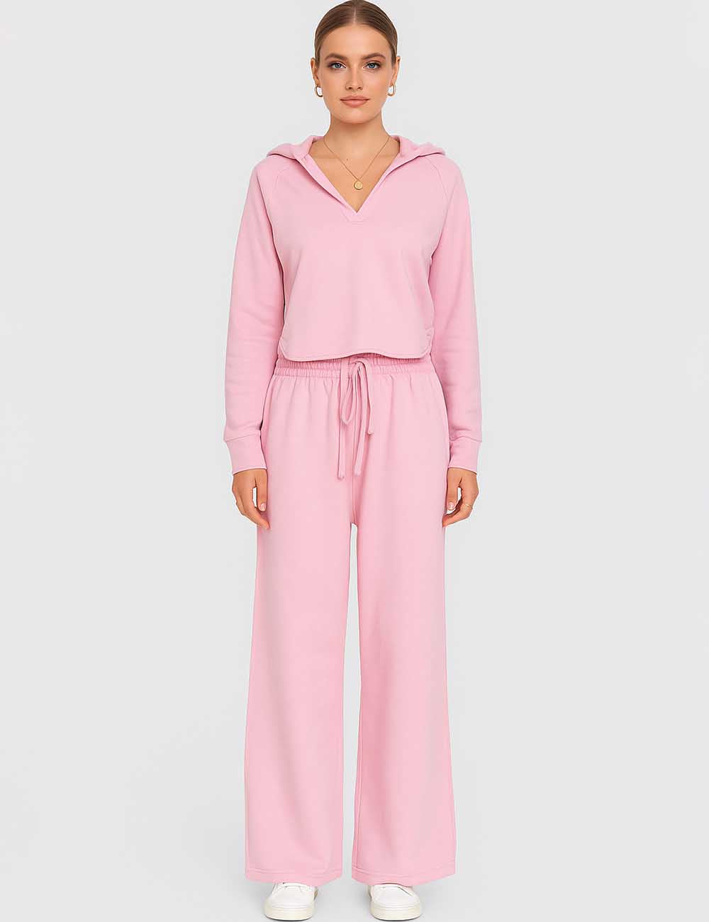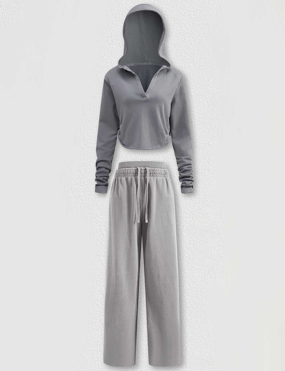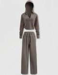 Ladies V-Neck Hooded Wide Leg Sweatshirt & Pants 2PCS Set