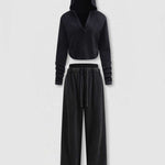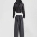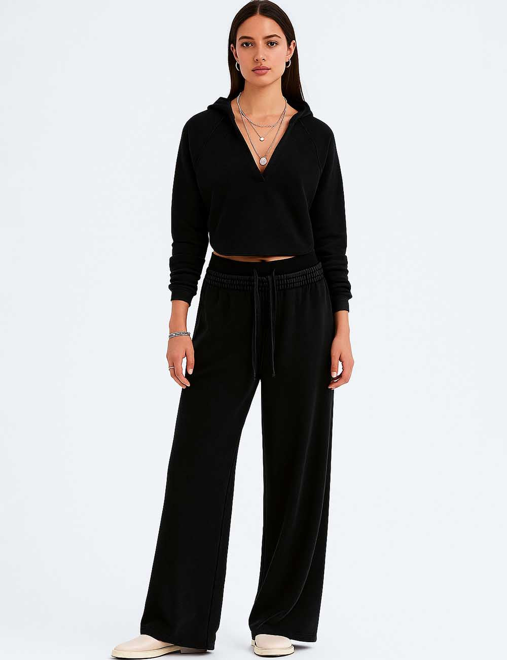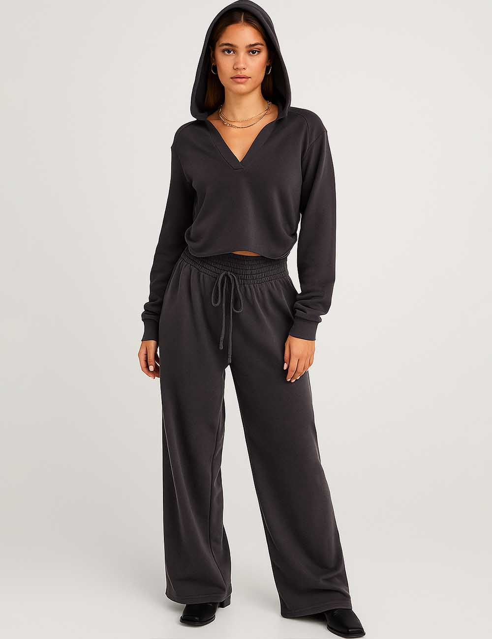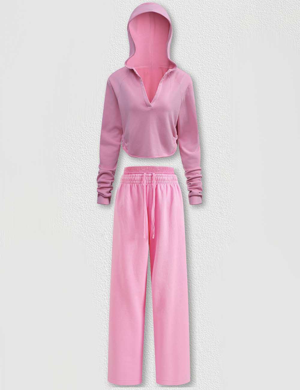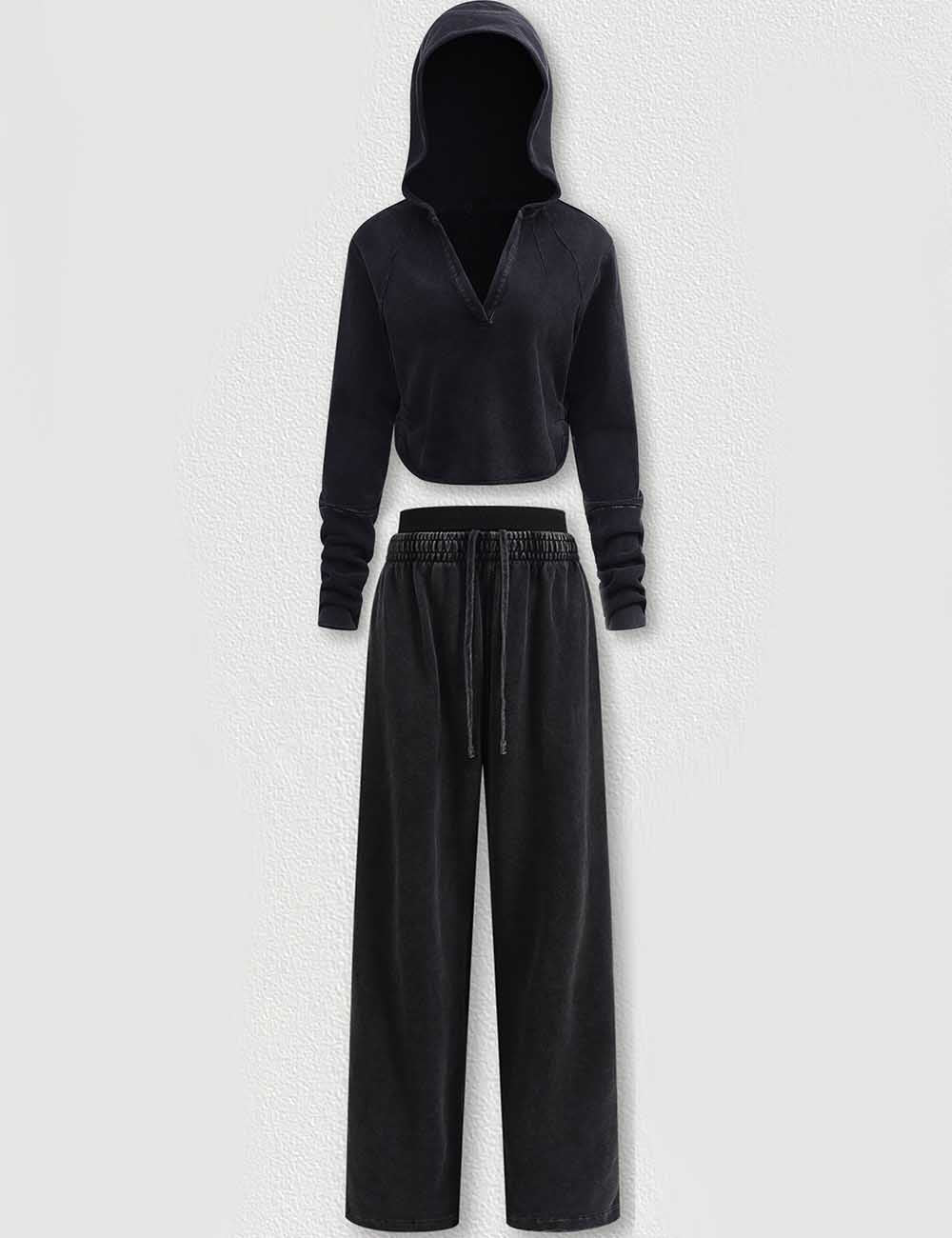 Ladies V-Neck Hooded Wide Leg Sweatshirt & Pants 2PCS Set