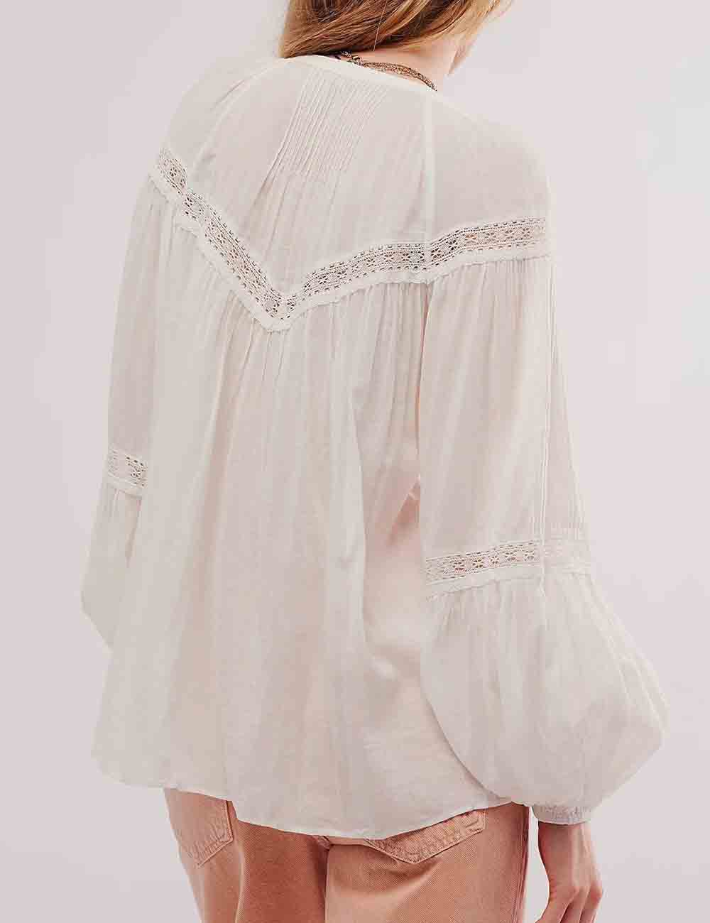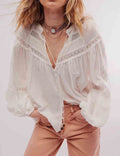 Ladies V-Neck Lace Eyelet Long Sleeves Blouse