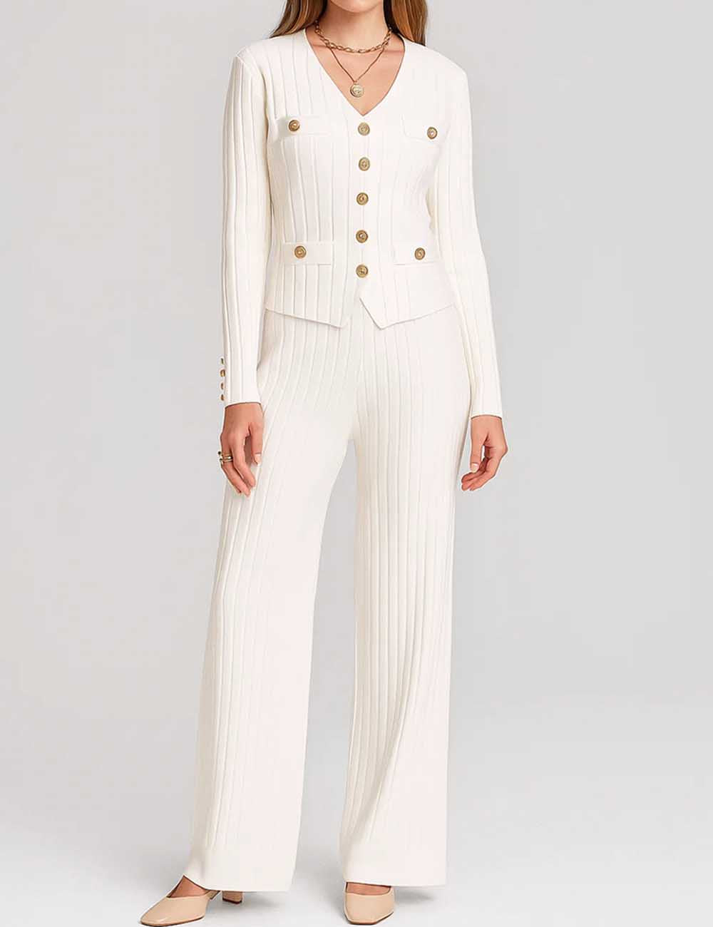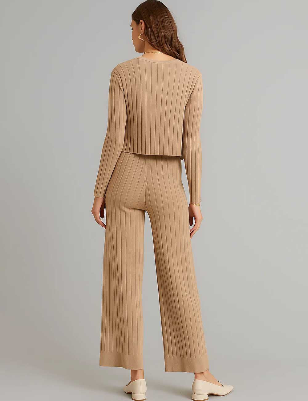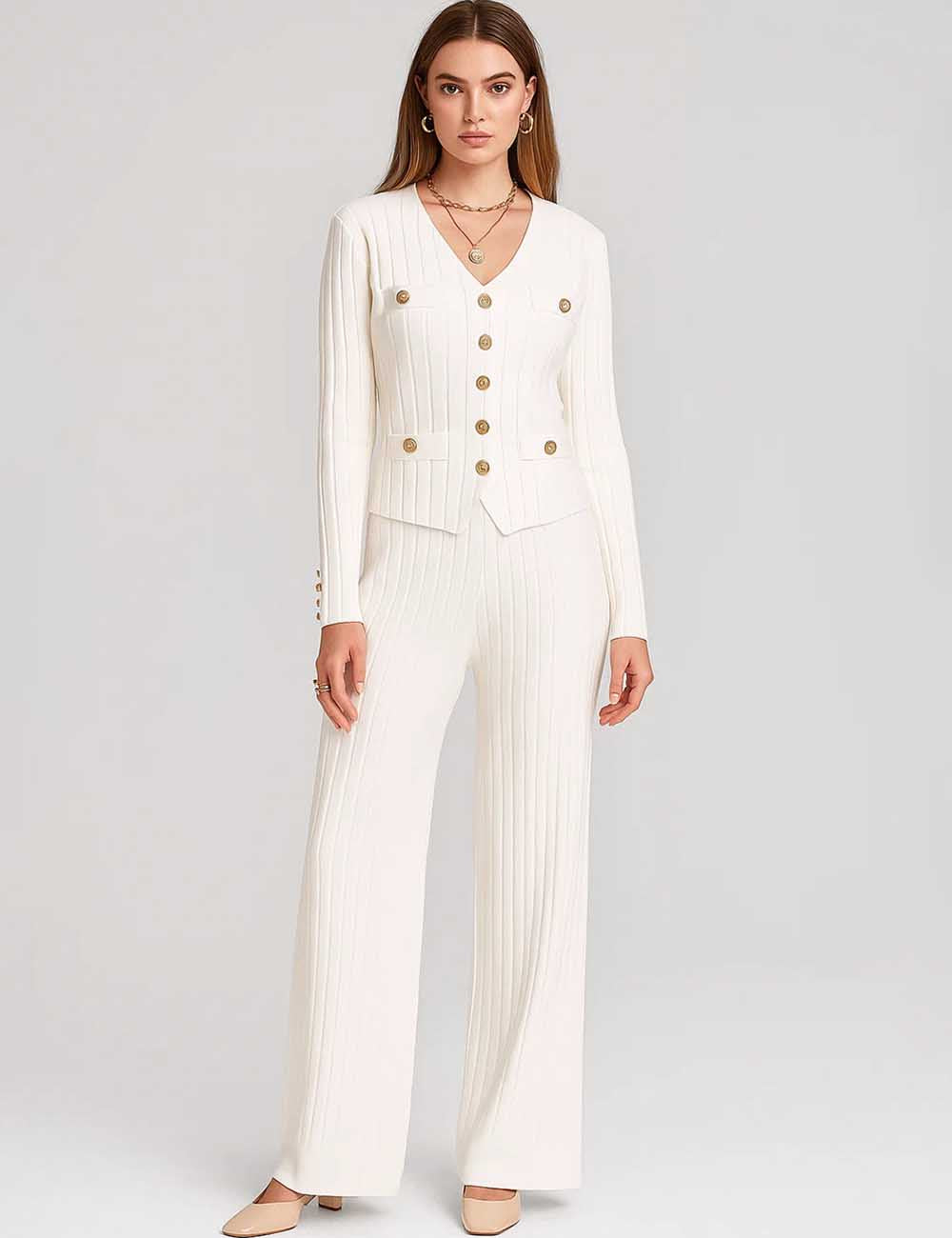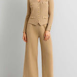 Ladies V-Neck Ribbed Knit 3PCS Cardigan & Pants Set