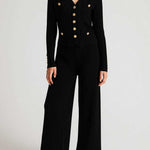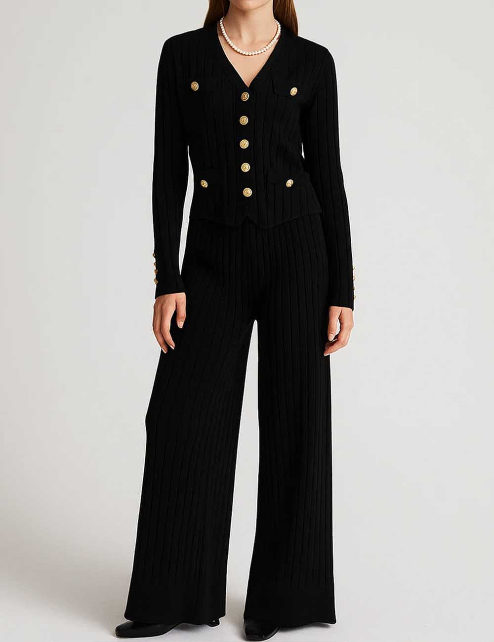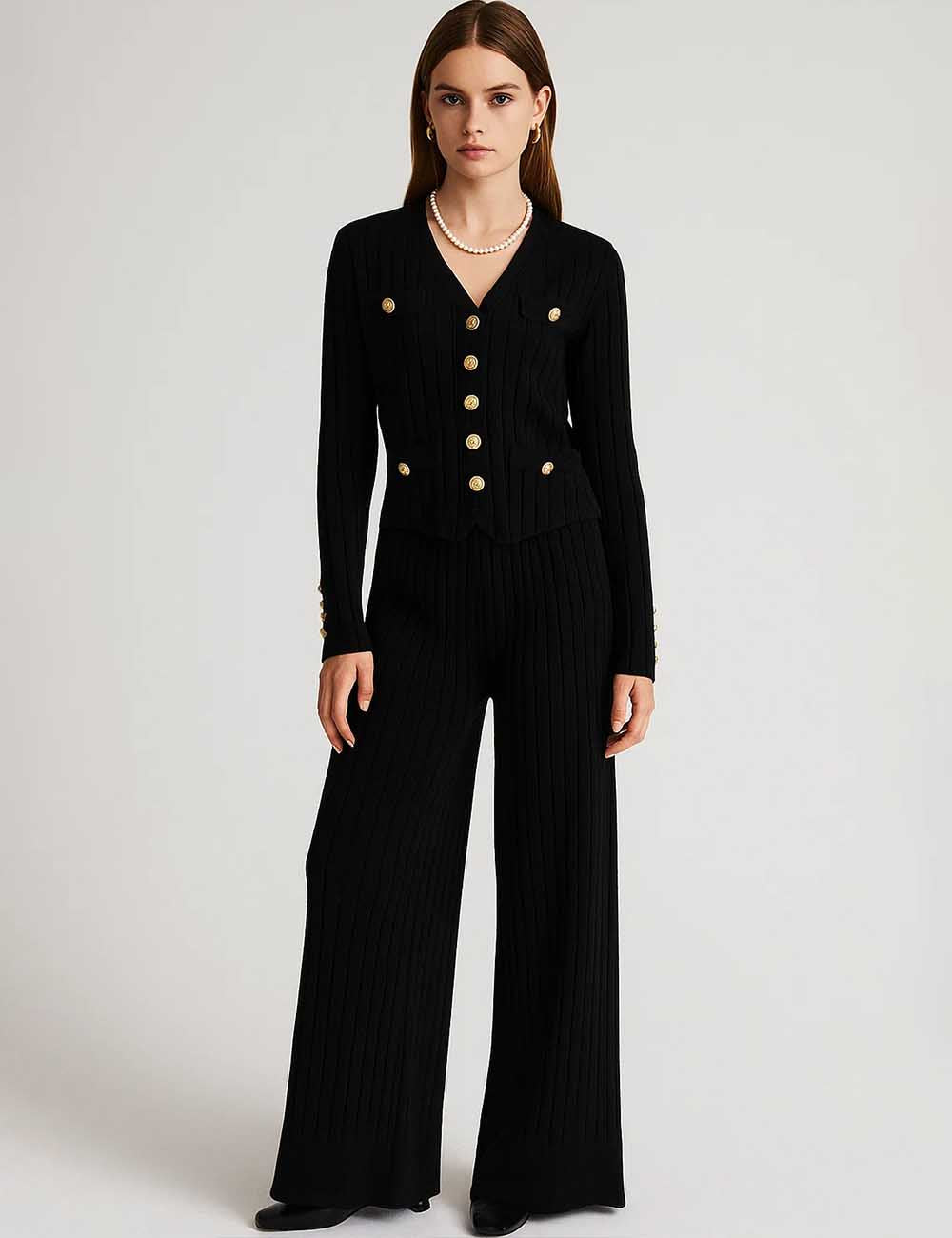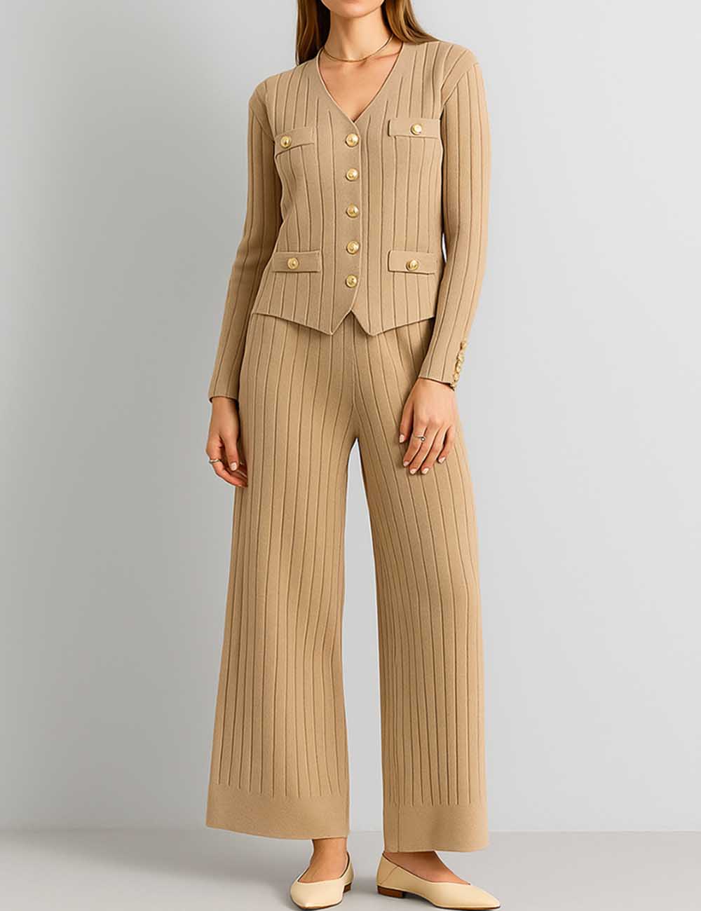 Ladies V-Neck Ribbed Knit 3PCS Cardigan & Pants Set