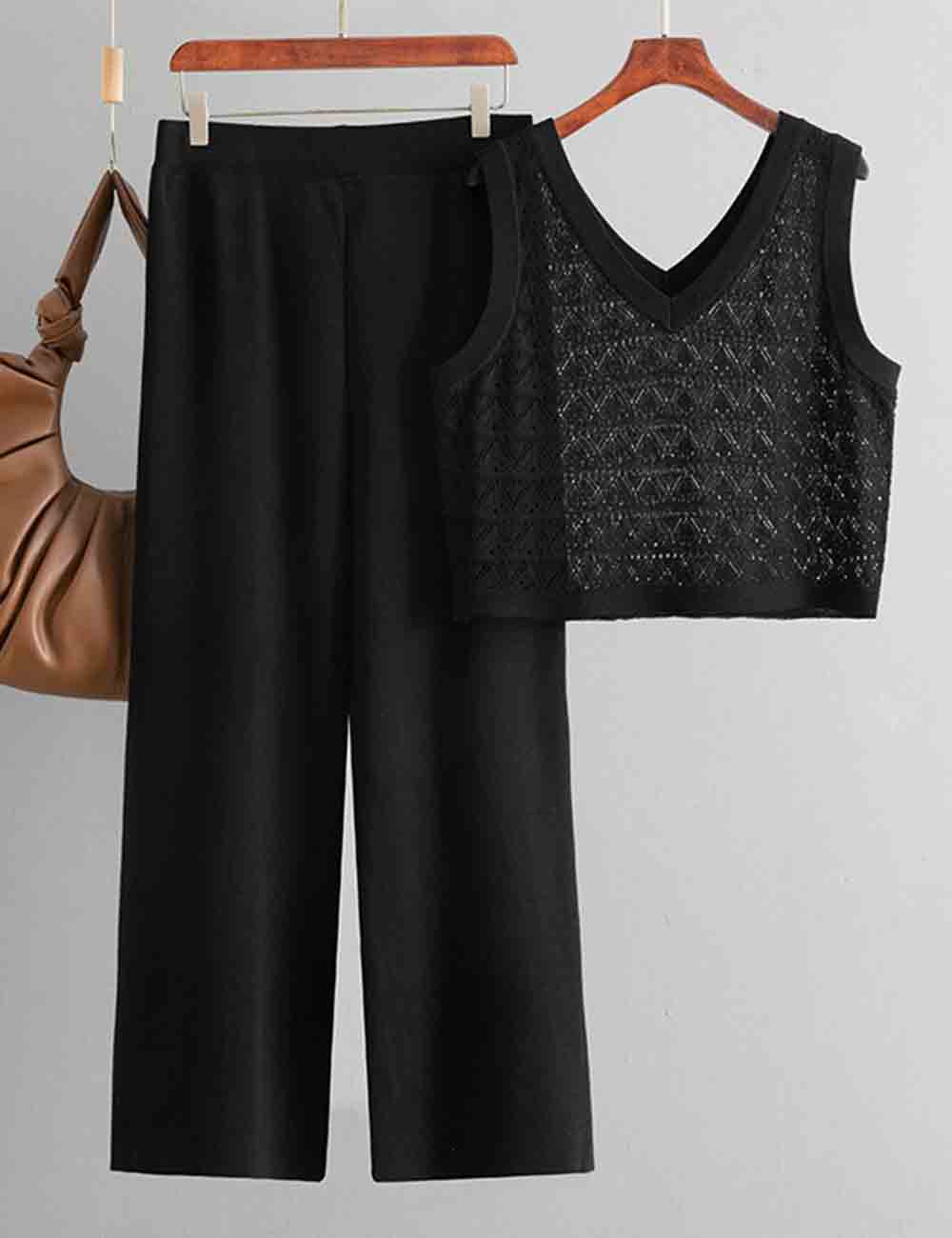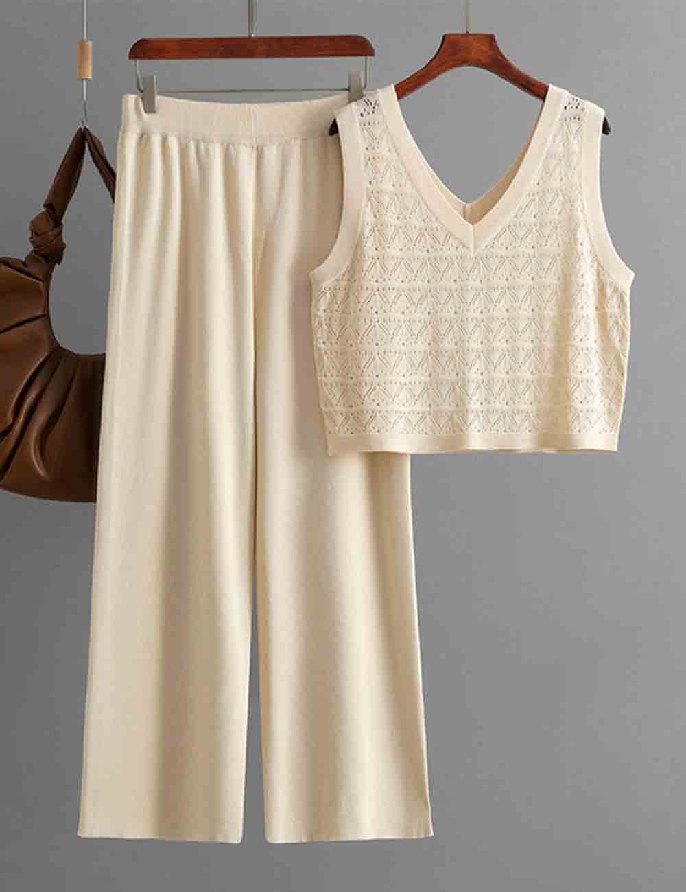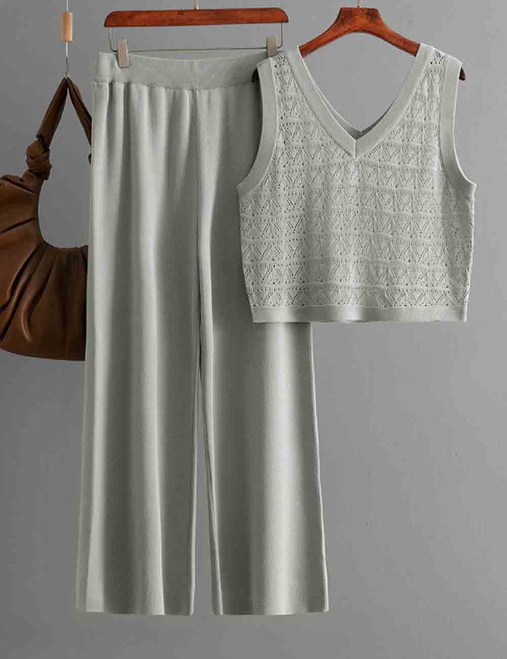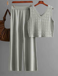 Ladies V-Neck Solid Color Hollow Out Knit Vest & Pants Set