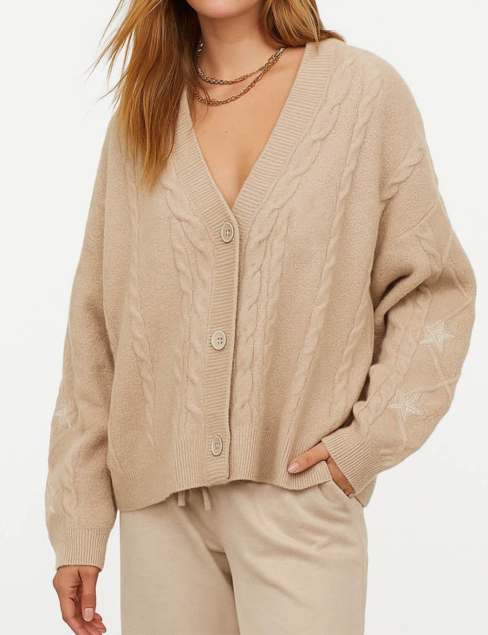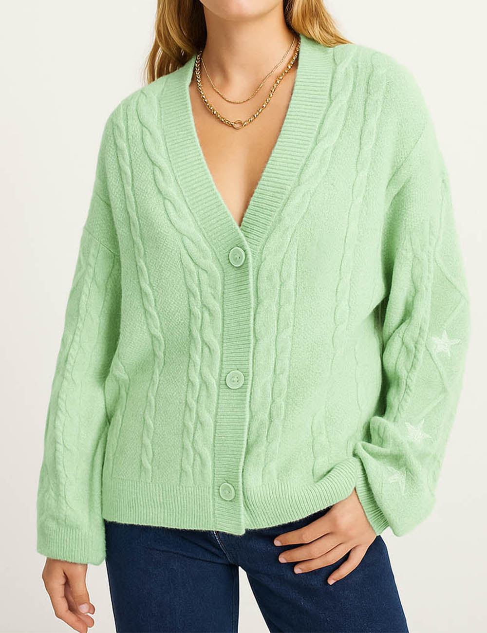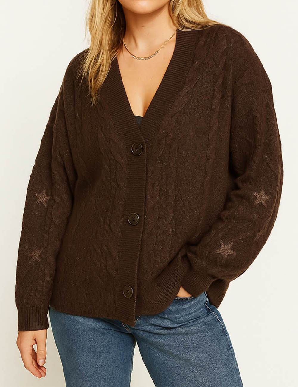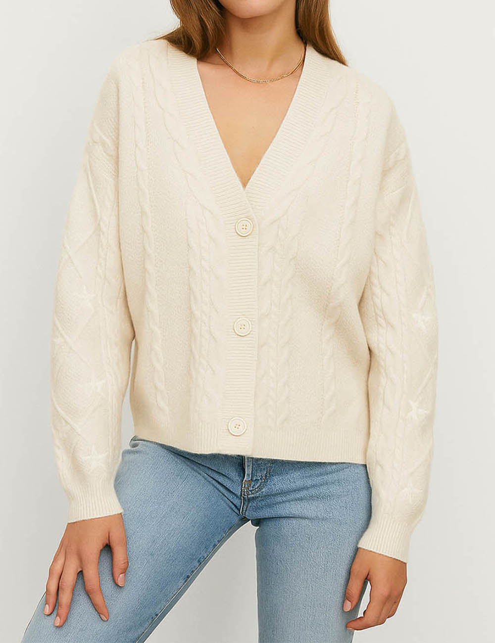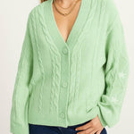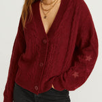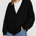 Ladies V-Neck Star Embroidery Button Front Knit Cardigan