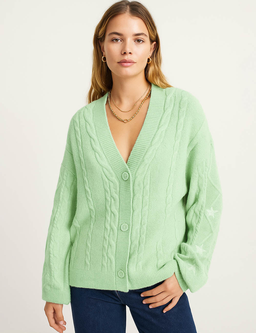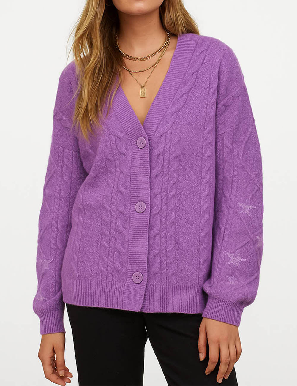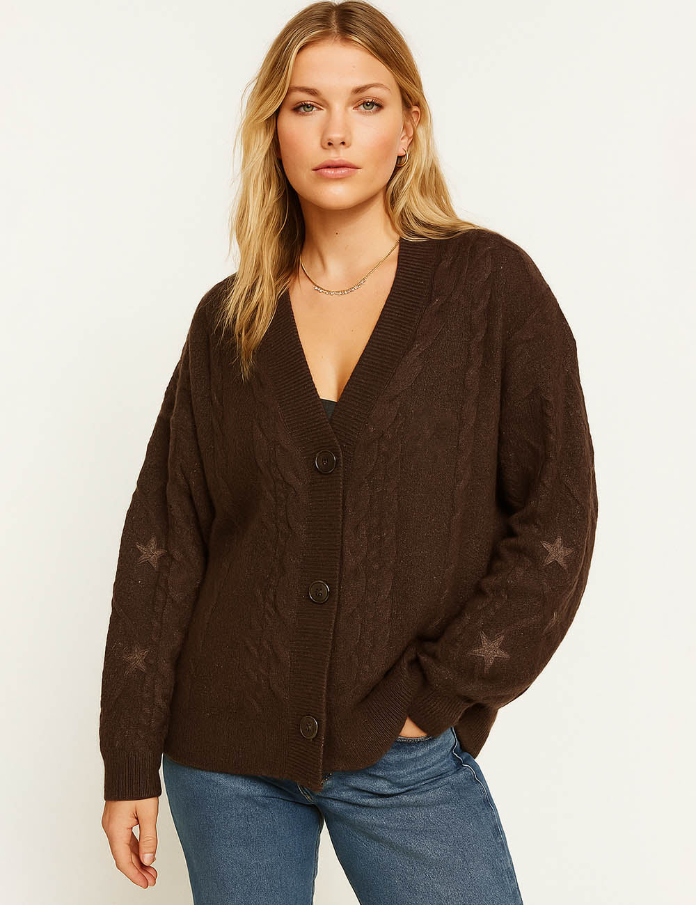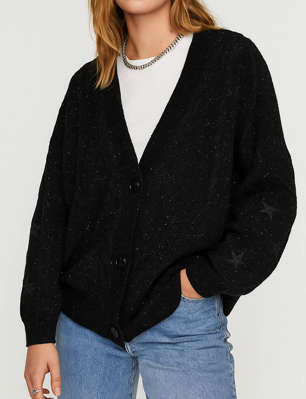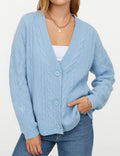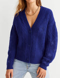 Ladies V-Neck Star Embroidery Button Front Knit Cardigan