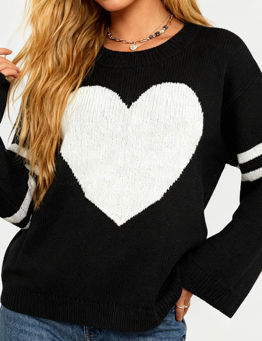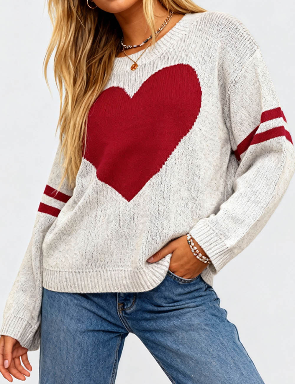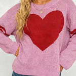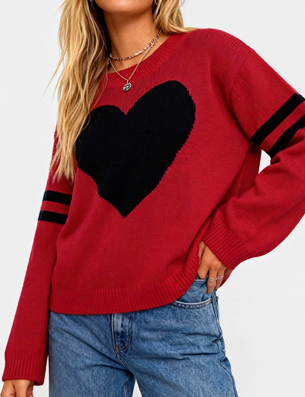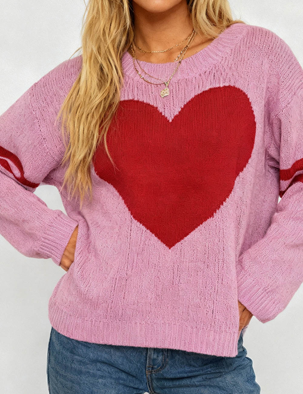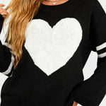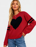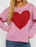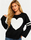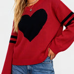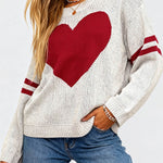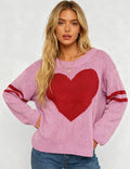 Ladies Valentine‘s Heart Pattern Striped Sleeves Pullover Sweater