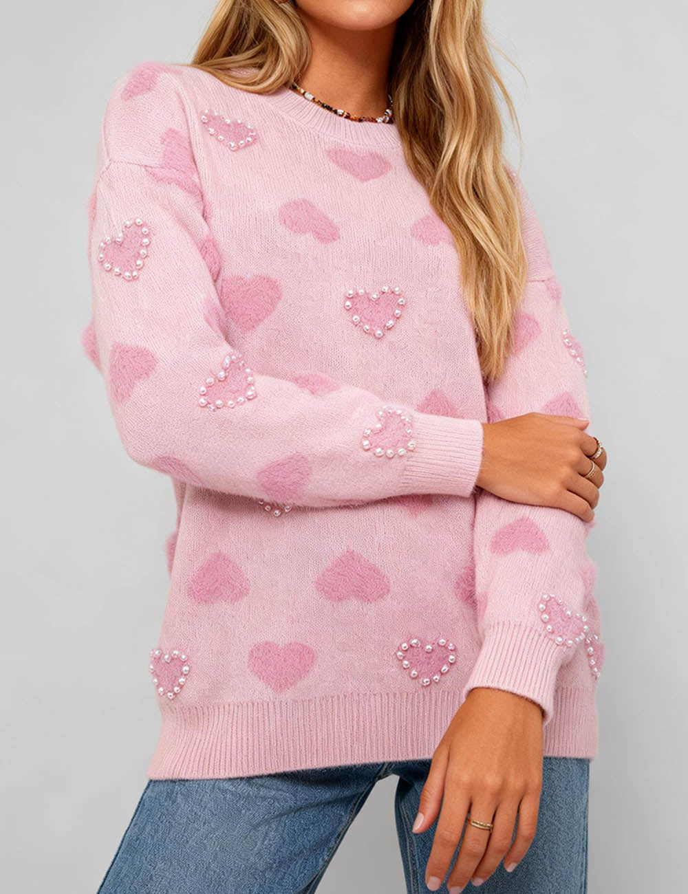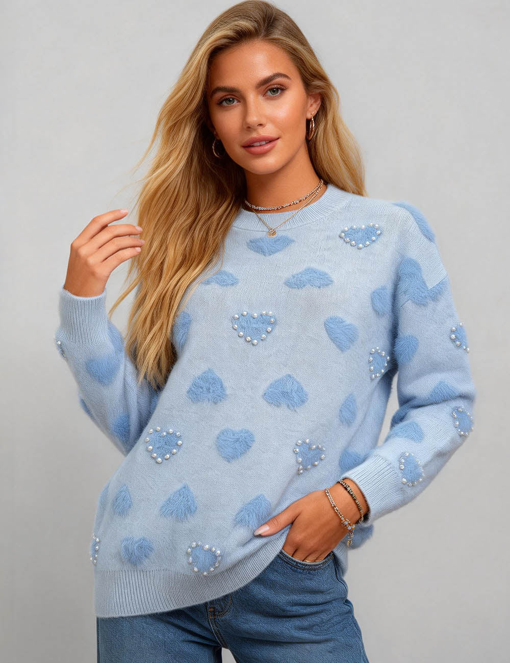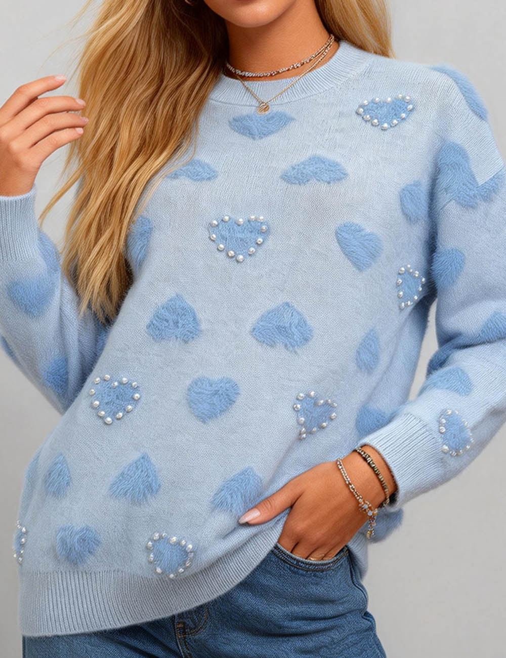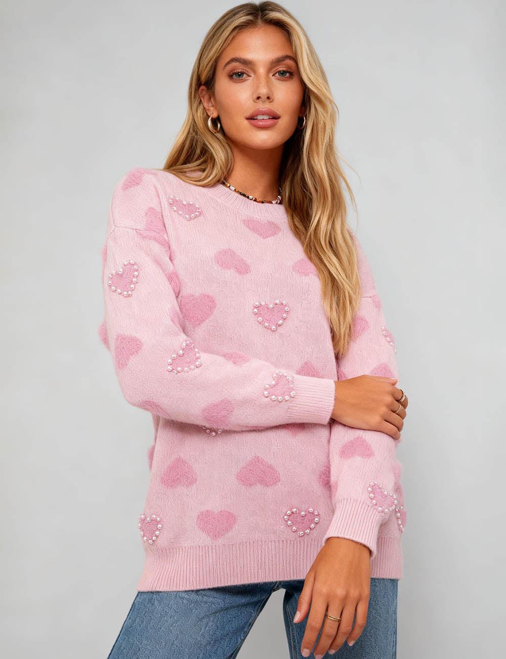 Ladies Valentine's Heart Pattern Round Neck Bead Sweater