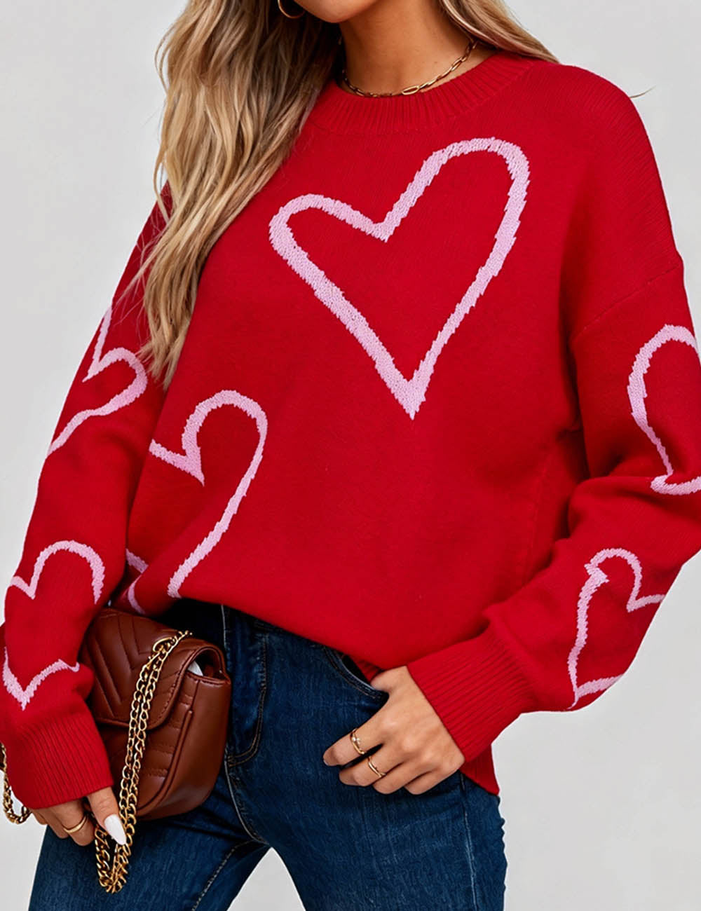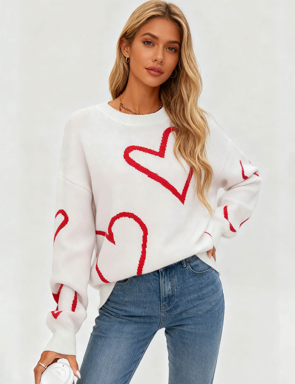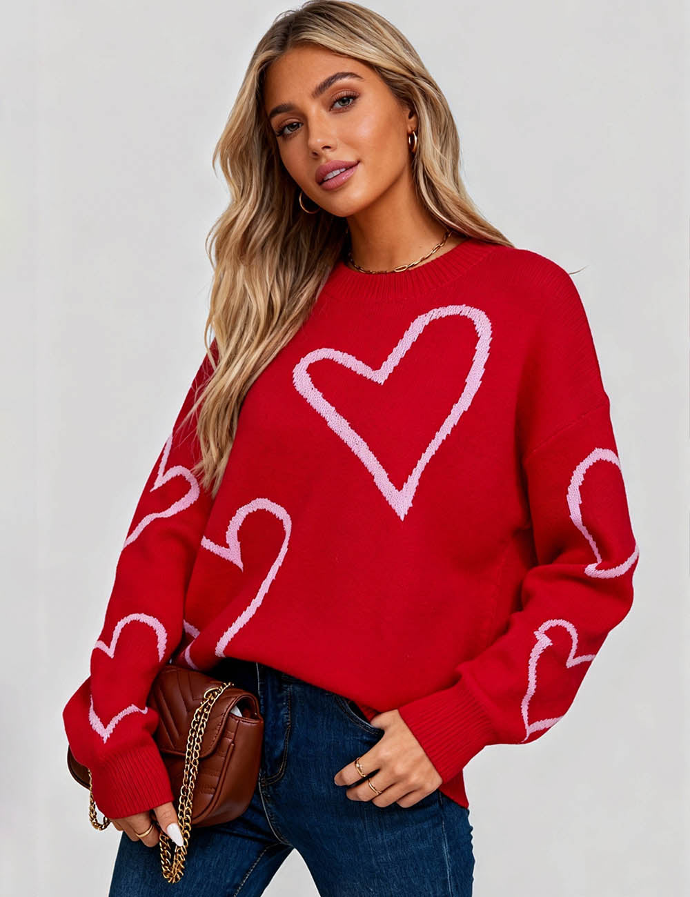 Ladies Valentine's Heart Pattern Round Neck Long Sleeves Sweater