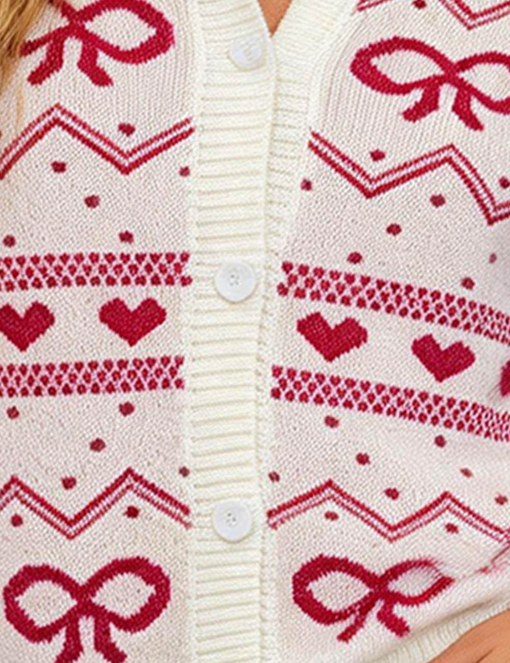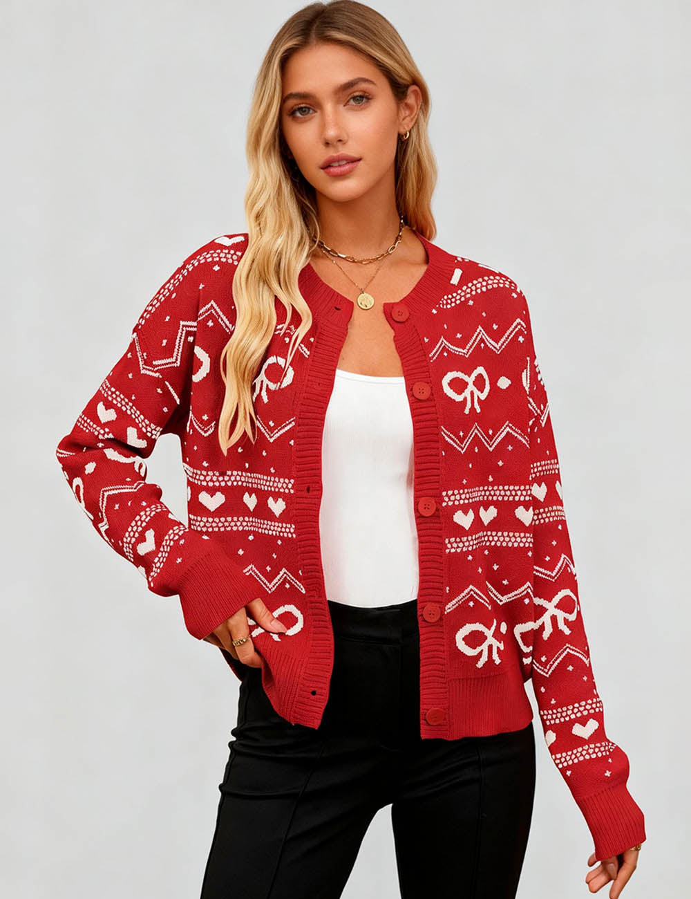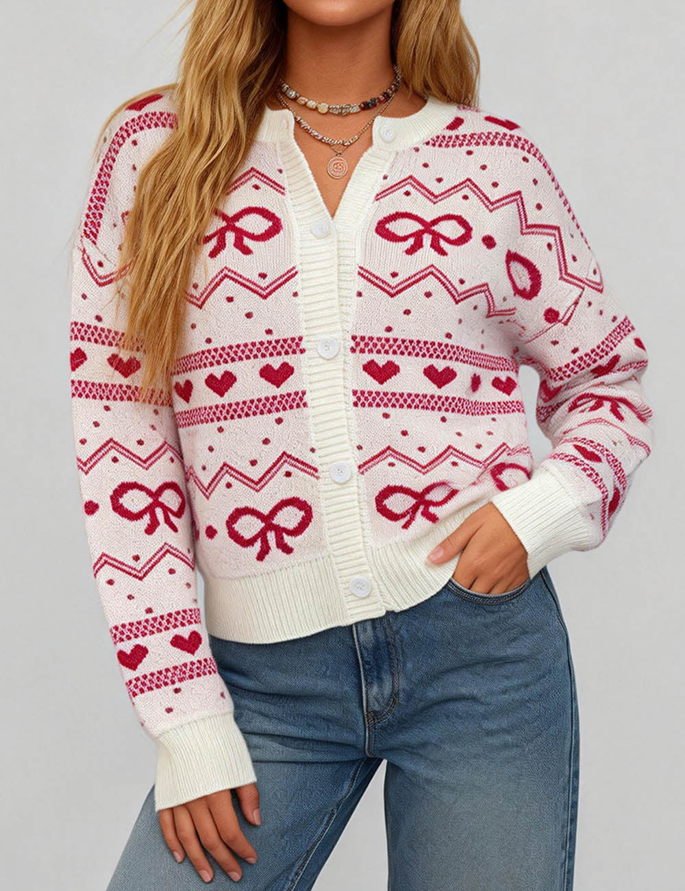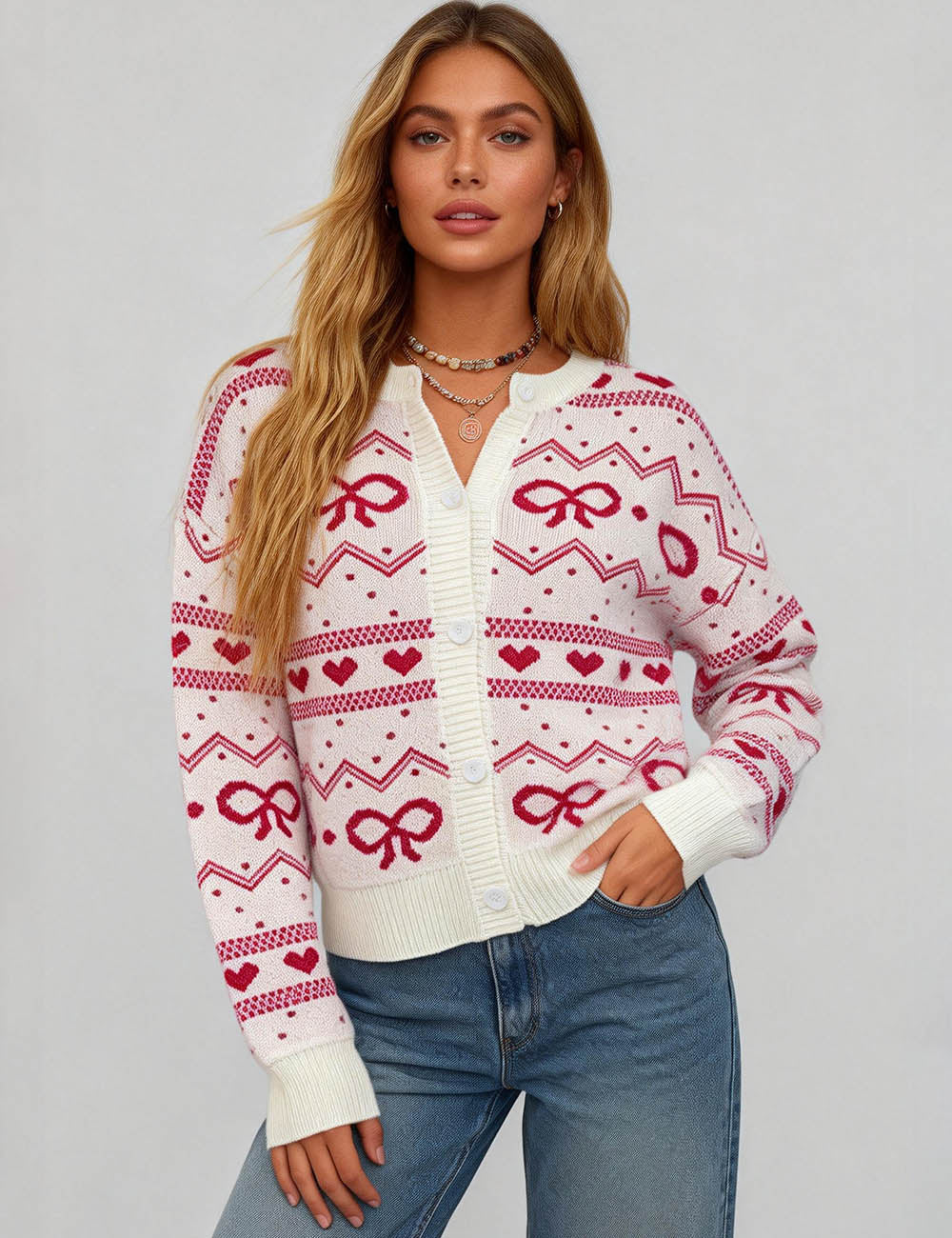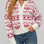 Ladies Valentine's Round Neck Button Heart Sweater Cardigan