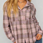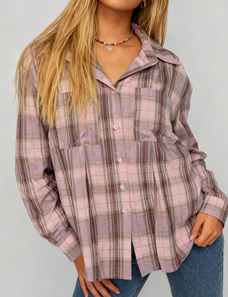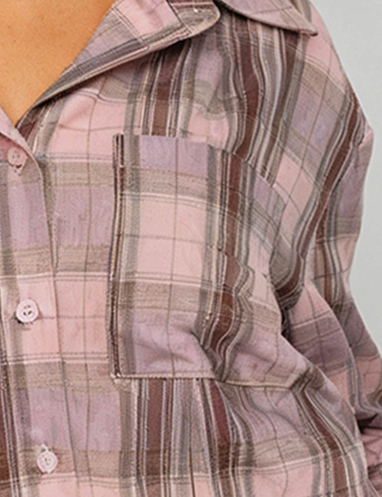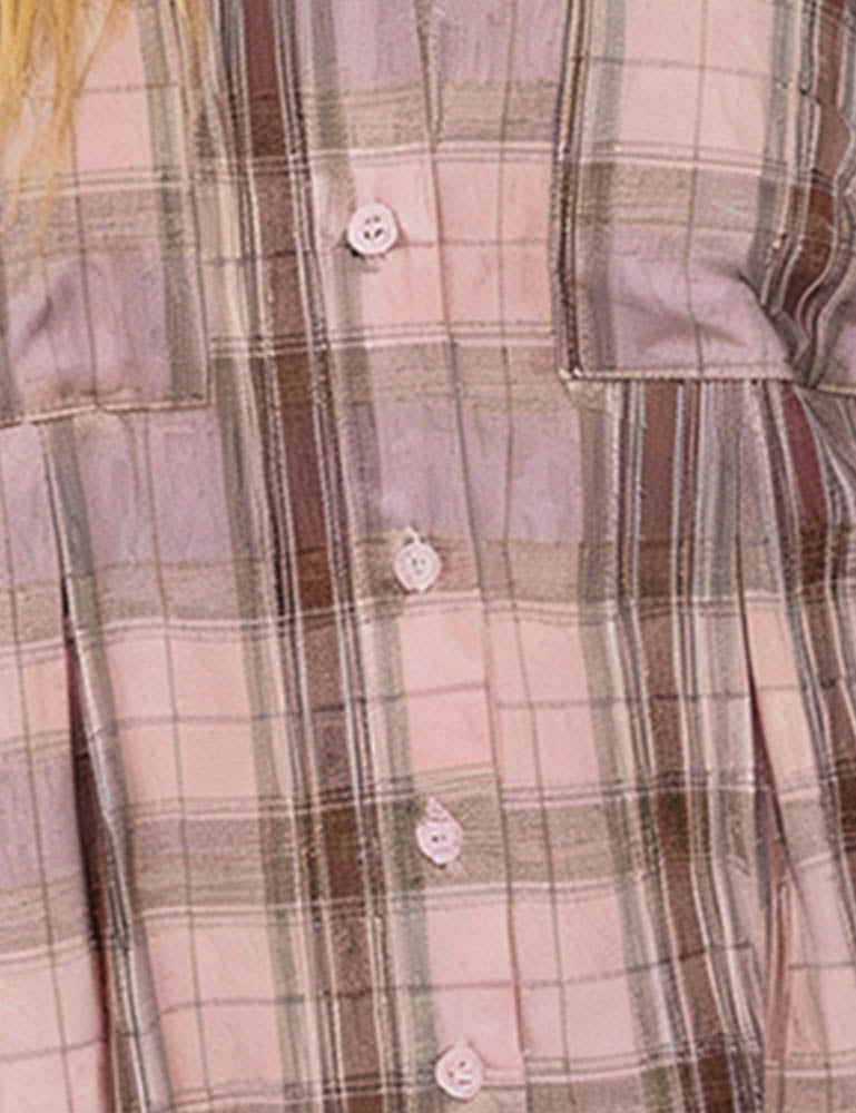 Ladies Vintage Checked Turn Down Collar Long Sleeves Shirt