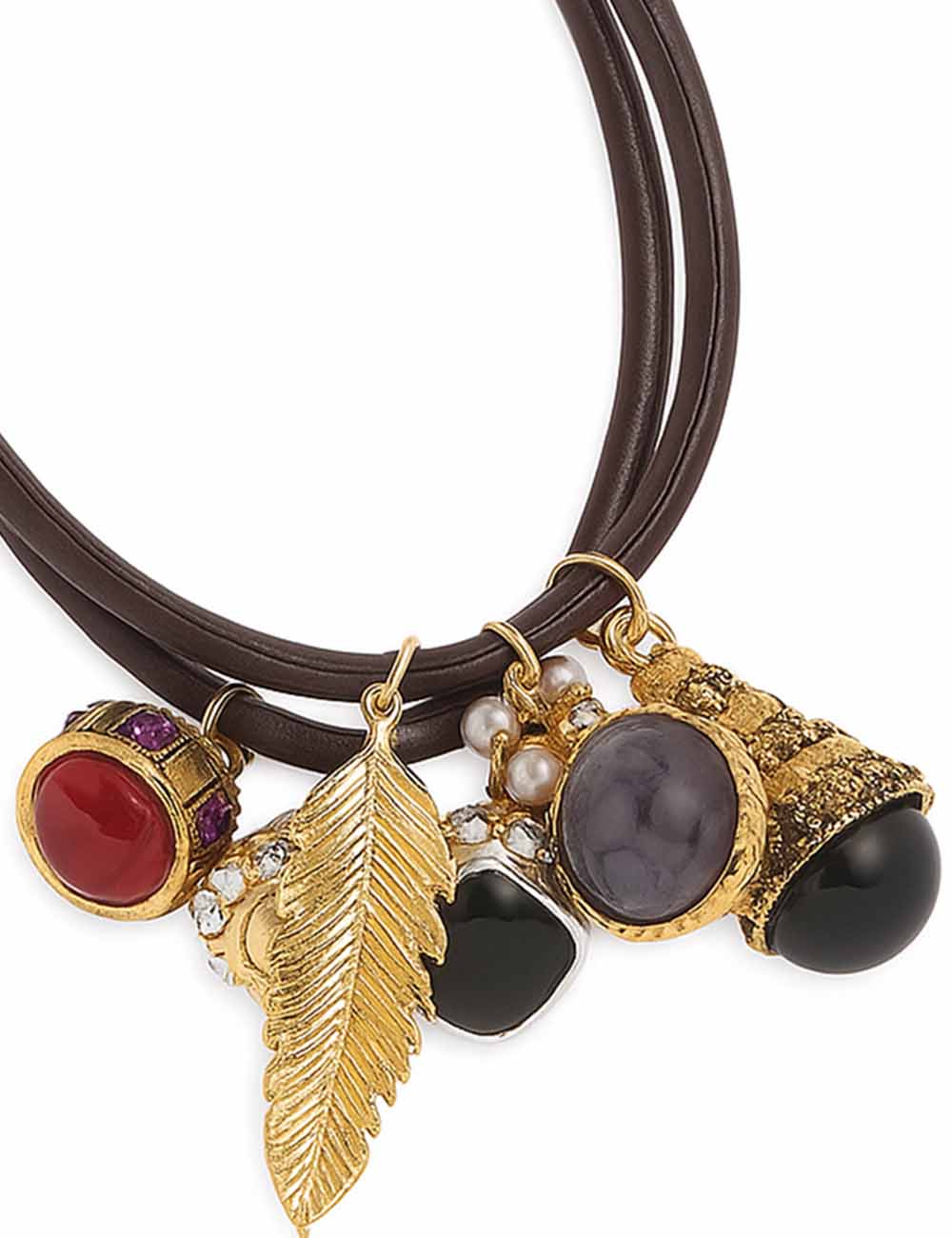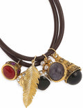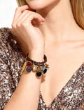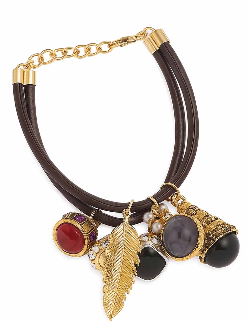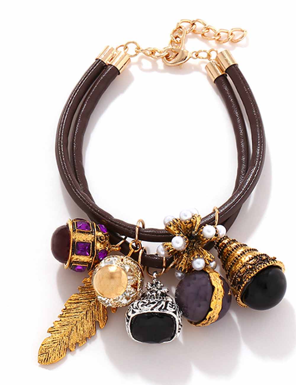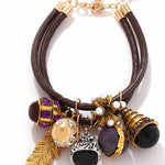 Ladies Vintage Golden Leaf Gemstone Pendant Leather Bracelet