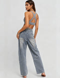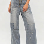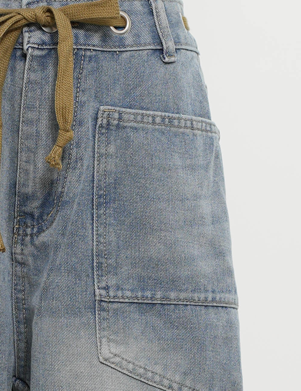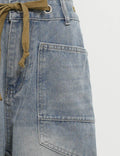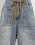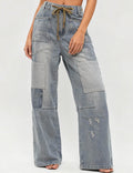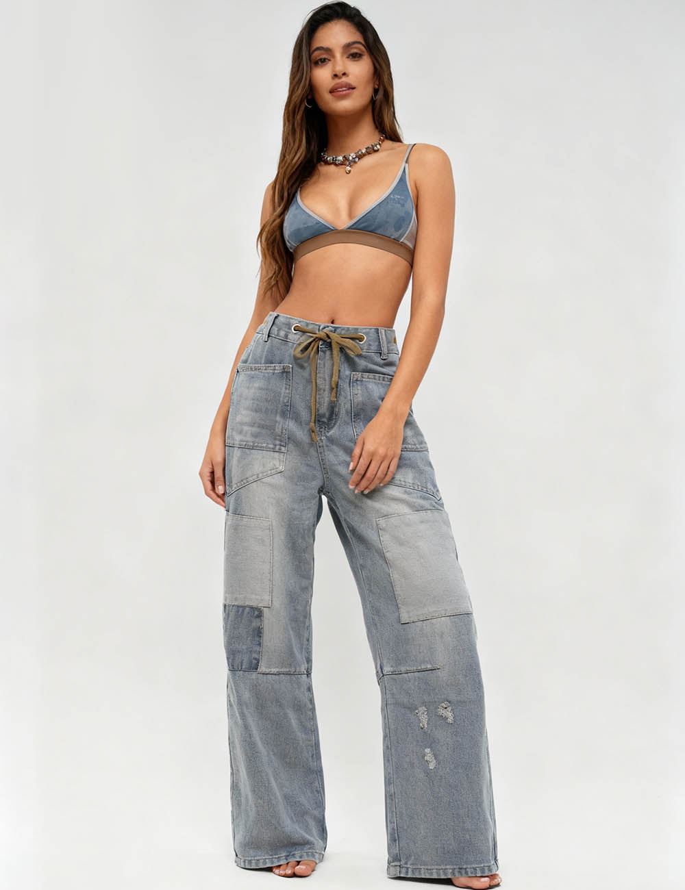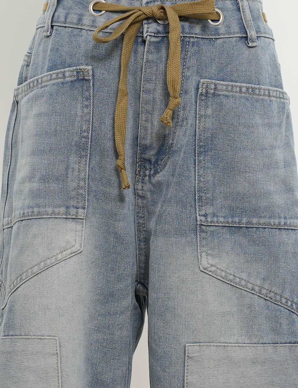 Ladies Vintage Patchwork Drawstring Wide Leg Denim Pants