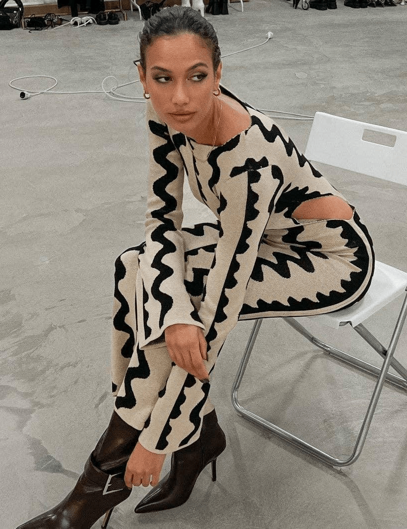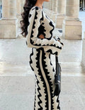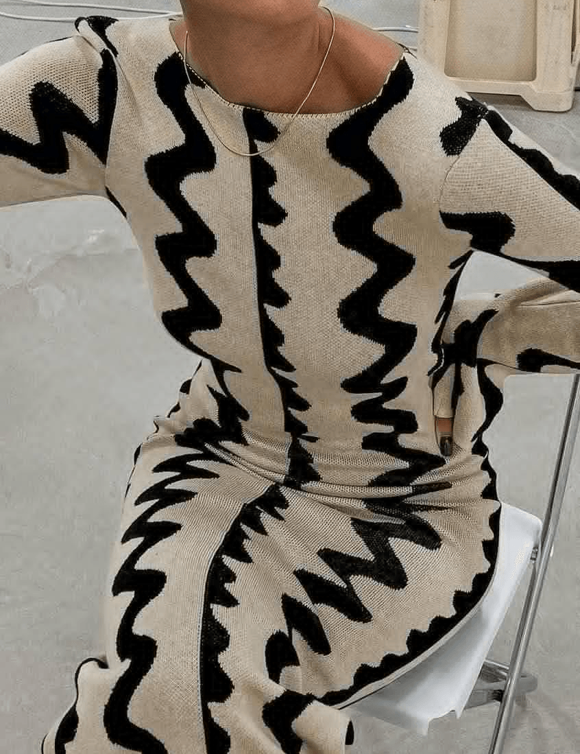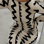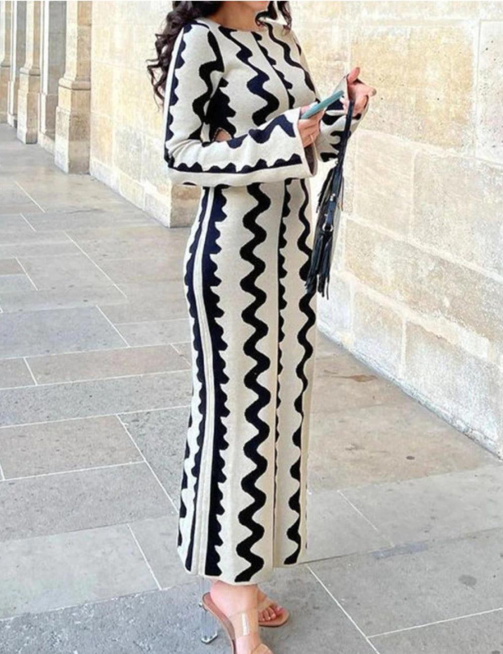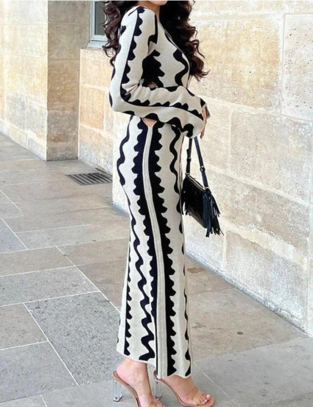 Ladies Waist Hallow Out Color Block Wavy Knit Midi Dress SKD4968
