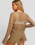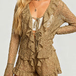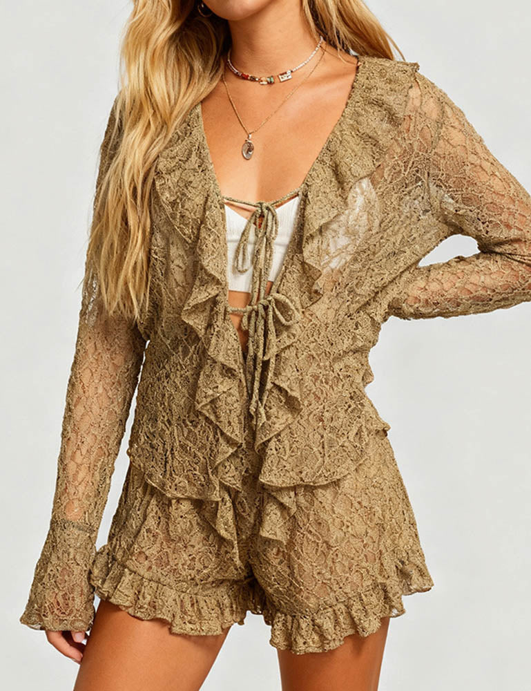 Ladies Wrinkle Sheer Lace Ruffle Tie Blouse & Shorts Set