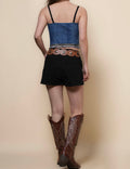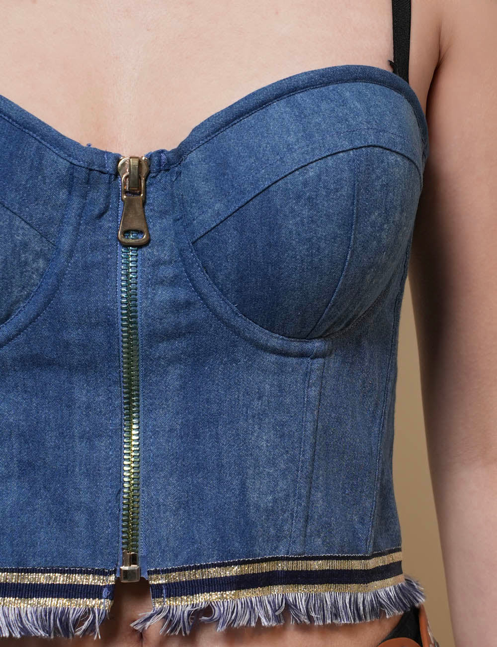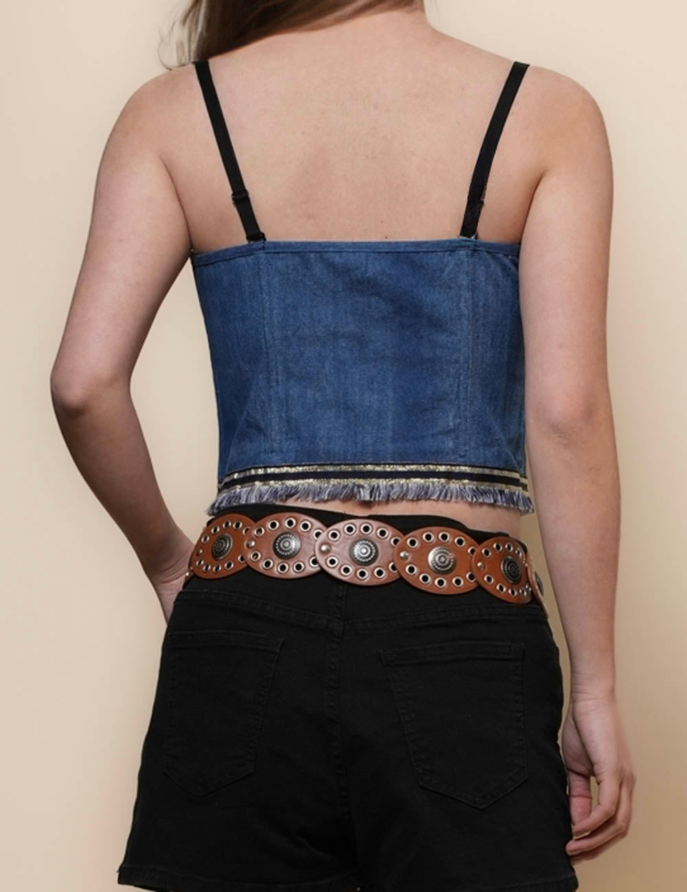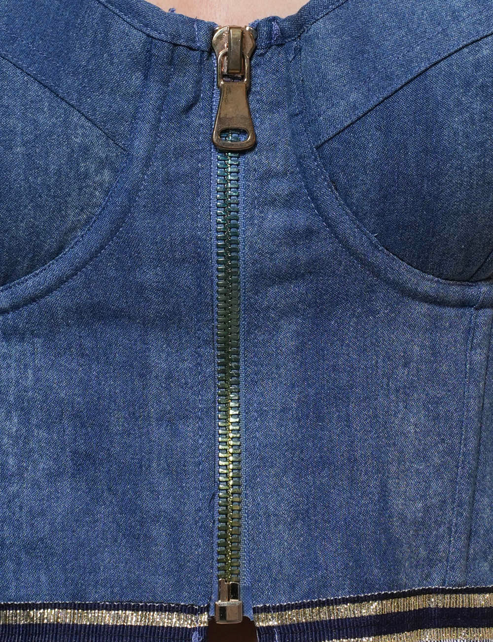 Ladies Zipper Front String Shoulder Basic Denim Top SKT50115