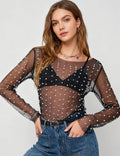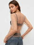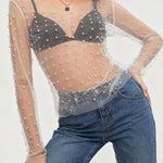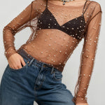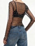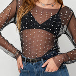 SWEETKAMA Pearl Rhinestone Studded See Through Mesh Blouse SKT1976